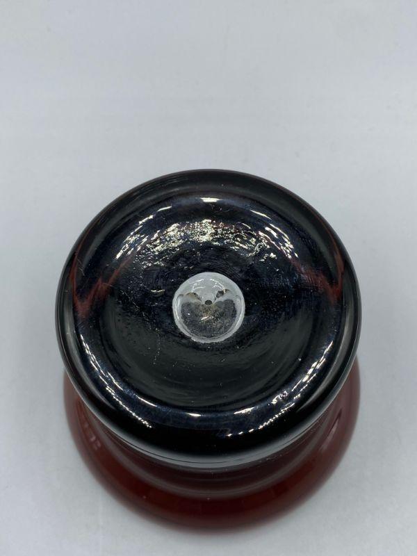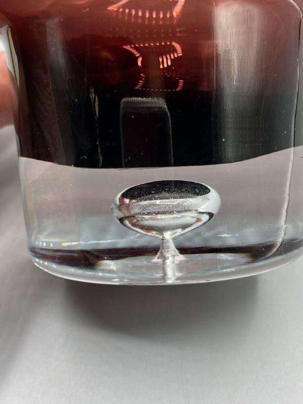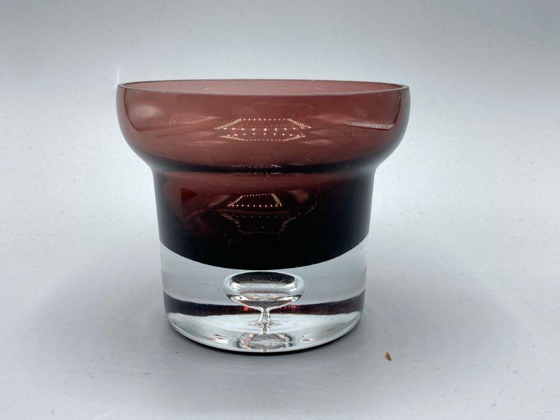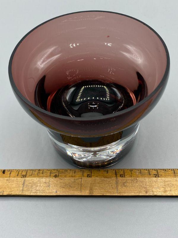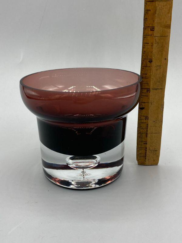 Art glass candle holder dish. Deep violet red glass with a heavy clear bottom. A single bubble blown into the center of bottom. Stands about 3.5". Use as a candle holder or as a small art glass piece. Good condition.