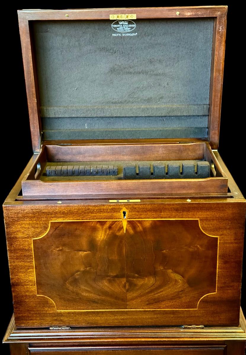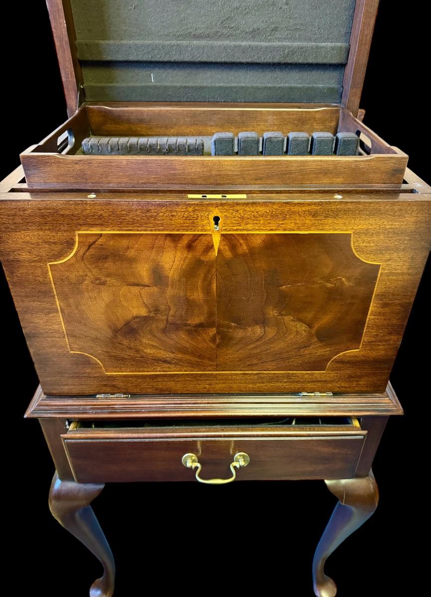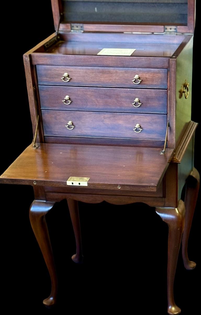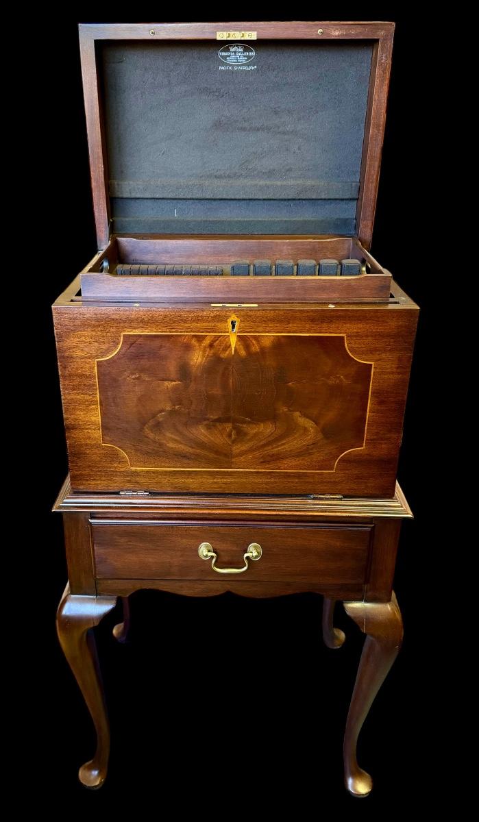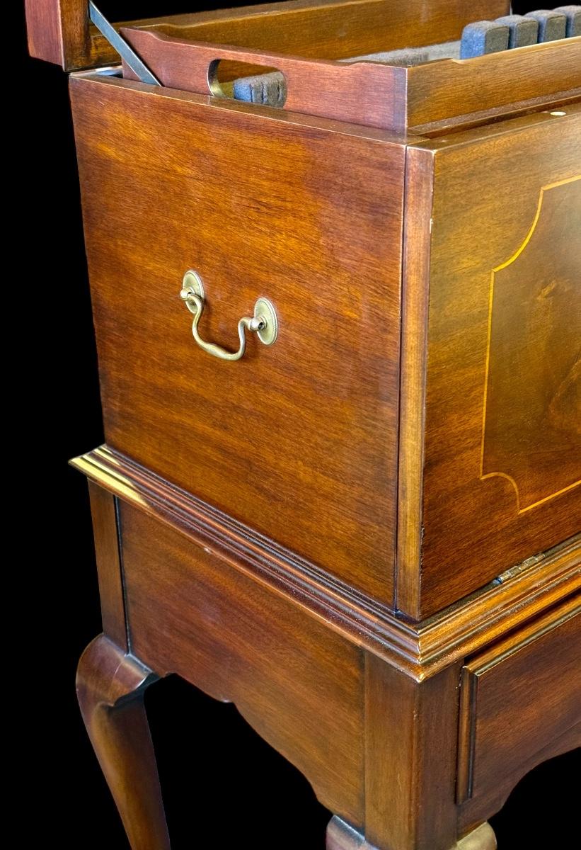 Virginia Galleries Furniture by Henkel Harris~ This adaptation of the Philadelphia late 18th century tea chest on a frame has been increased in size and fitted for silver storage. The beautiful Queen Anne lines and handsome veneer face has been retained true to the original. Inlaid stringing and decorative work around key hole. Dovetailed drawer, lift top and drop front revealing 3 drawers and removeable tray. All compartments lined with pacific cloth. No key.