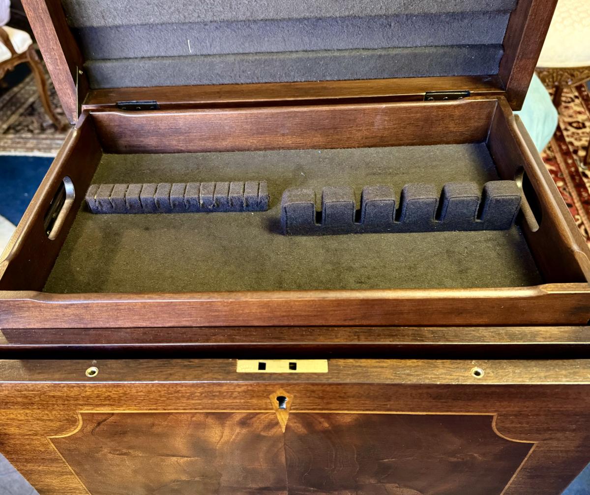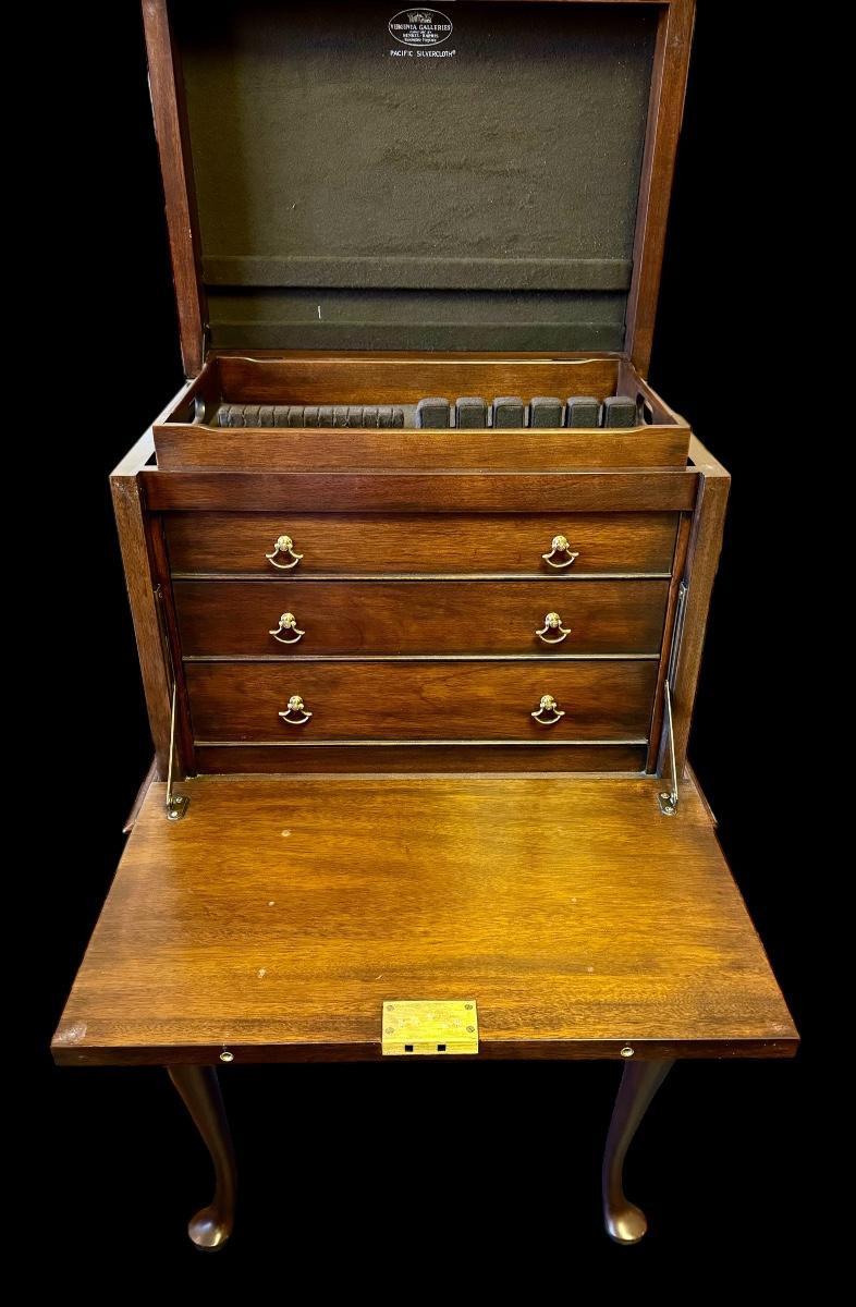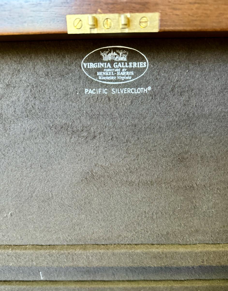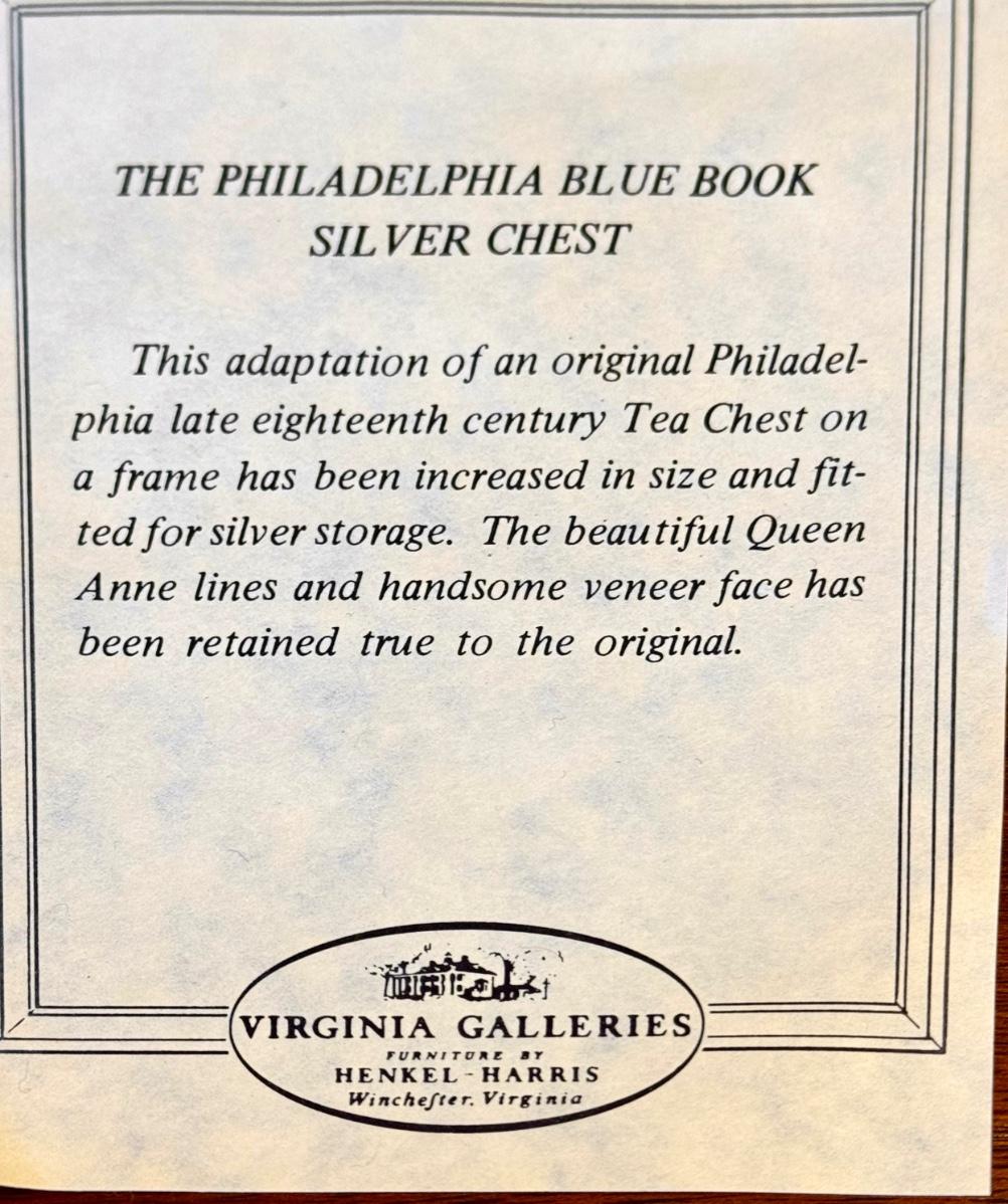 Virginia Galleries Furniture by Henkel Harris~ This adaptation of the Philadelphia late 18th century tea chest on a frame has been increased in size and fitted for silver storage. The beautiful Queen Anne lines and handsome veneer face has been retained true to the original. Inlaid stringing and decorative work around key hole. Dovetailed drawer, lift top and drop front revealing 3 drawers and removeable tray. All compartments lined with pacific cloth. No key.