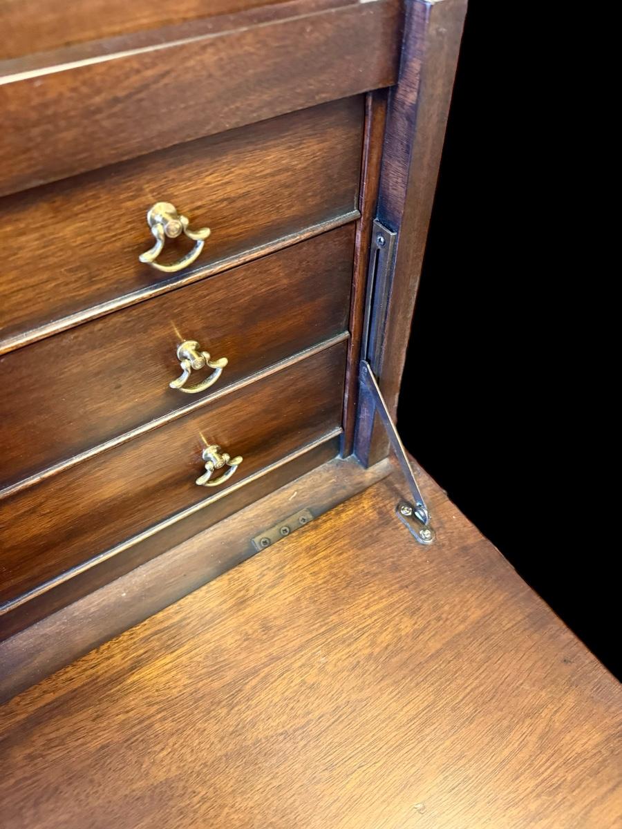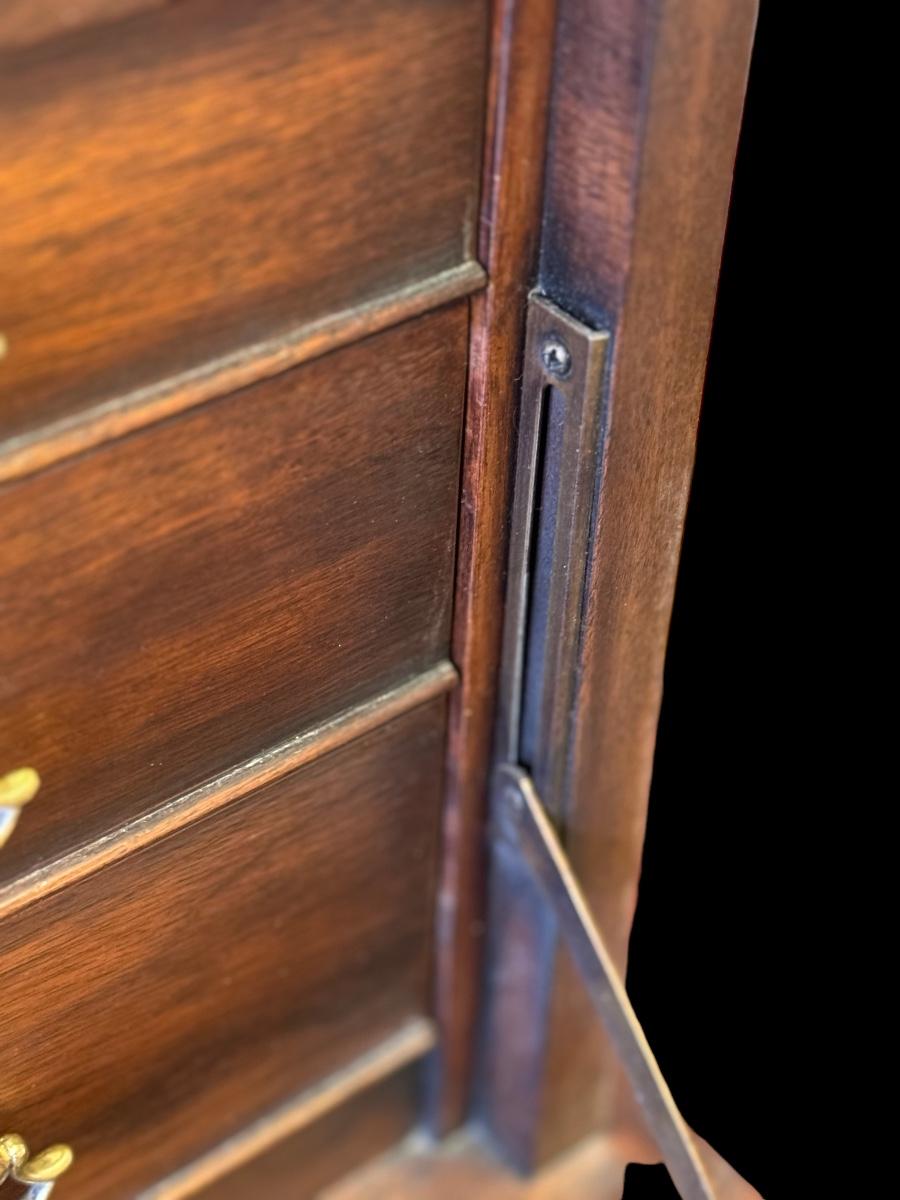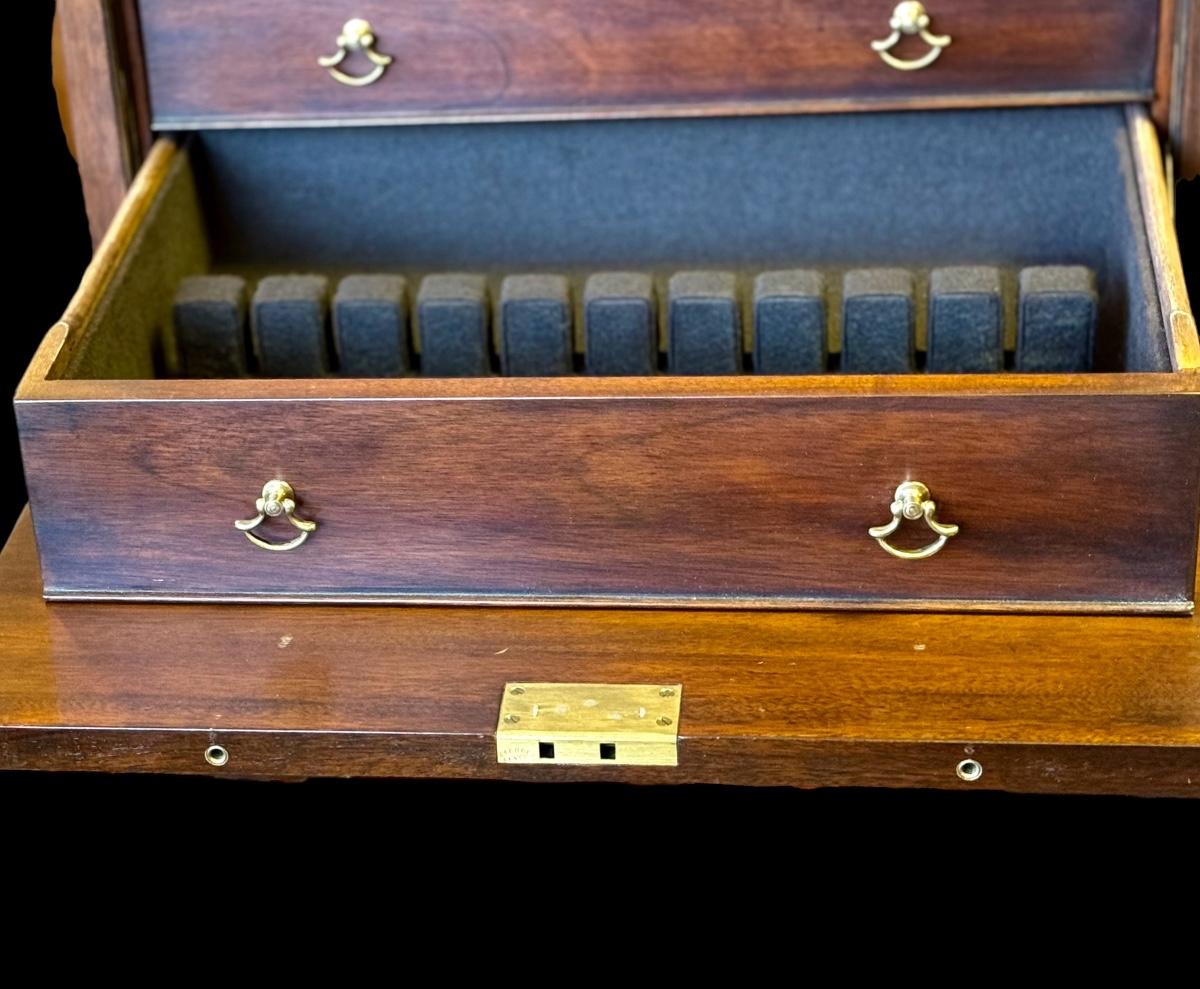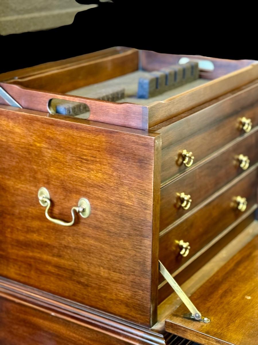 Virginia Galleries Furniture by Henkel Harris~ This adaptation of the Philadelphia late 18th century tea chest on a frame has been increased in size and fitted for silver storage. The beautiful Queen Anne lines and handsome veneer face has been retained true to the original. Inlaid stringing and decorative work around key hole. Dovetailed drawer, lift top and drop front revealing 3 drawers and removeable tray. All compartments lined with pacific cloth. No key.