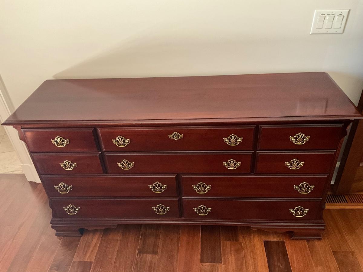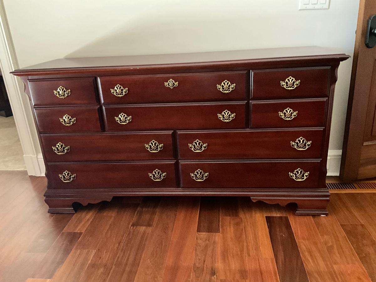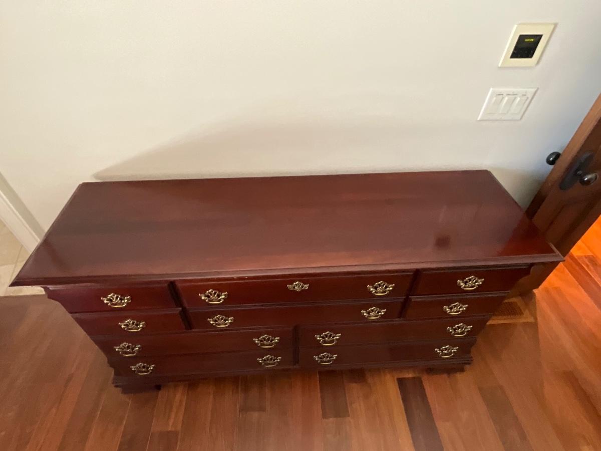 Virginia house dresser two or three small nicks. It is 19.5 inches deep 66 inches wide and 35 inches tall.
