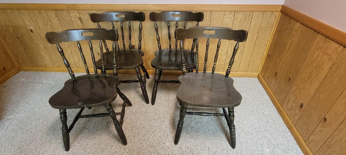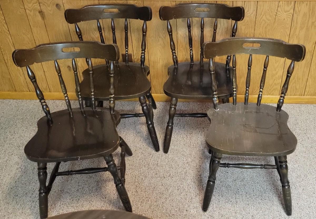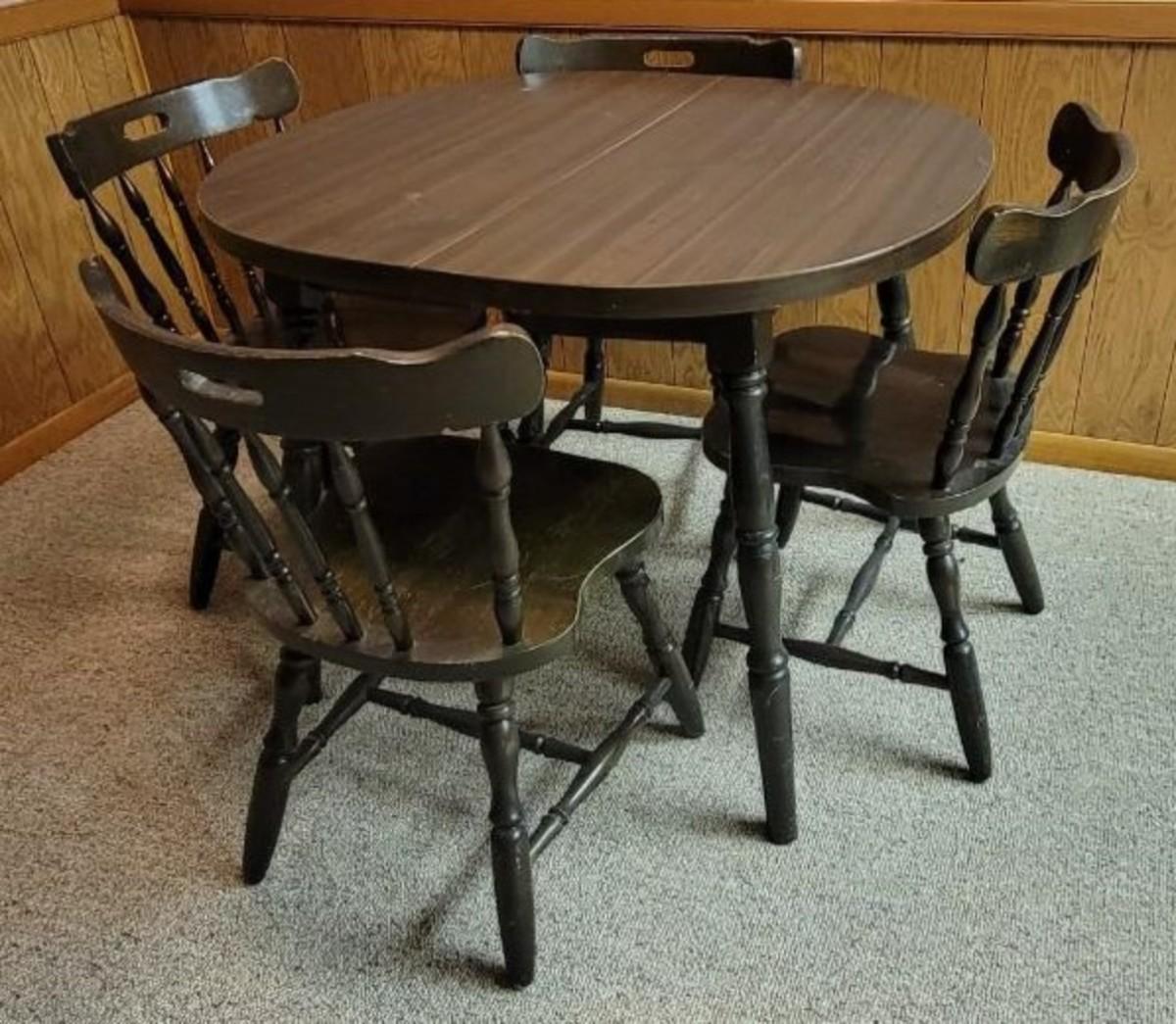 Laminated table top with a Little wear seen. Four matching chairs that are solid. Vintage set.