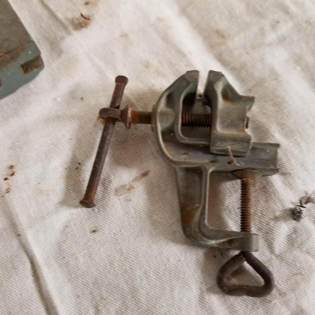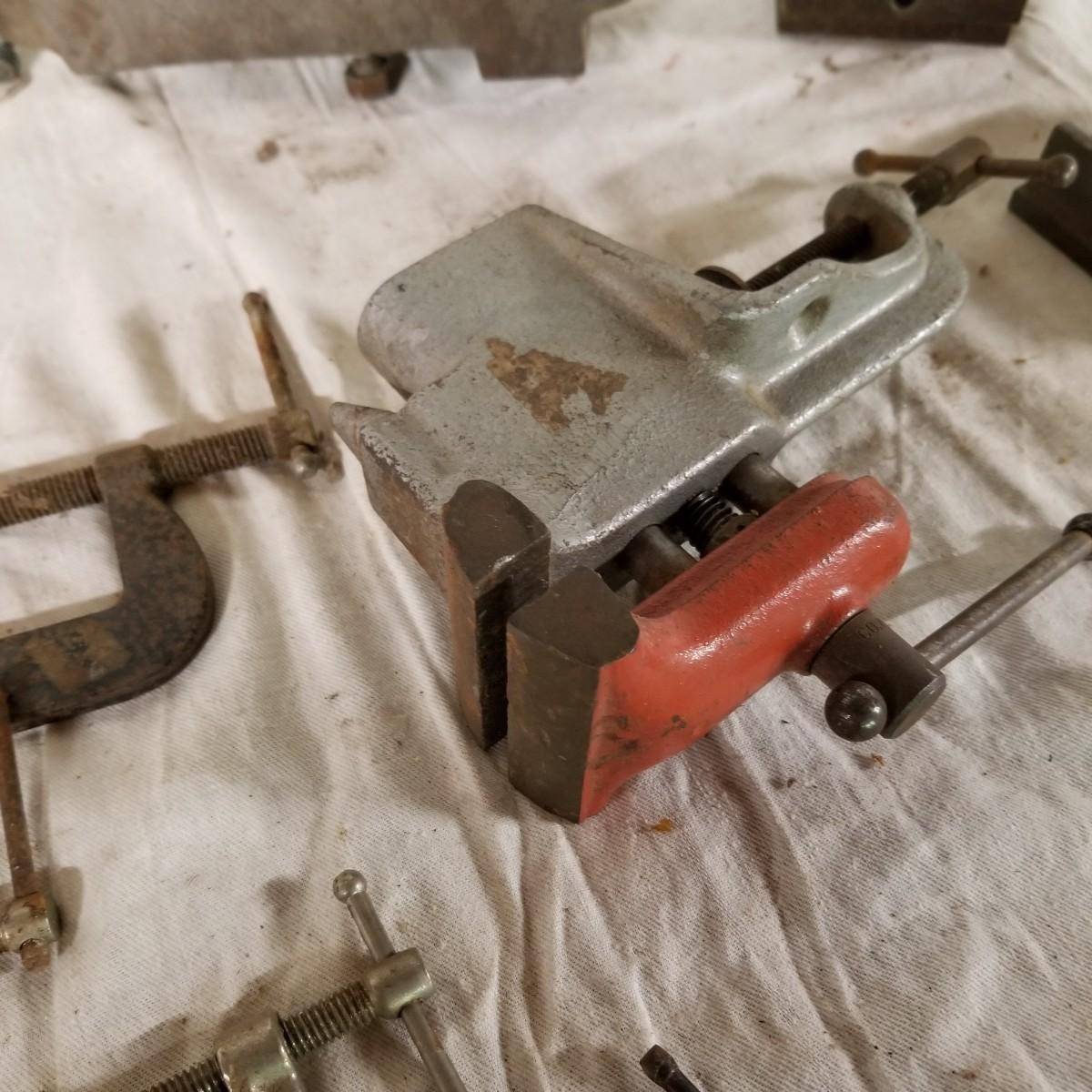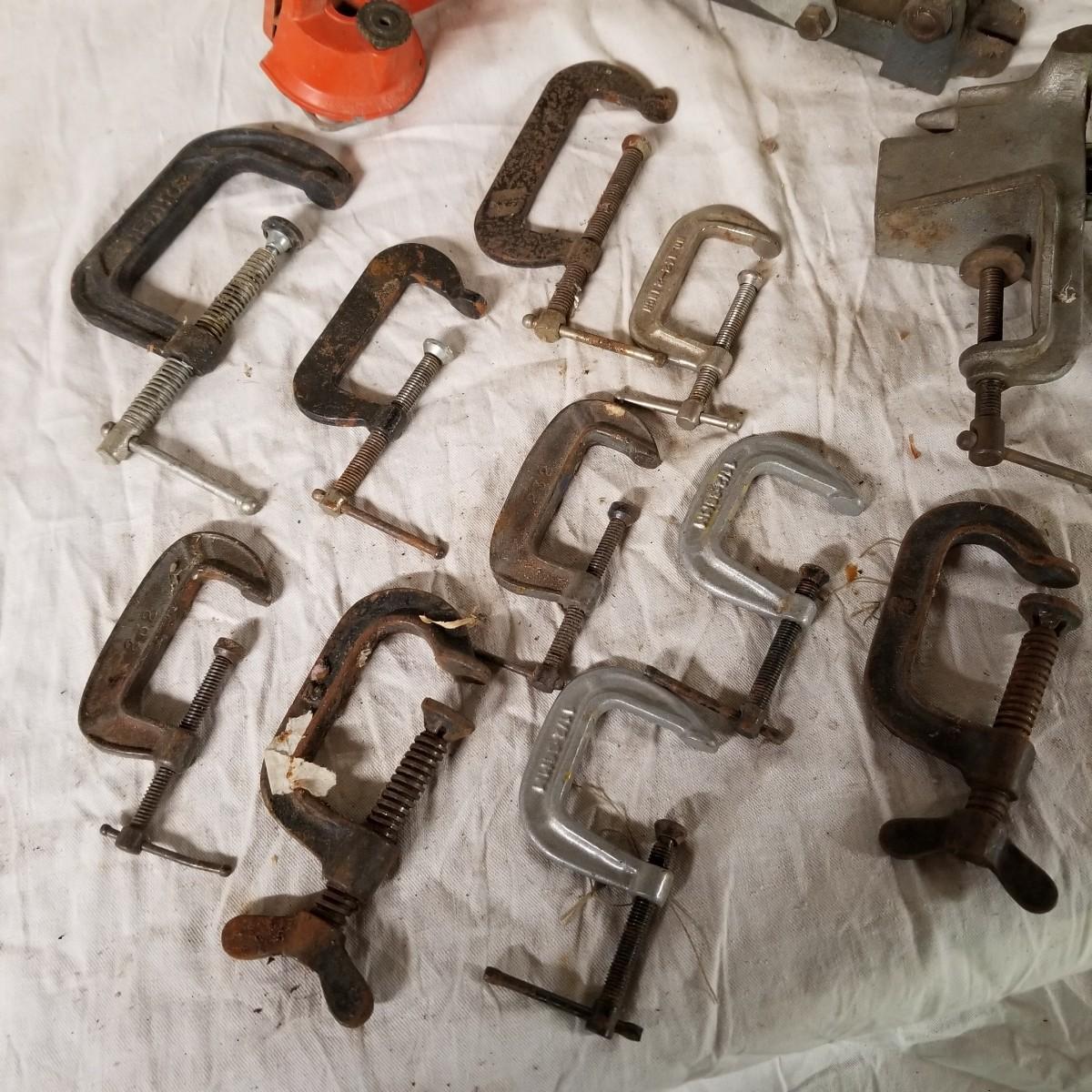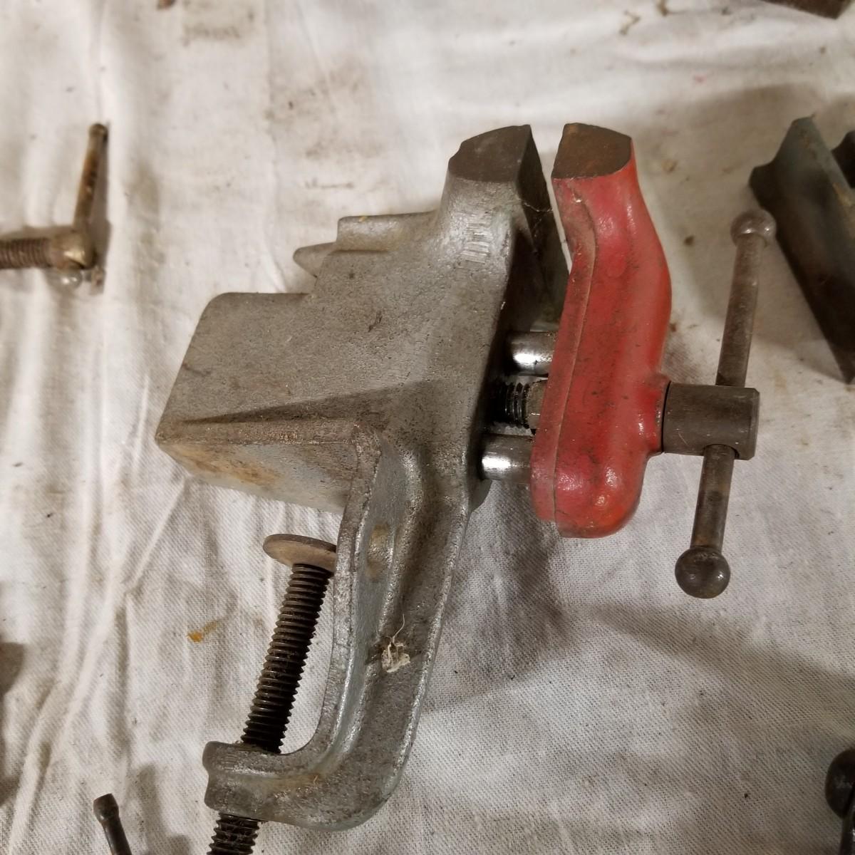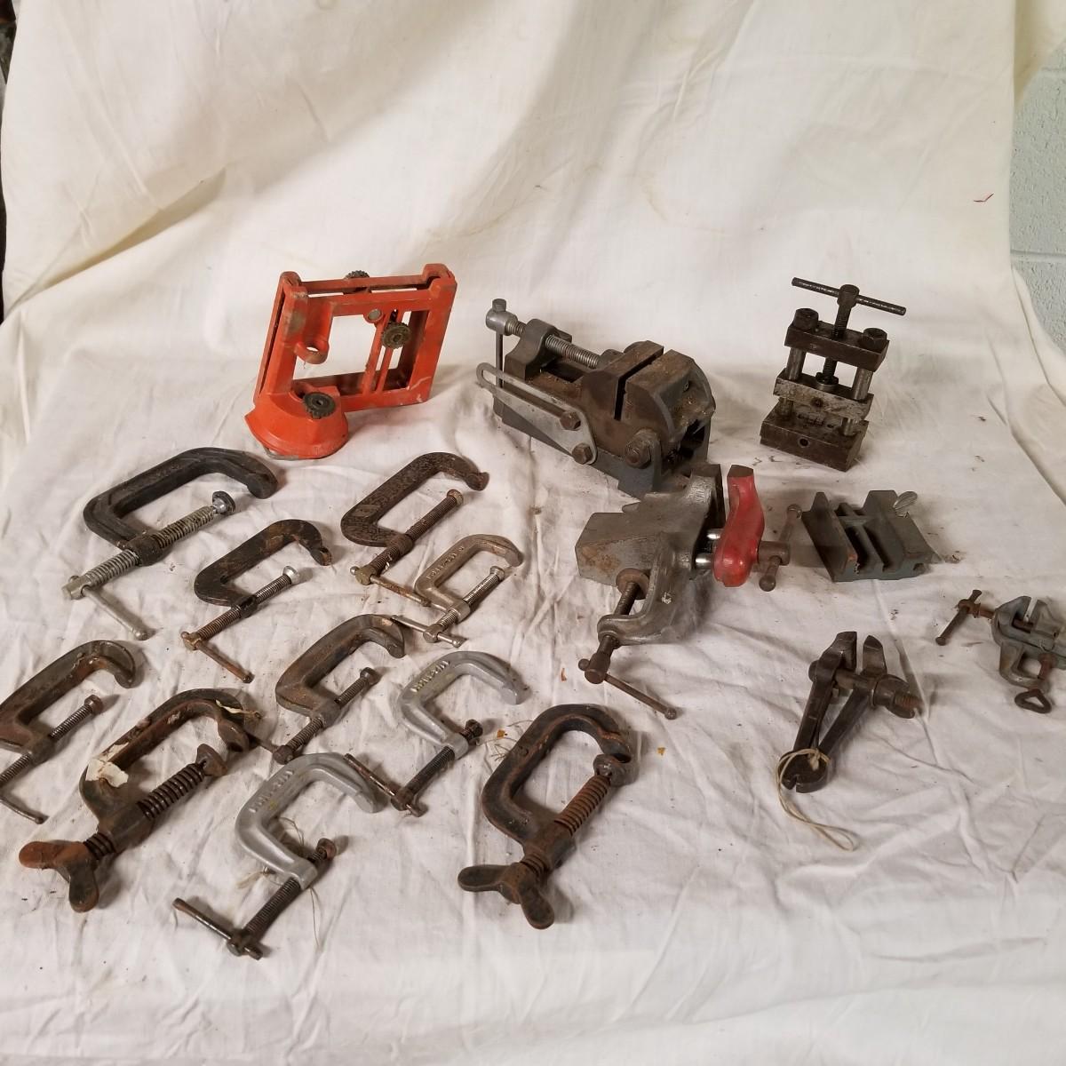 Several different sizes of clamps and vises.  Ten 'C' clamps from 1 1/2"-3". Three small table clamp vises, 7/8", 1 1/4" and 2 1/2" jaws.  One 2 1/2" adjustable machinist vise with tilt.  One small hand press. Some dirt and rust.  Shipping available.