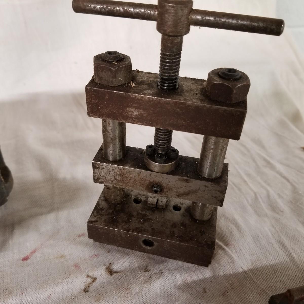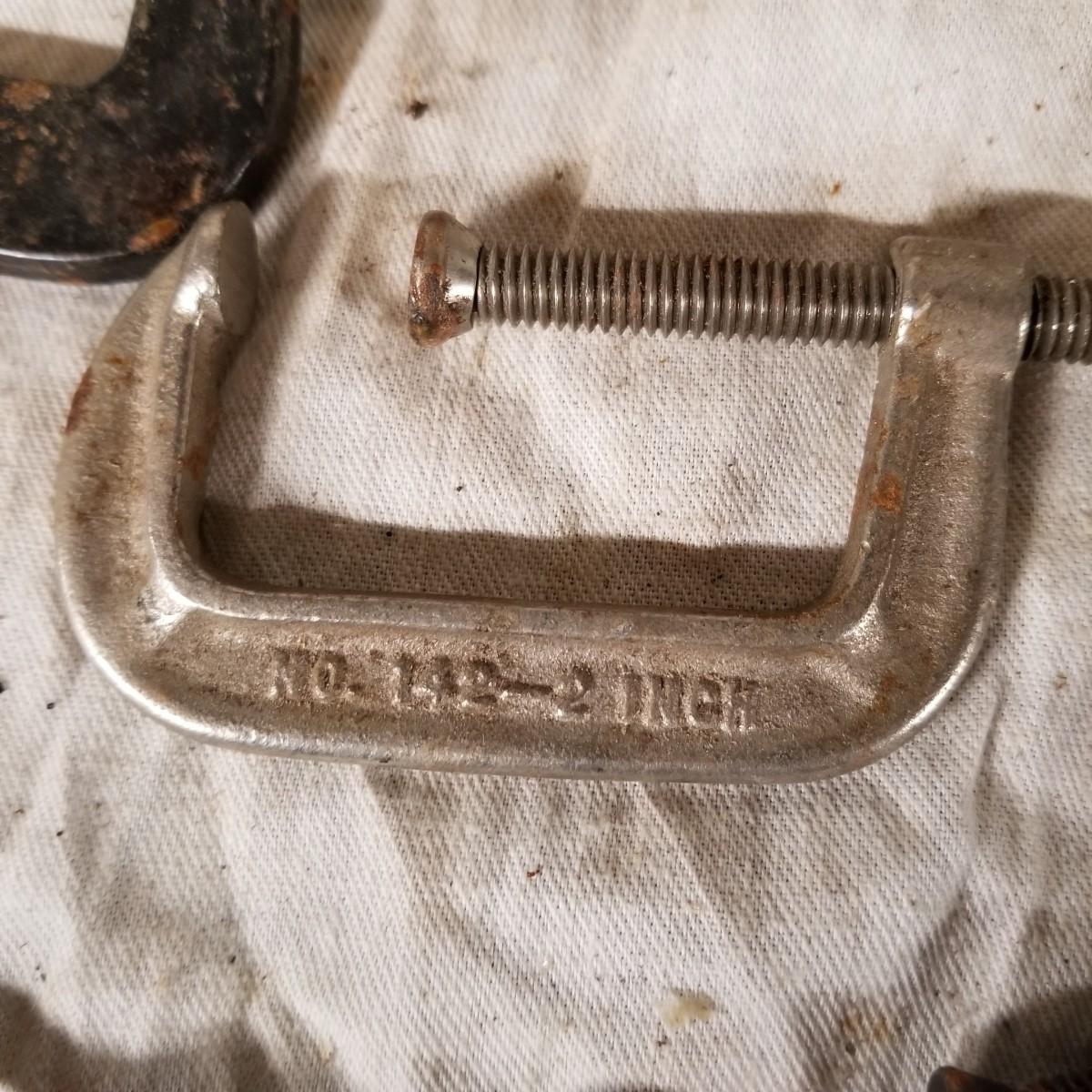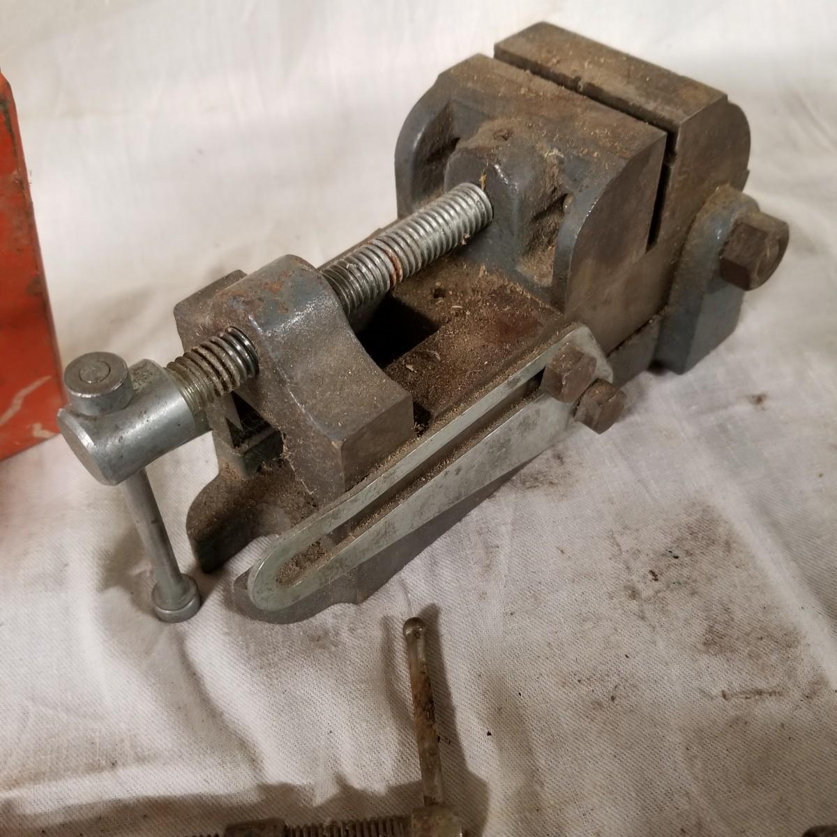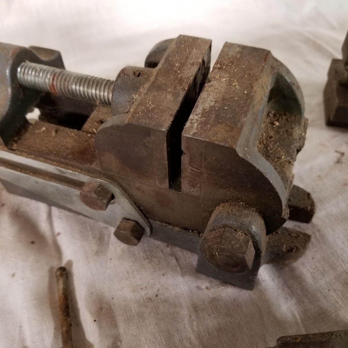 Several different sizes of clamps and vises.  Ten 'C' clamps from 1 1/2"-3". Three small table clamp vises, 7/8", 1 1/4" and 2 1/2" jaws.  One 2 1/2" adjustable machinist vise with tilt.  One small hand press. Some dirt and rust.  Shipping available.