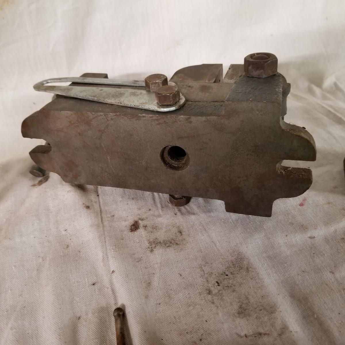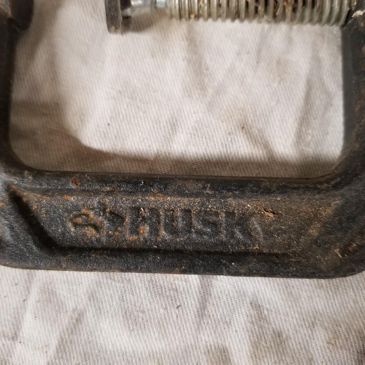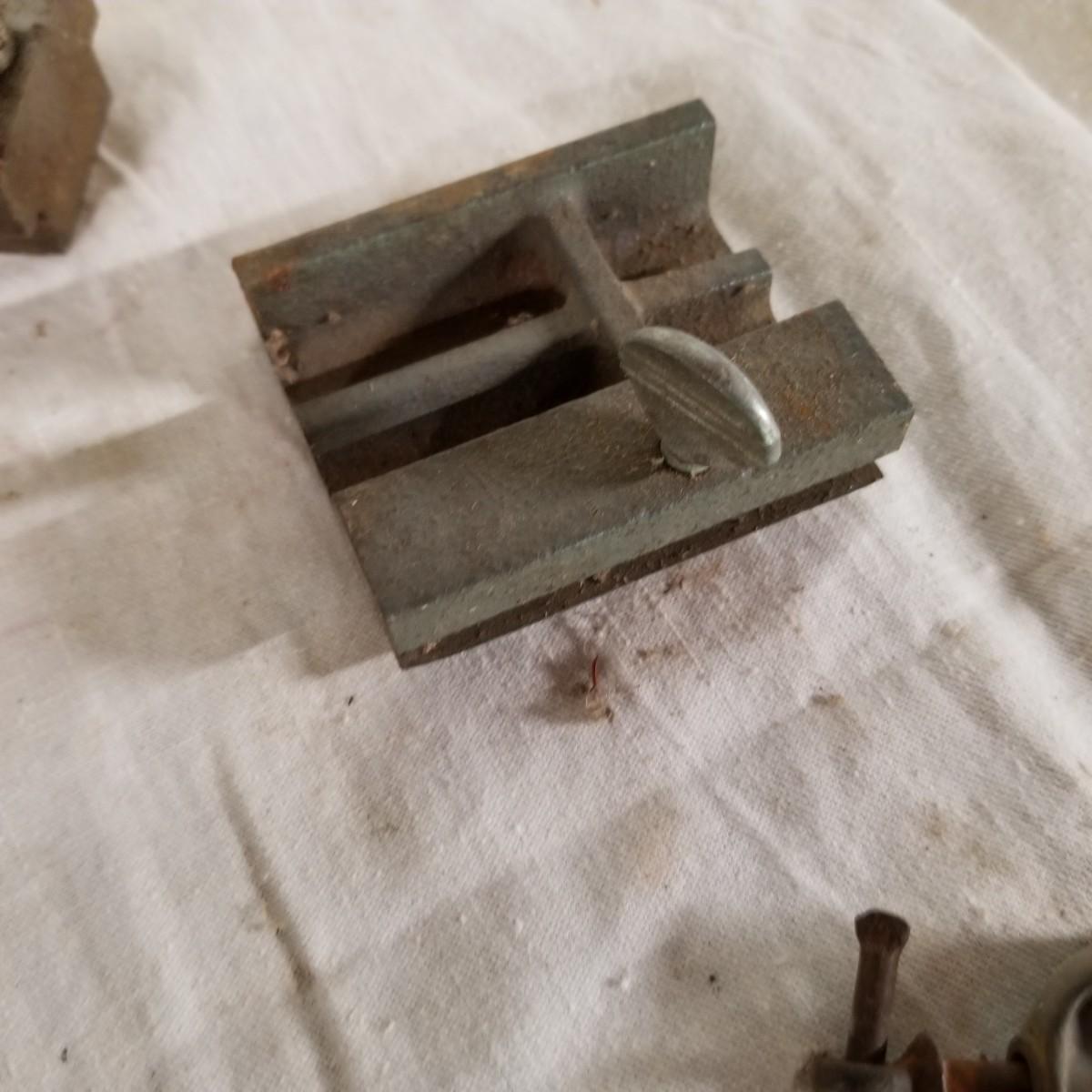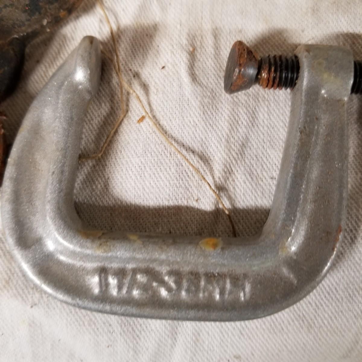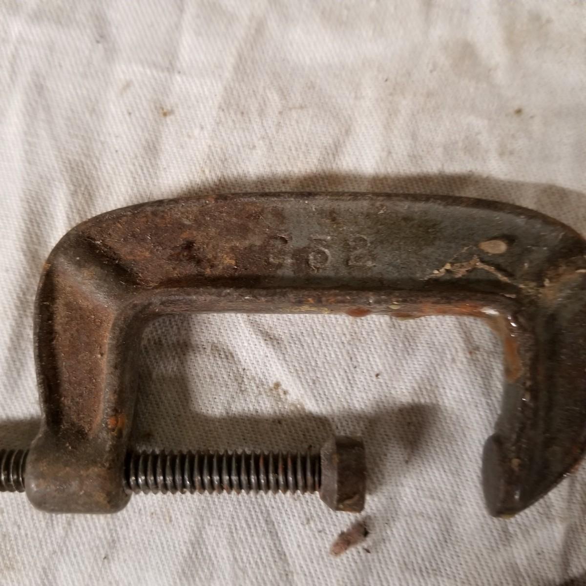 Several different sizes of clamps and vises.  Ten 'C' clamps from 1 1/2"-3". Three small table clamp vises, 7/8", 1 1/4" and 2 1/2" jaws.  One 2 1/2" adjustable machinist vise with tilt.  One small hand press. Some dirt and rust.  Shipping available.