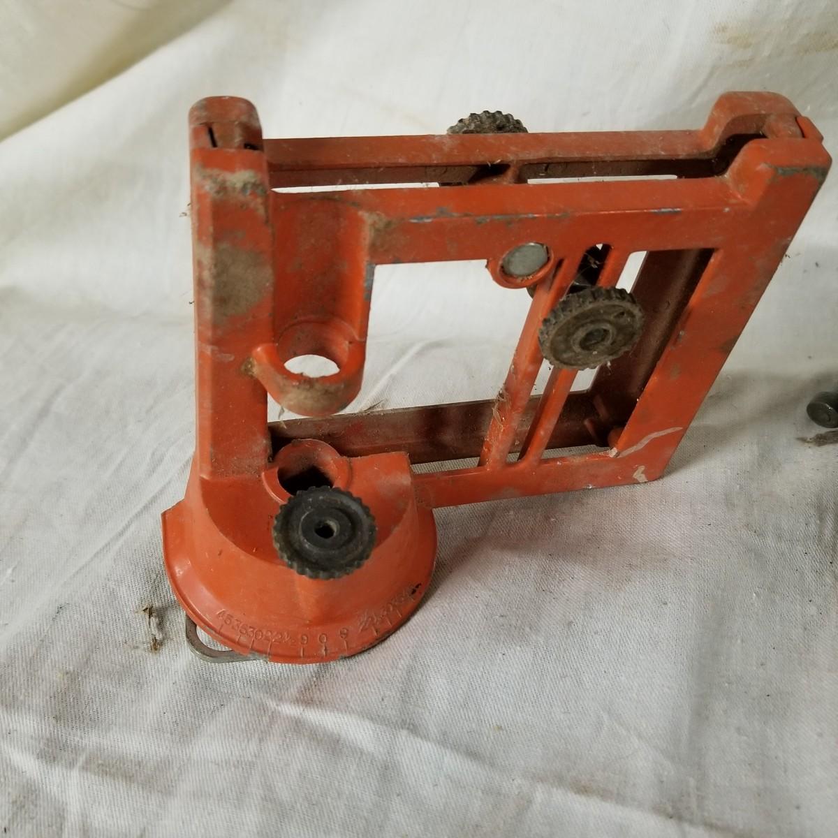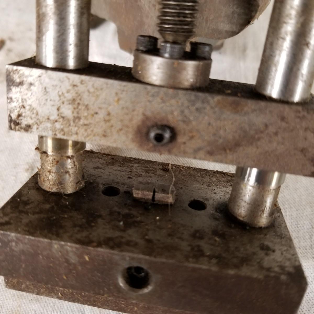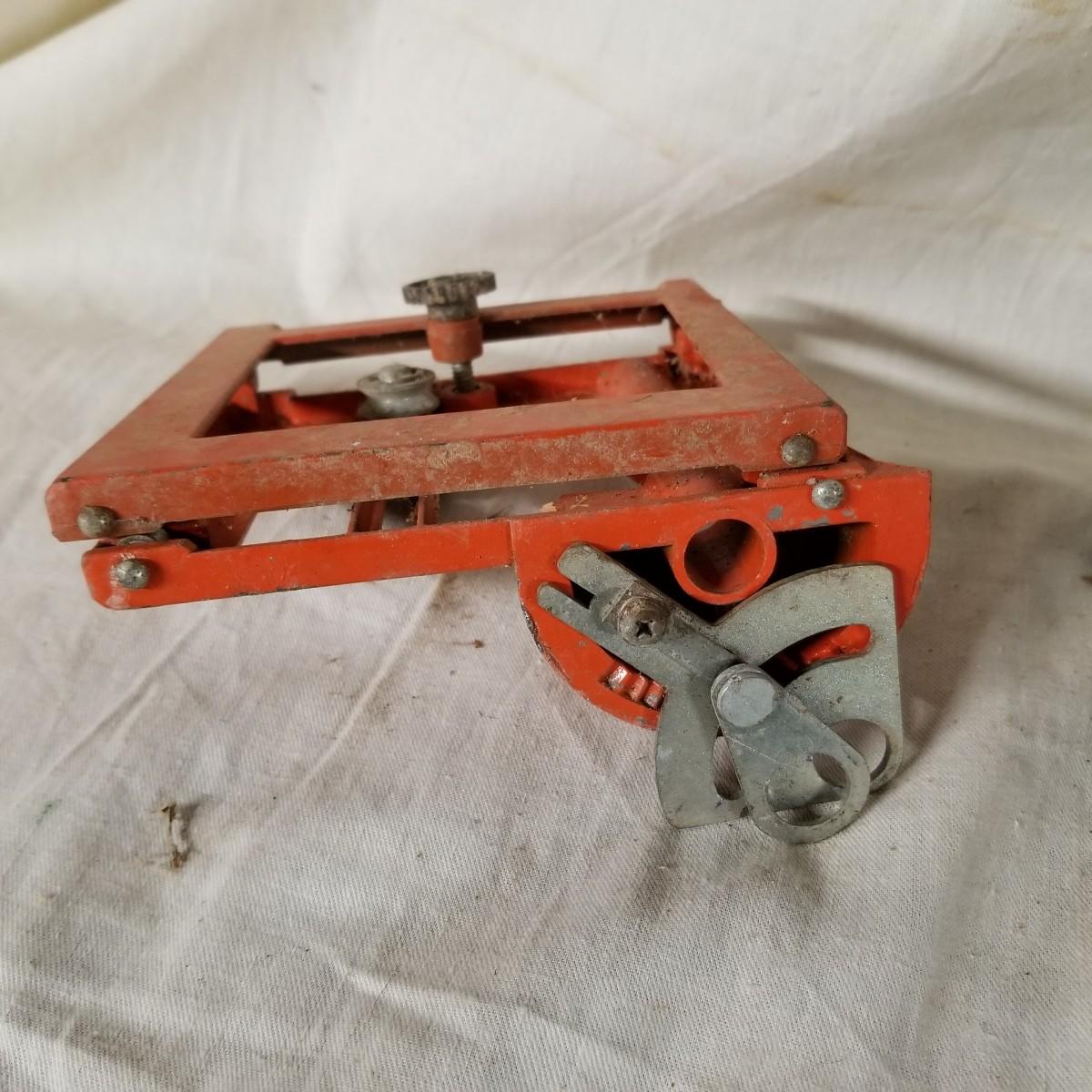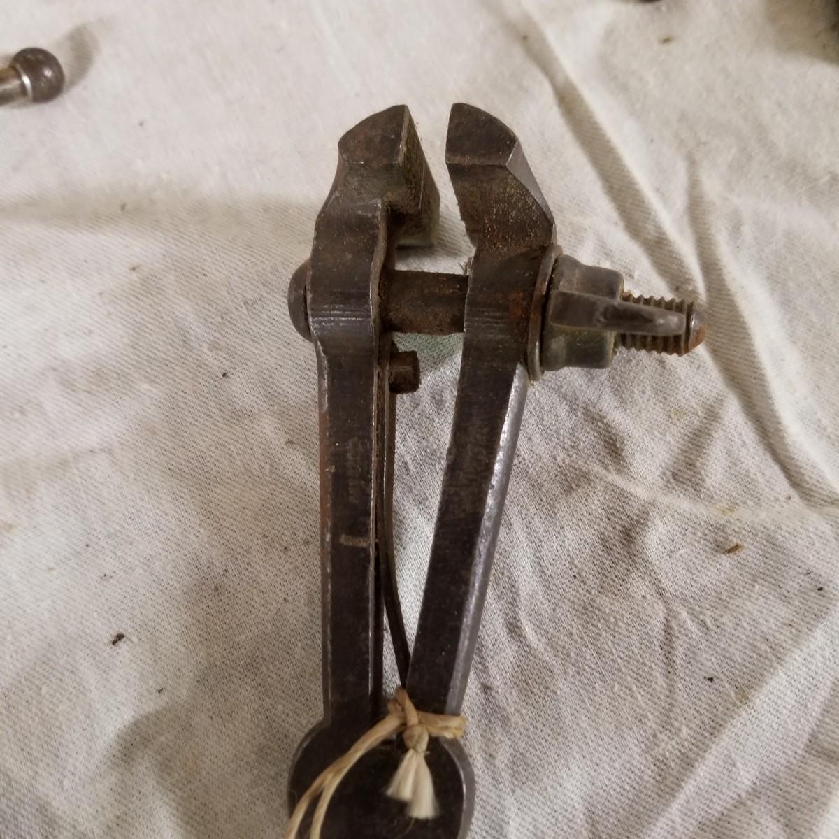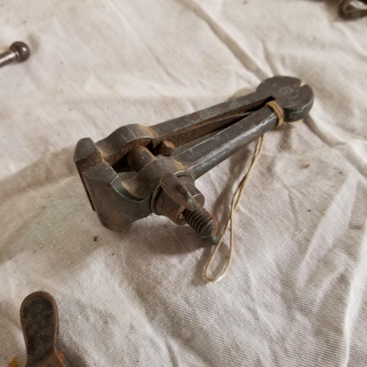 Several different sizes of clamps and vises.  Ten 'C' clamps from 1 1/2"-3". Three small table clamp vises, 7/8", 1 1/4" and 2 1/2" jaws.  One 2 1/2" adjustable machinist vise with tilt.  One small hand press. Some dirt and rust.  Shipping available.