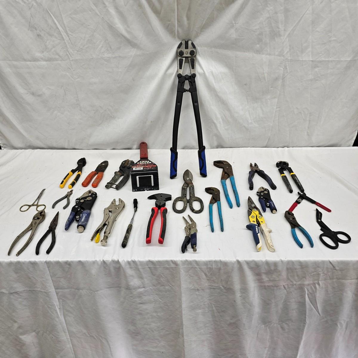 One pair Kobalt 18" bolt cutters, Vise grips in different sizes, channel locks and more. A pair of Ace fence pliers, Task Force tin snips. Assorted other styles of gripping instruments. See photos for details. Local pickup only.