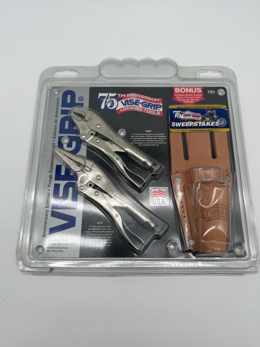 Limited 75th Anniversary Vise-Grip locking pliers set featuring two USA-made locking pliers in original display case. Includes bonus leather holster (limited edition). New old stock / unused with packaging. Great collectible or premium shop tool.