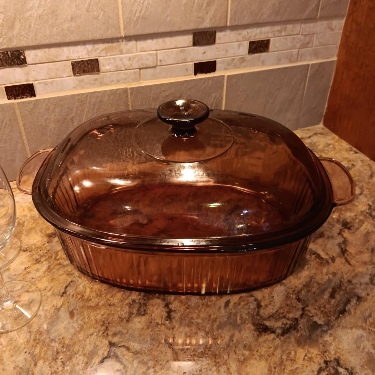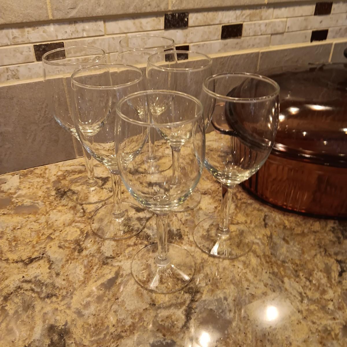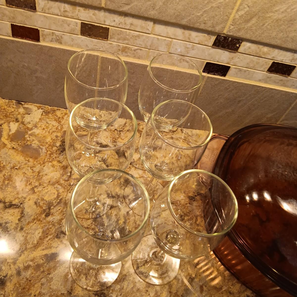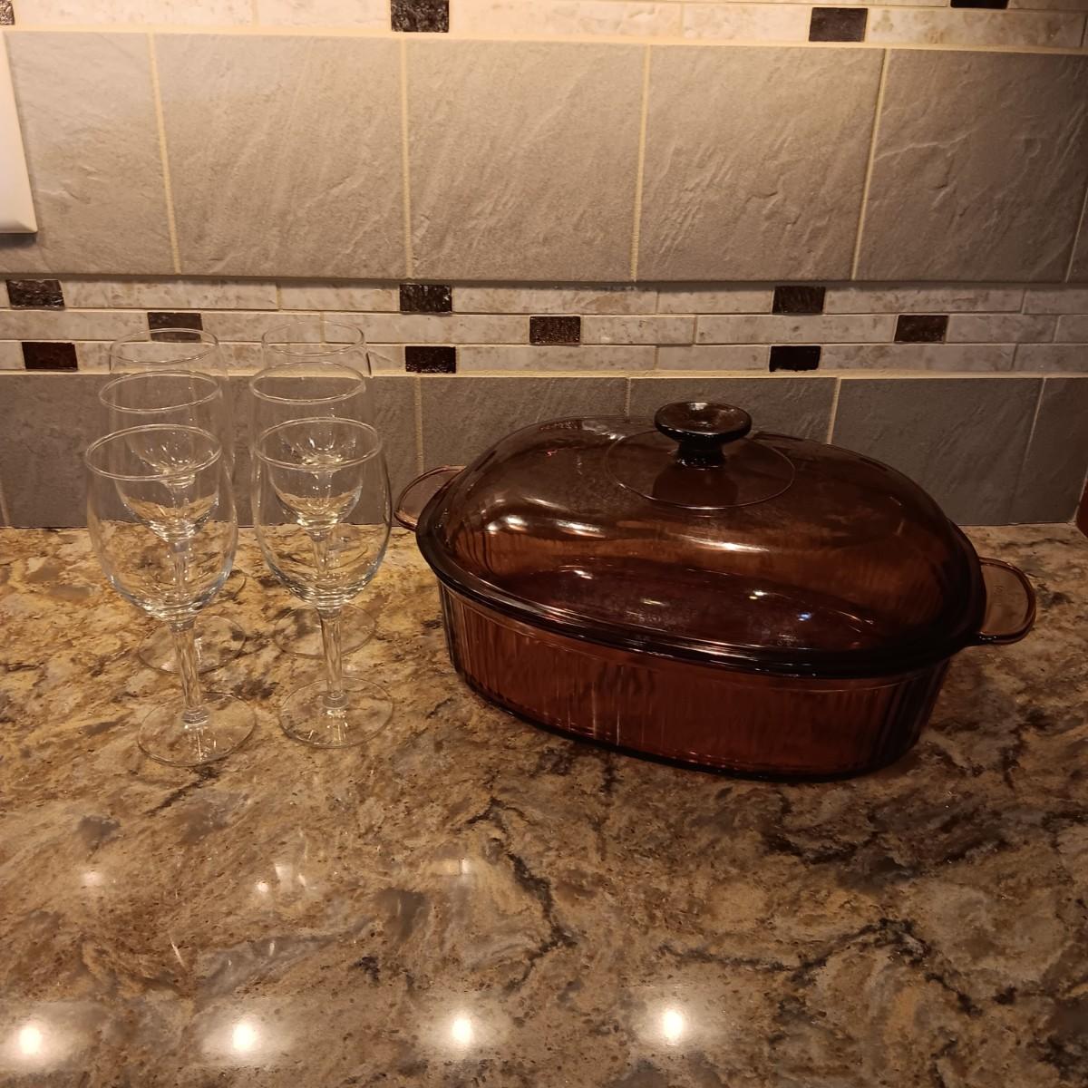 VISION CORNING DUTCH OVEN AND 6 STEMMED GLASSES