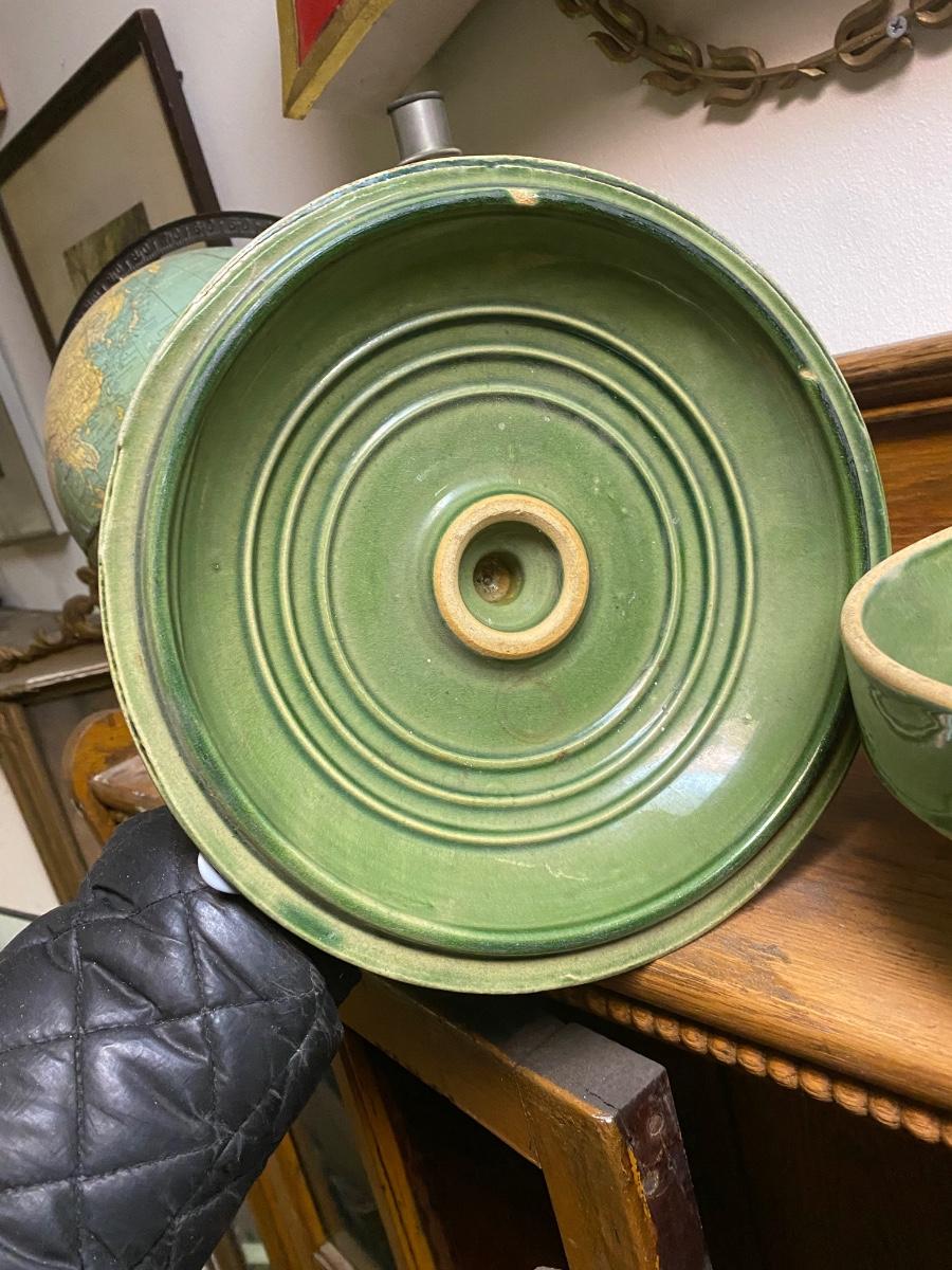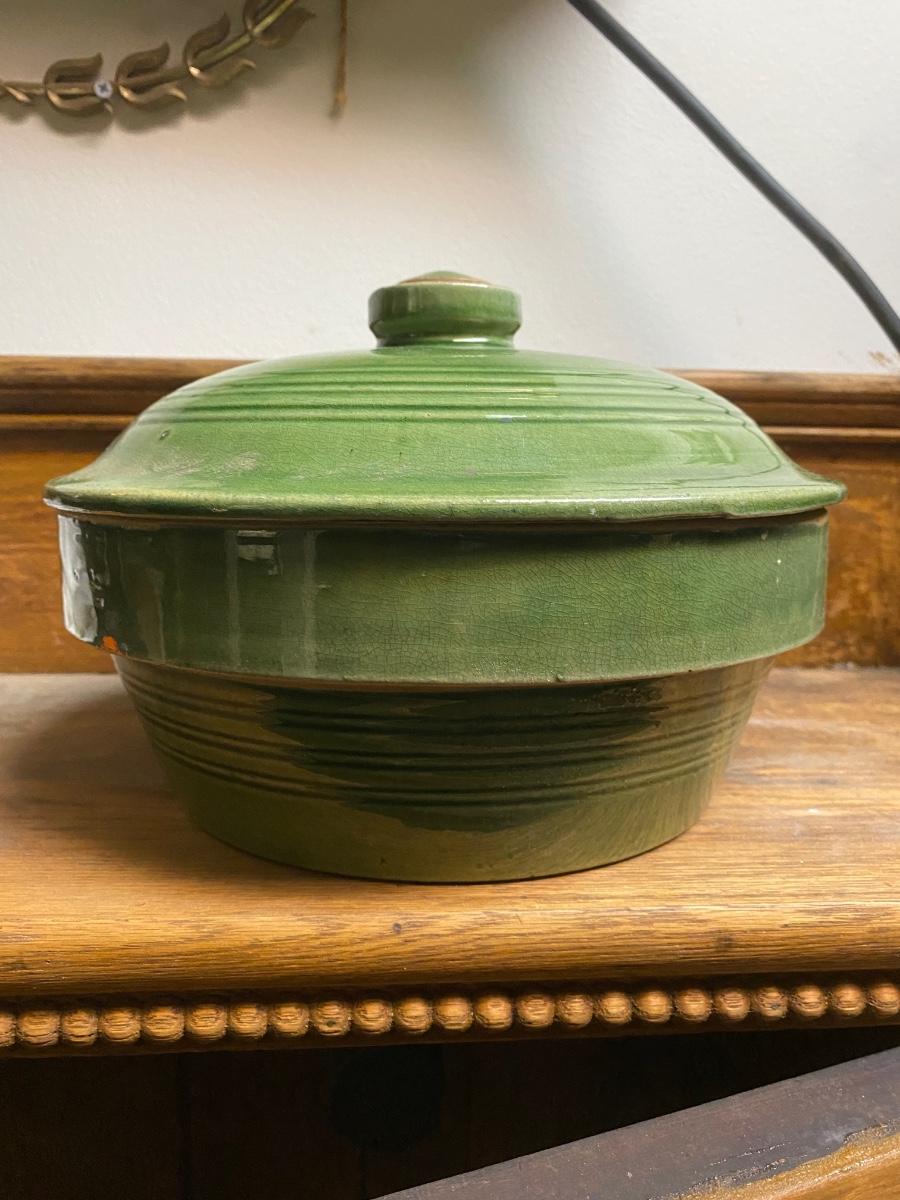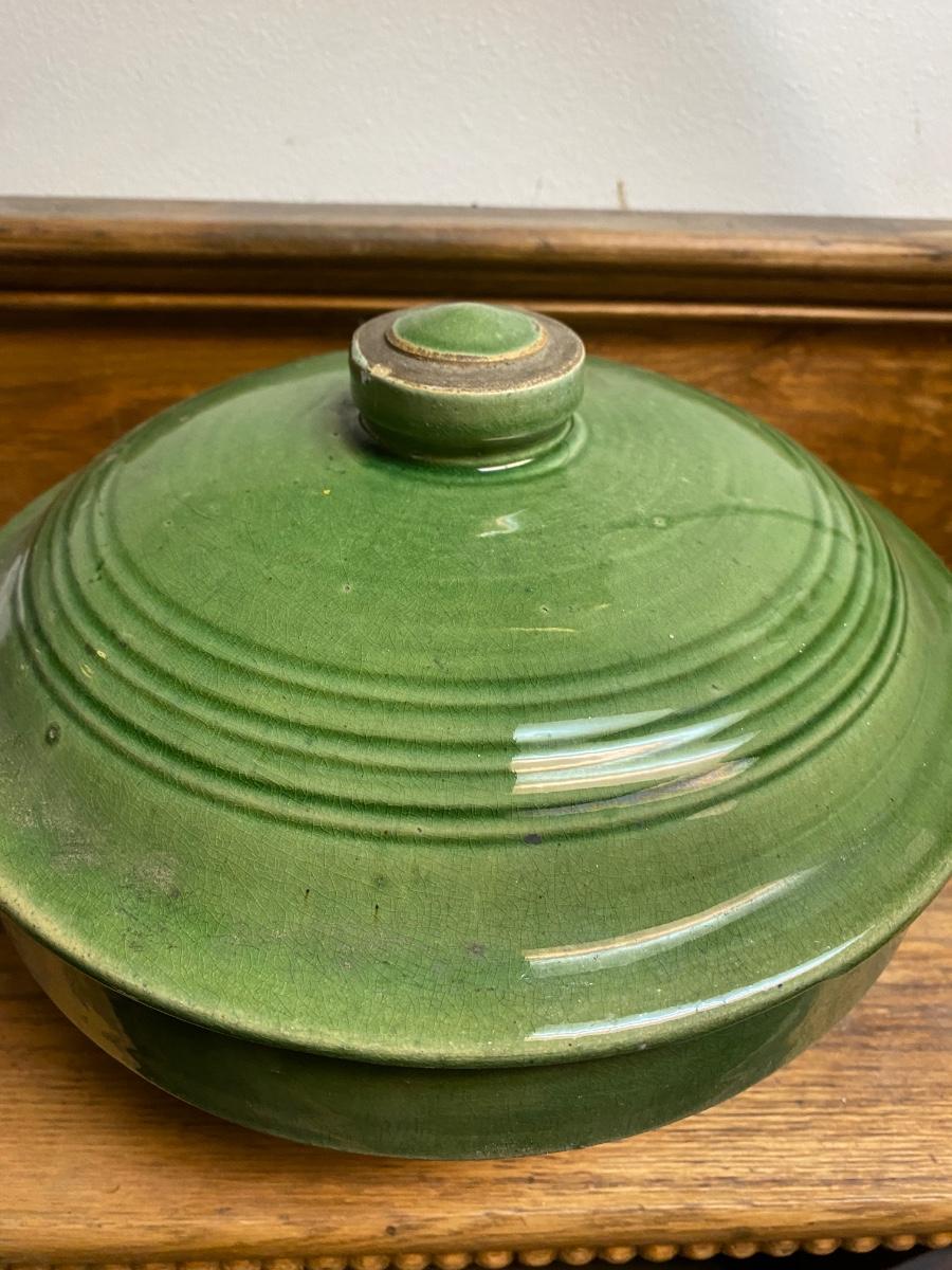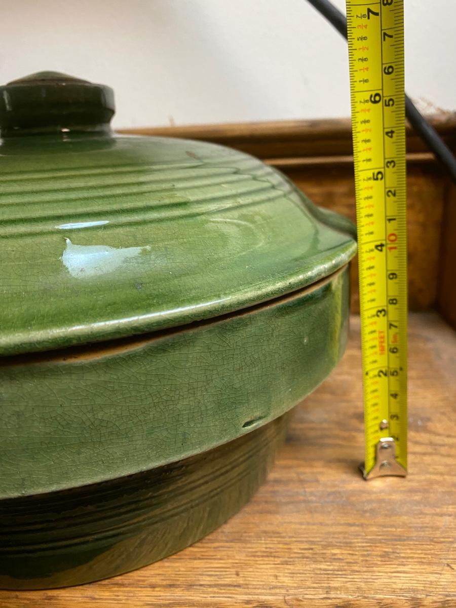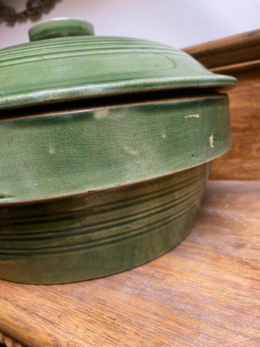 Vintage green covered casserole dish, unmarked. Some glazing issues, but no cracks. 4" high without lid, 10" diameter.