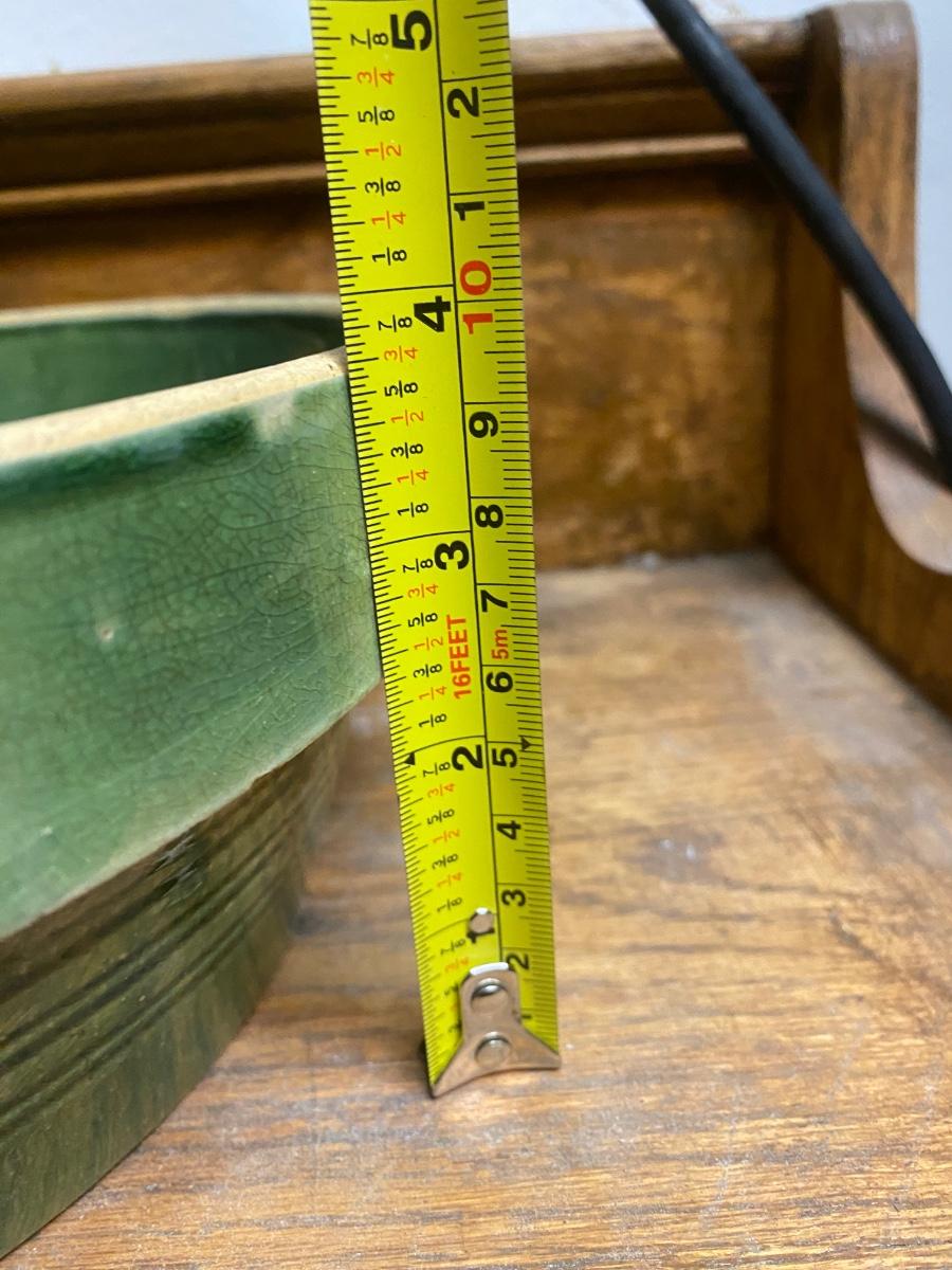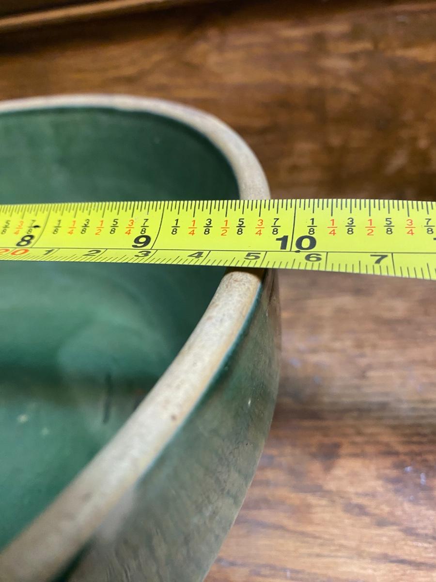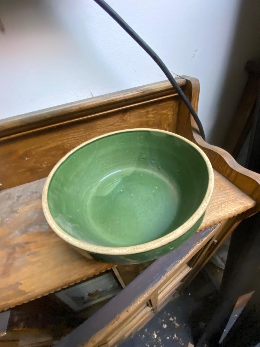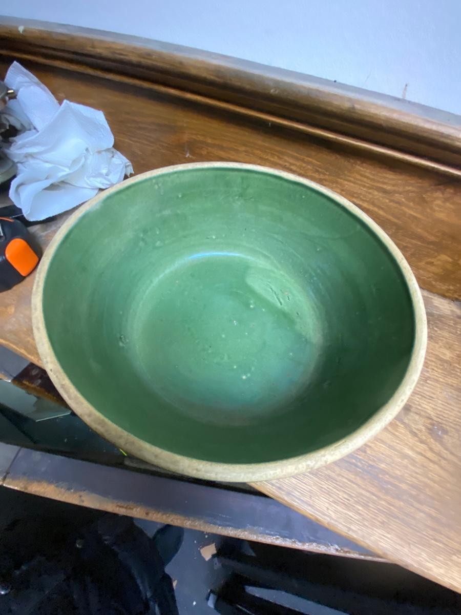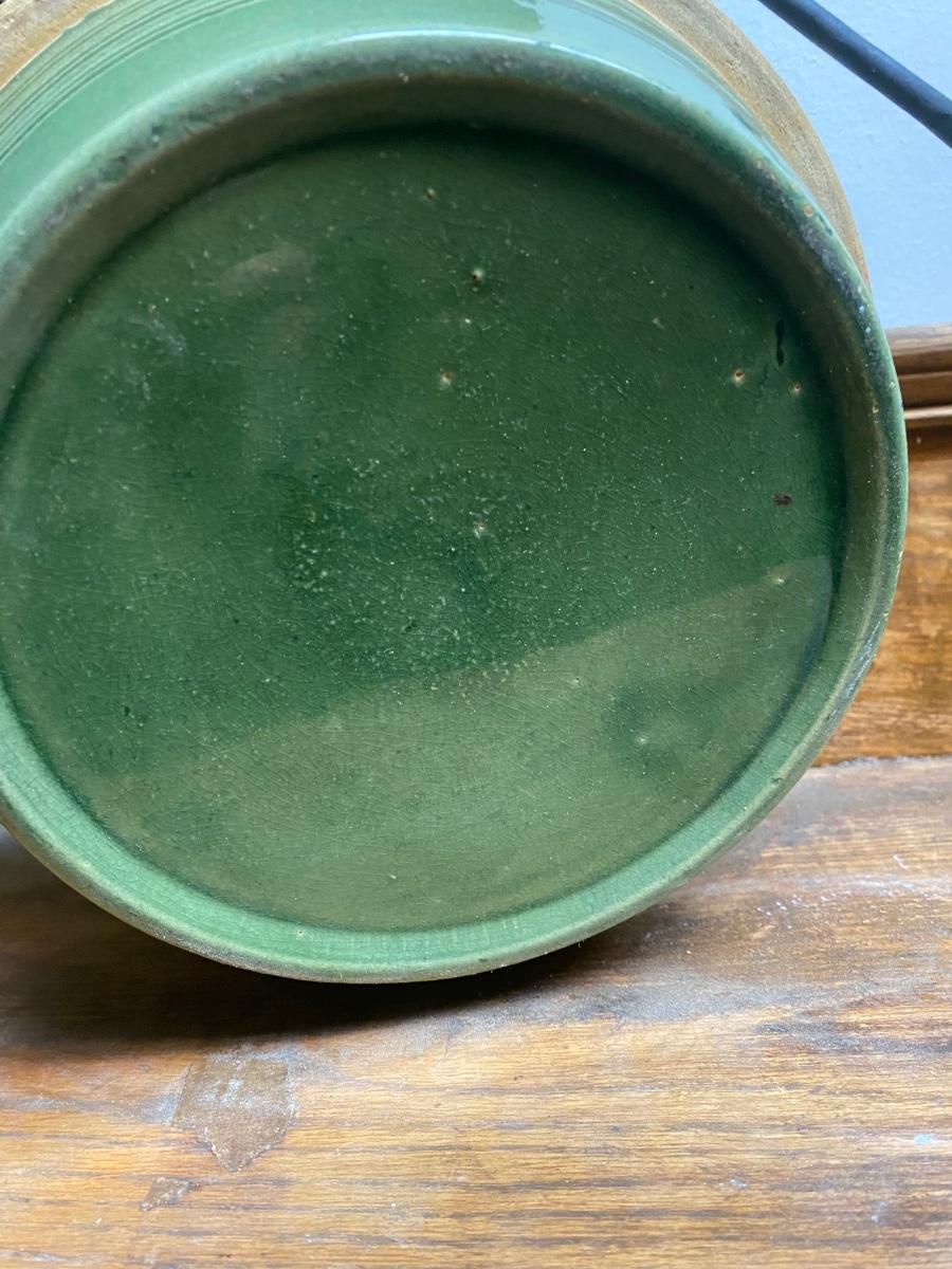 Vintage green covered casserole dish, unmarked. Some glazing issues, but no cracks. 4" high without lid, 10" diameter.