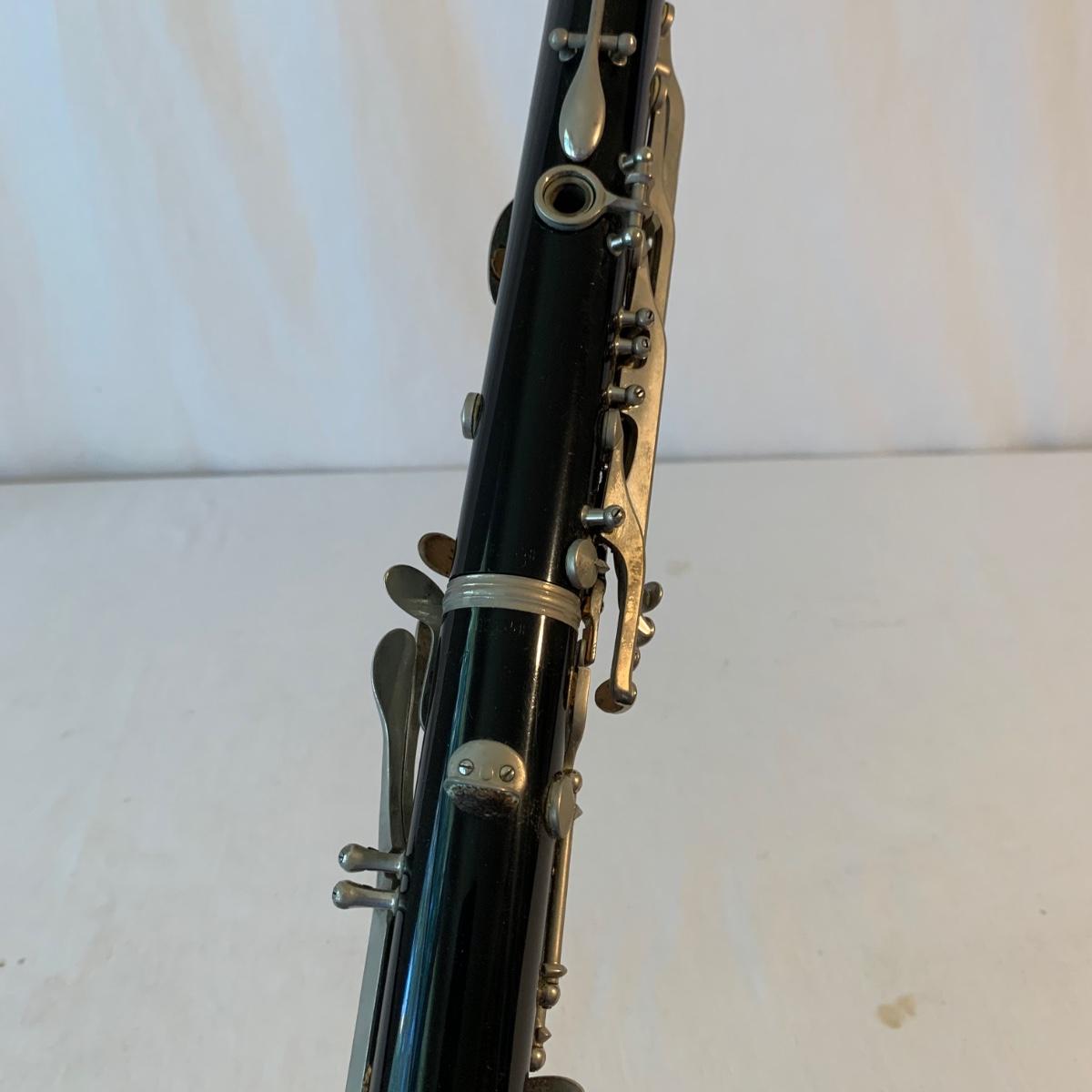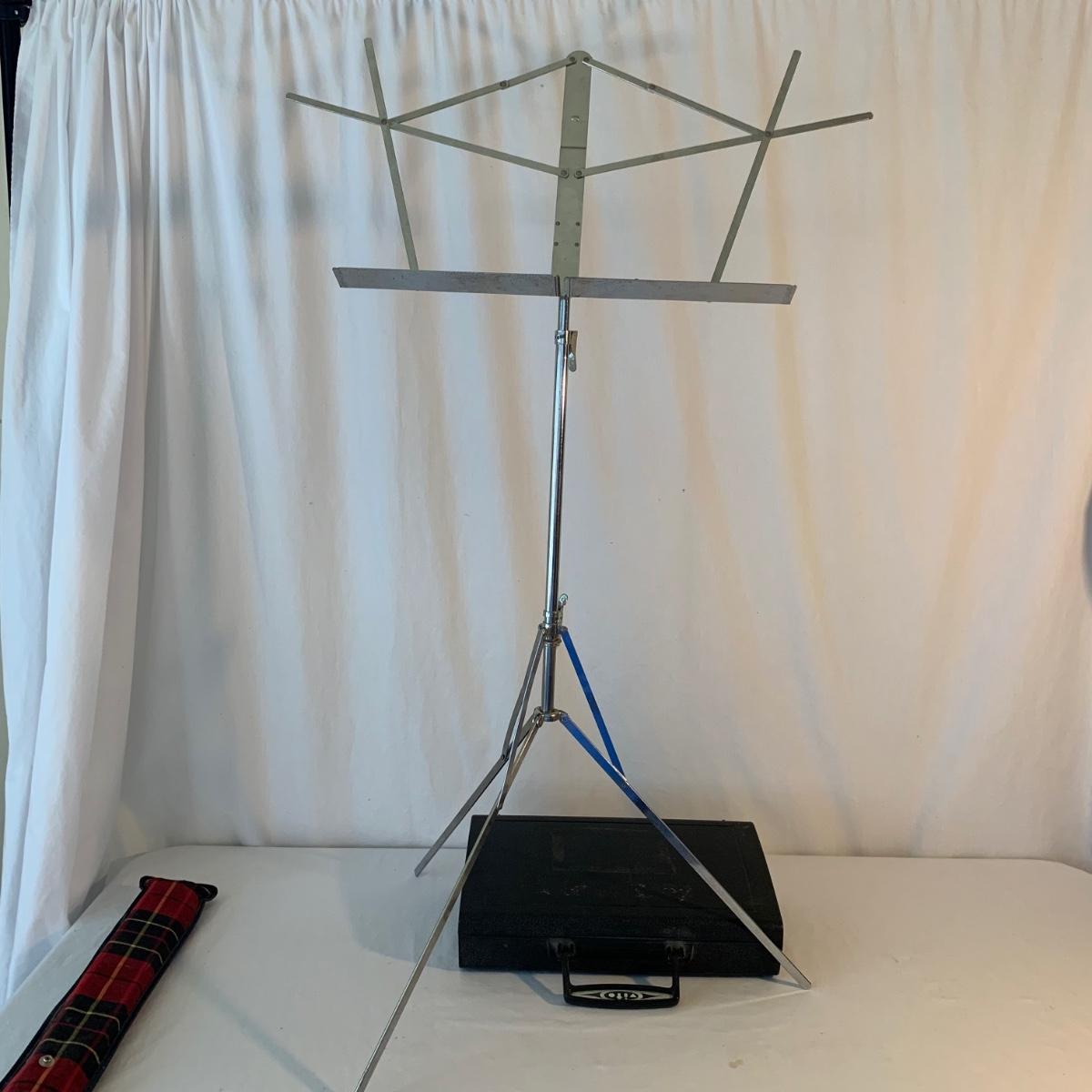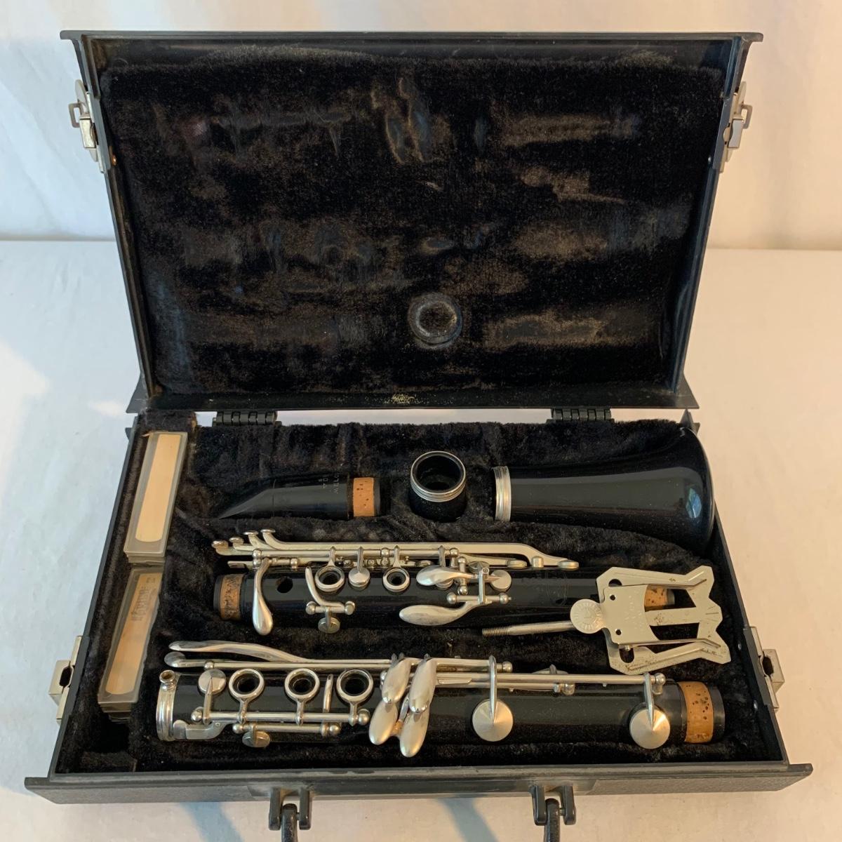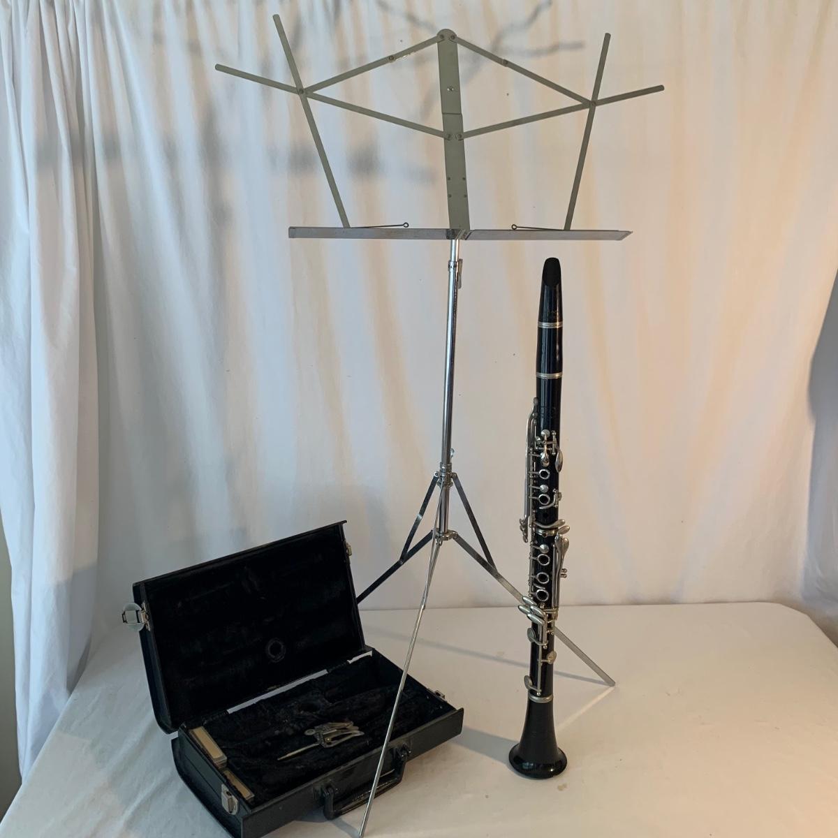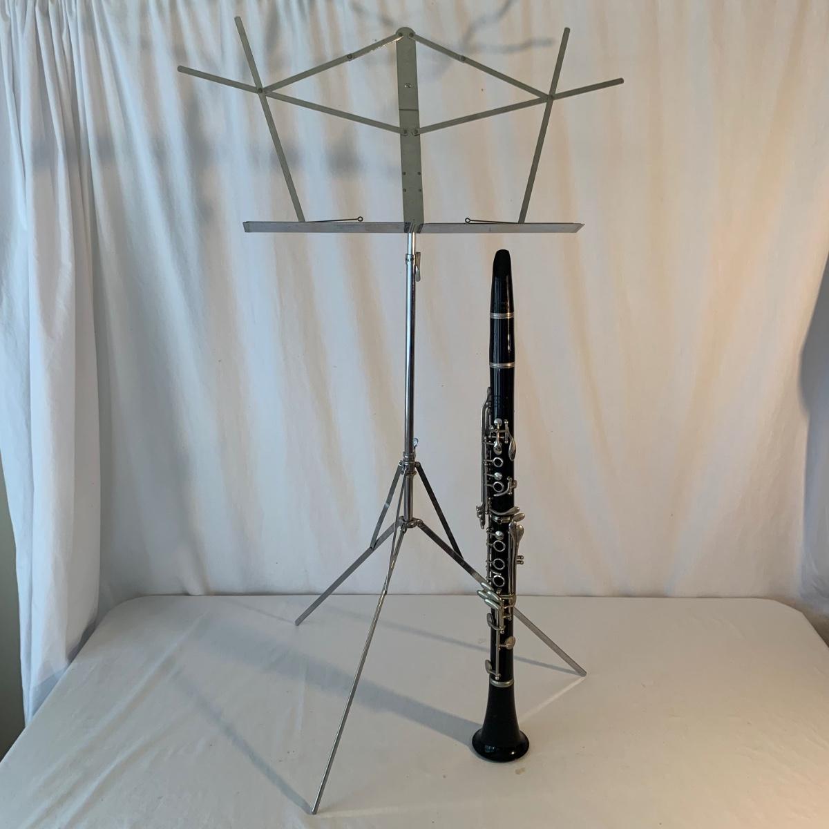 Vito-Reso 3 clarinet in a hard plastic case with velour inner lining. Eleven reeds in plastic cases are included. Clarinet parts fit together easily. It appears to be in good condition, just a bit dusty. The case measures 13” x 3.75” x 8”. The Hamilton brand metal music stand is included. It disassembles into three pieces. The stand is adjustable in height. It comes in a plaid fabric case. The music stand is in good condition. Shipping available.