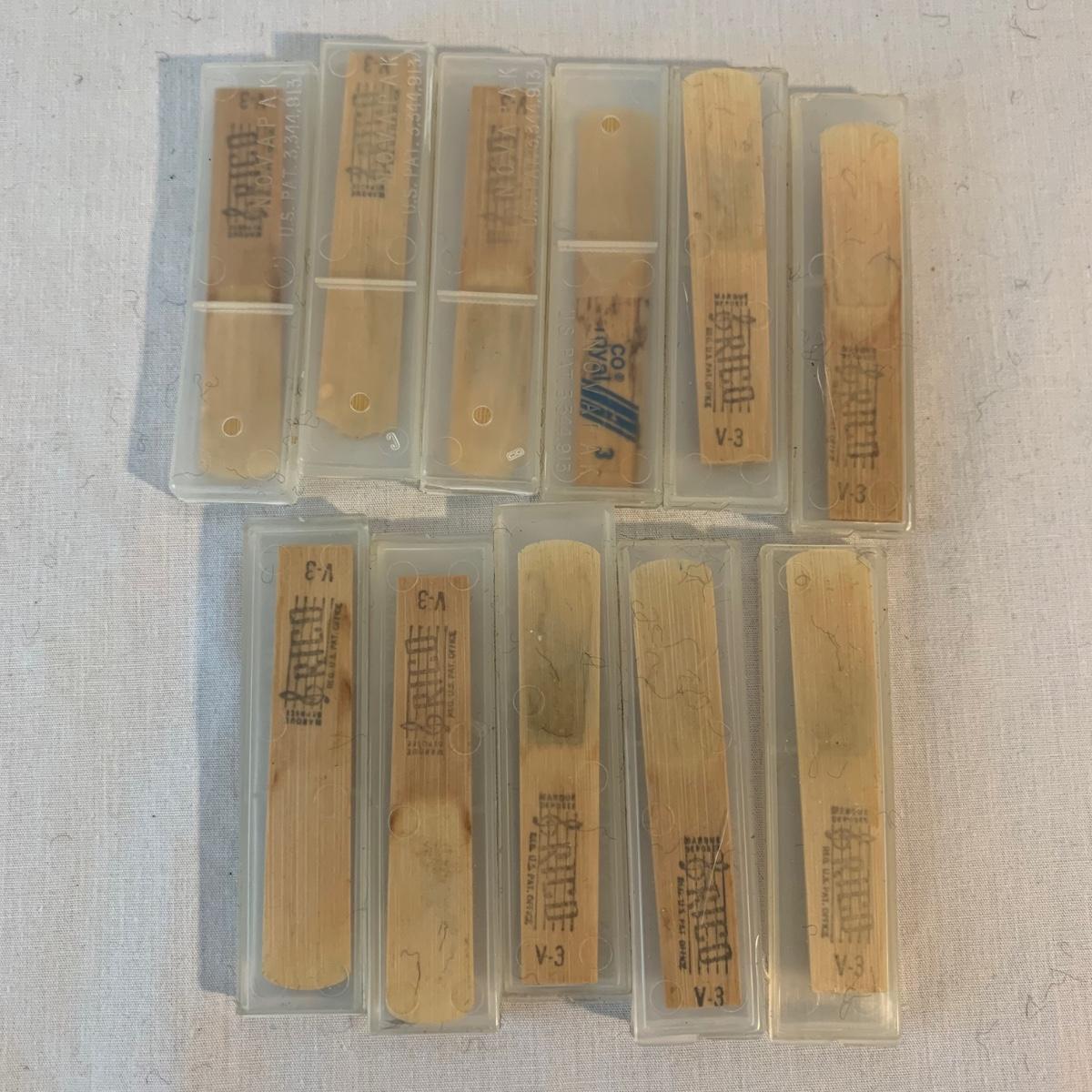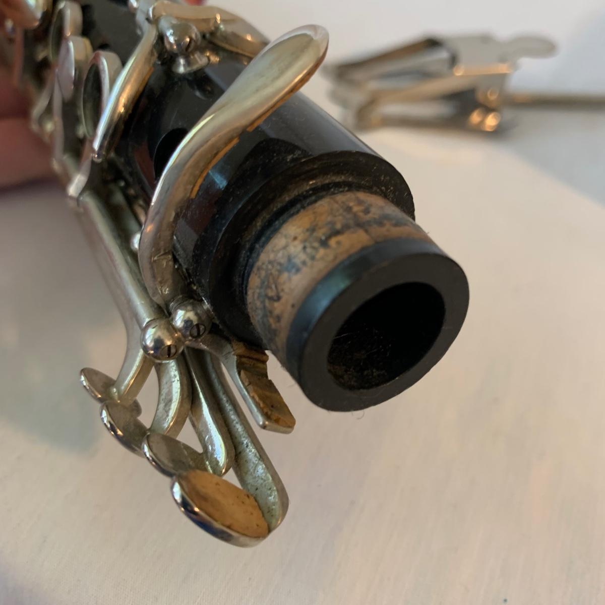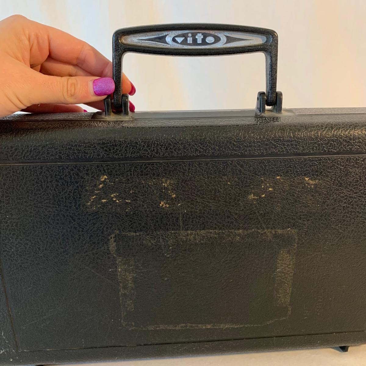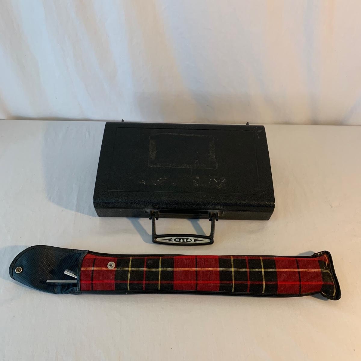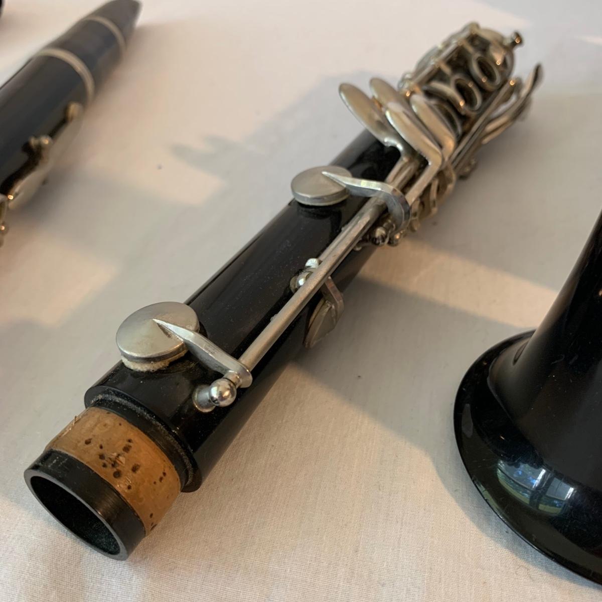 Vito-Reso 3 clarinet in a hard plastic case with velour inner lining. Eleven reeds in plastic cases are included. Clarinet parts fit together easily. It appears to be in good condition, just a bit dusty. The case measures 13” x 3.75” x 8”. The Hamilton brand metal music stand is included. It disassembles into three pieces. The stand is adjustable in height. It comes in a plaid fabric case. The music stand is in good condition. Shipping available.