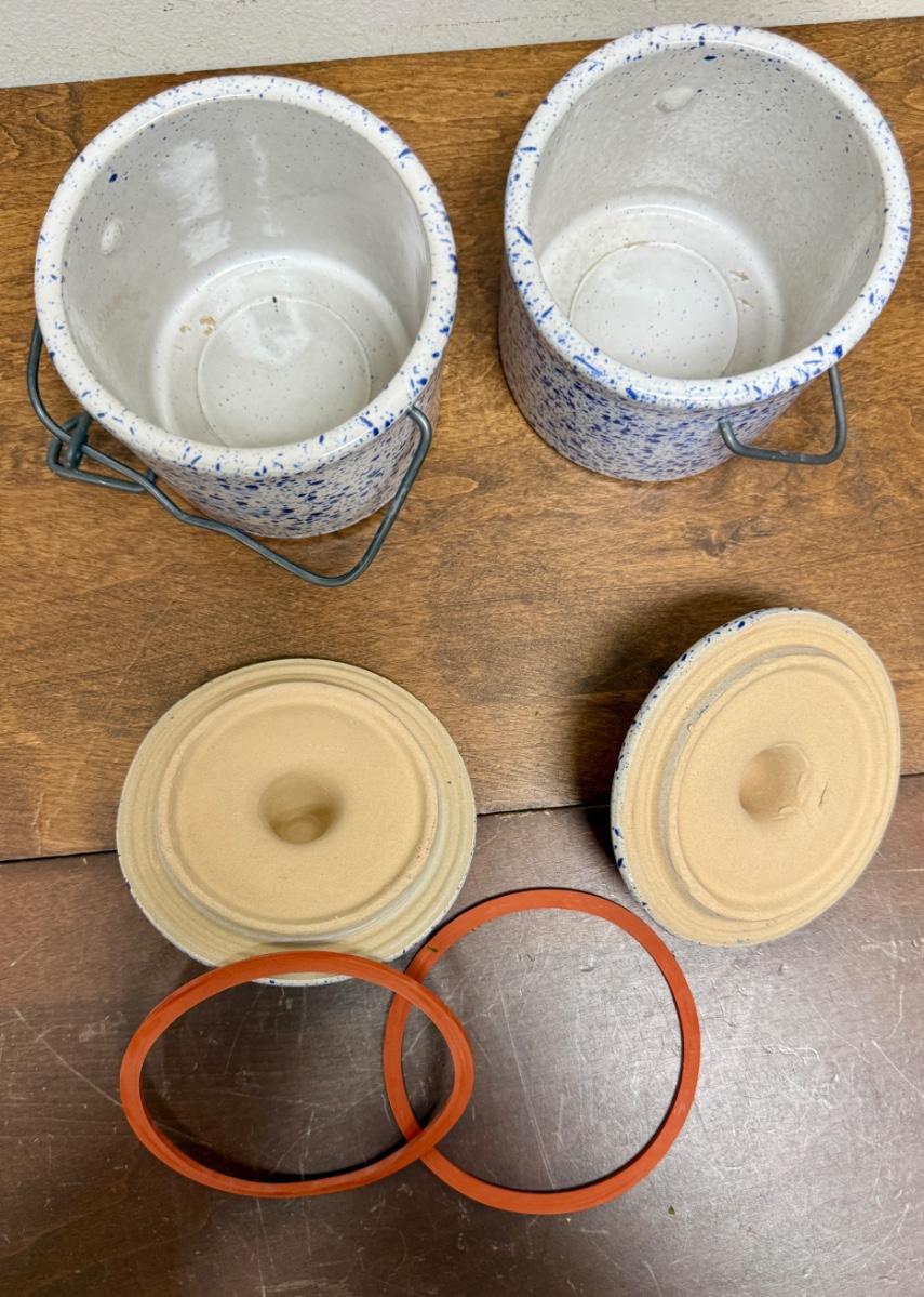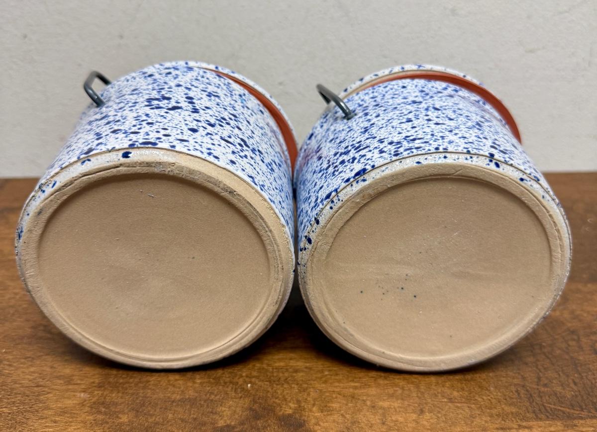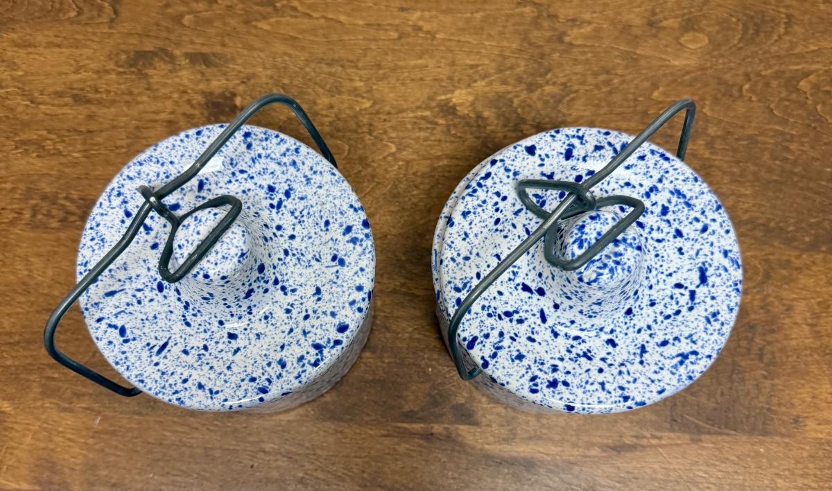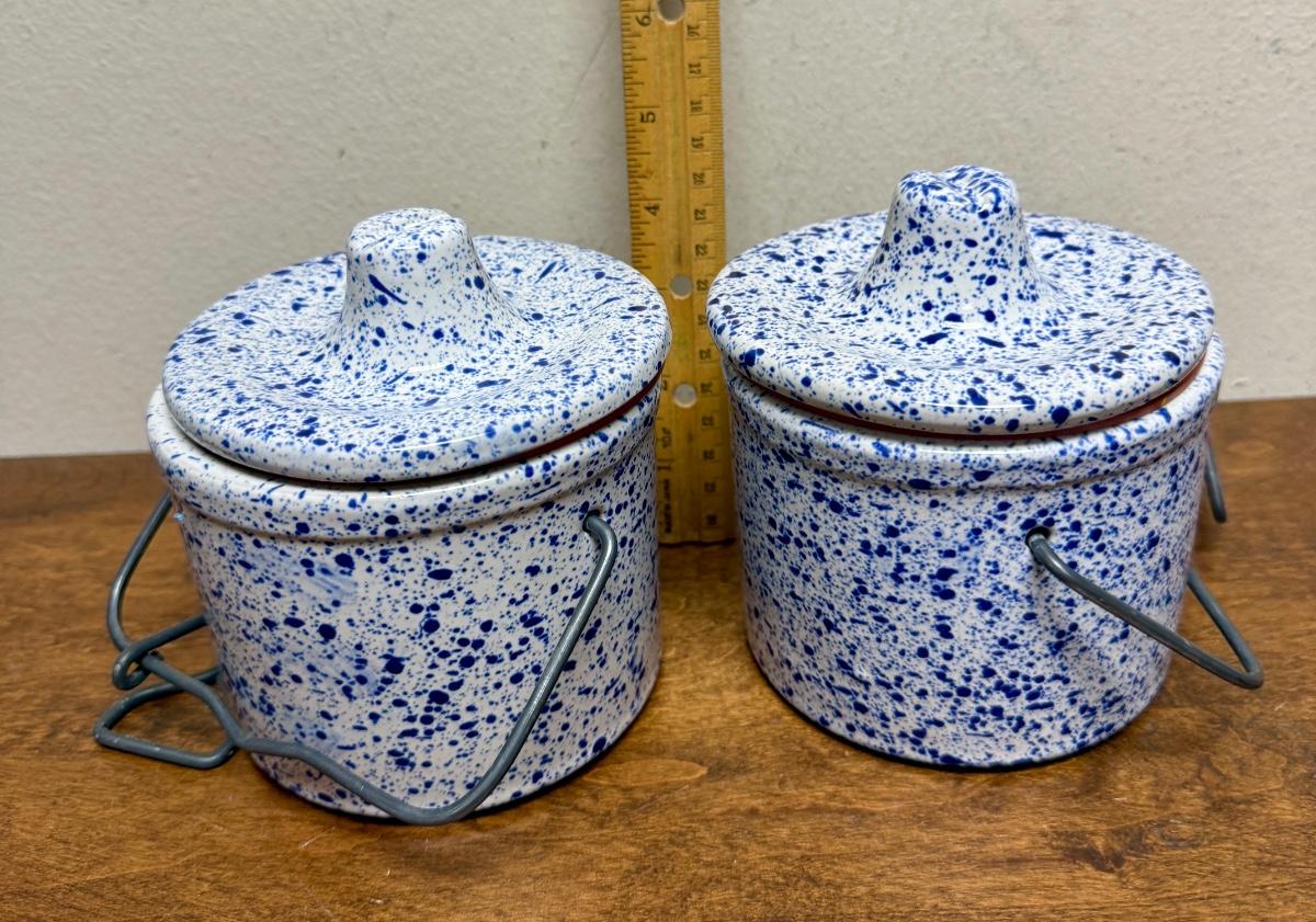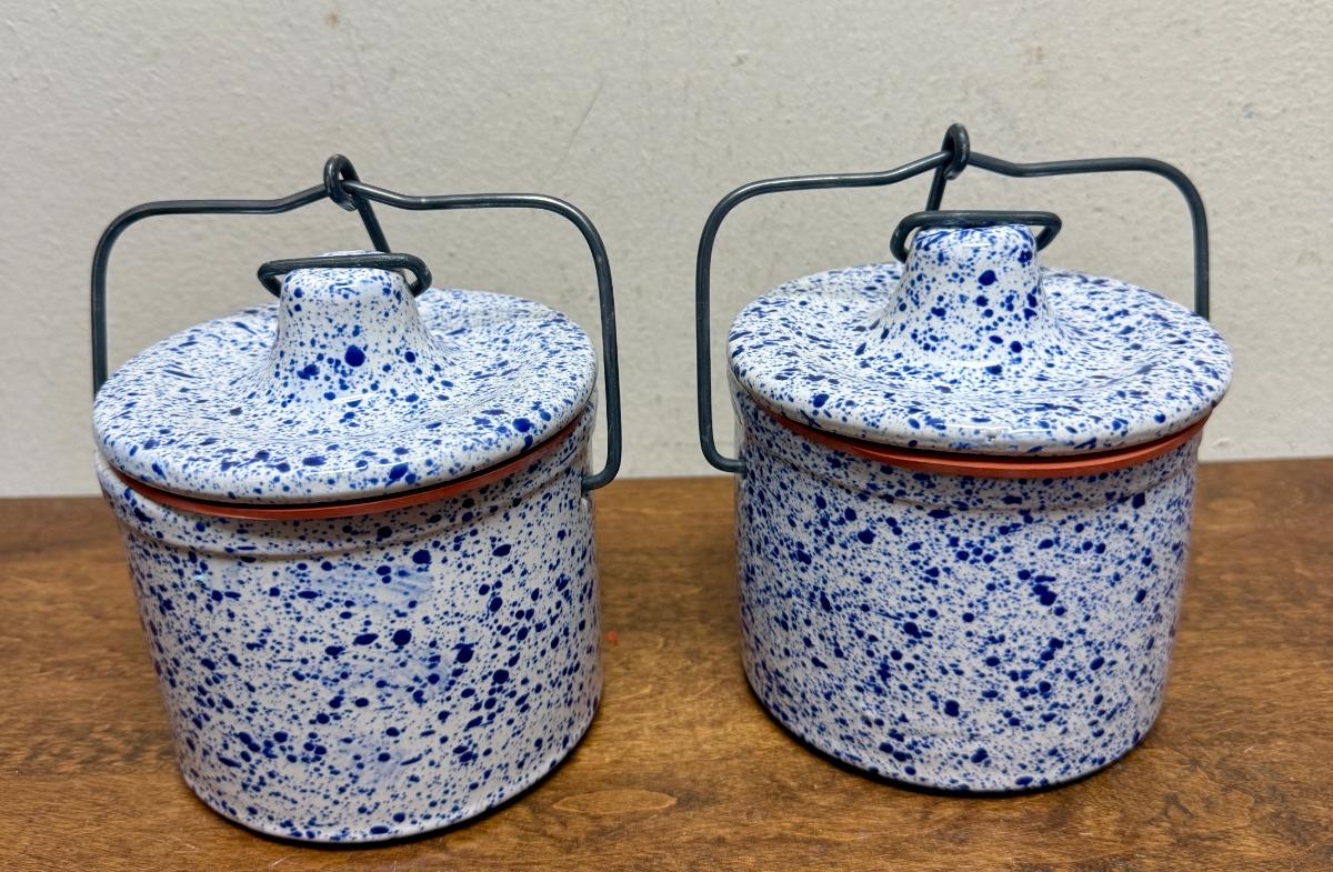 Lot of 2 Blue Speckled Stoneware Butter Crocks w/ wire bail locking lids