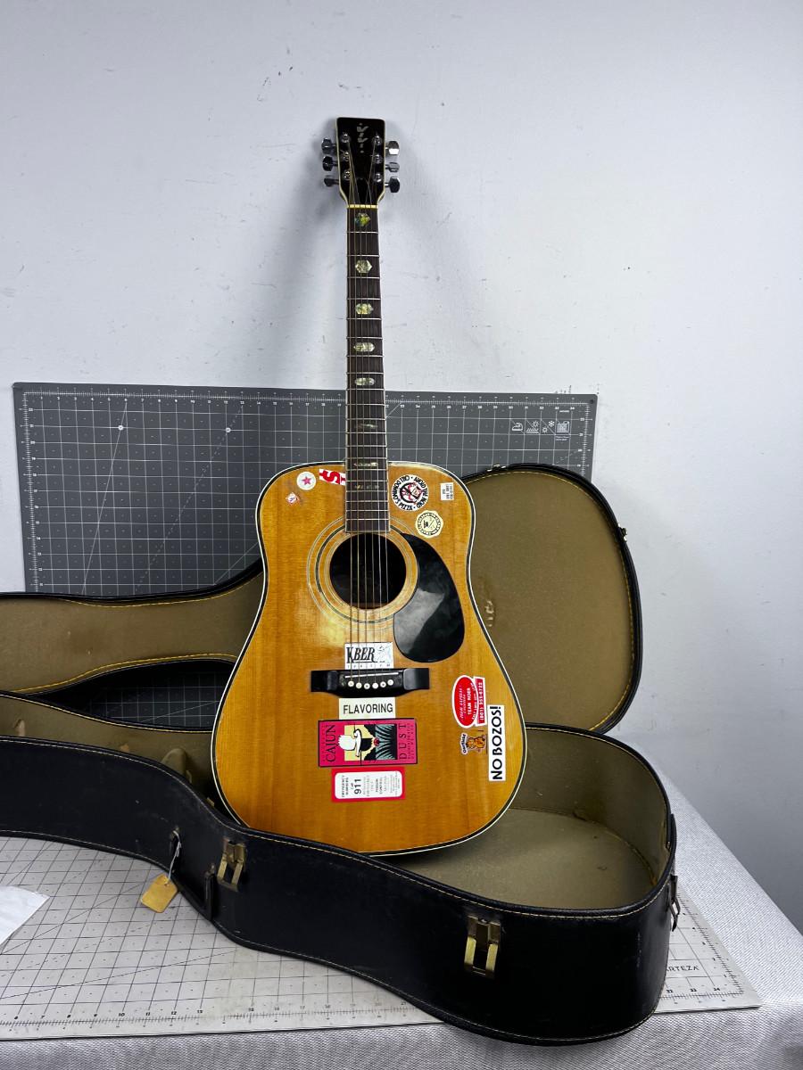 Used and Usable. With Case. Has Mother of Pearl Inlay on the neck. Sounds good but what do I know??? Nothing. Seems good!
