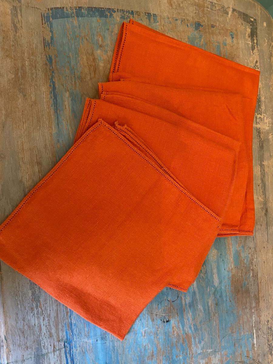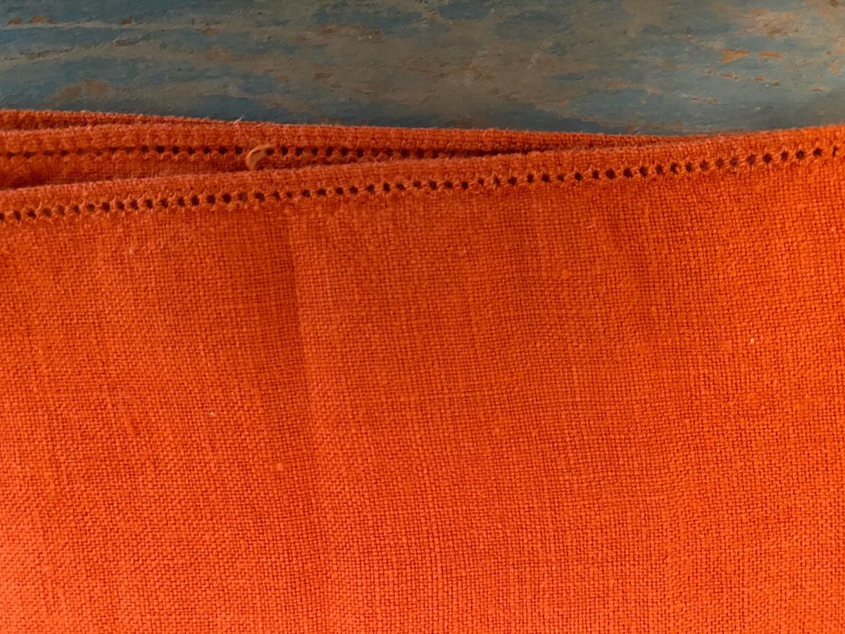 Seven orange linen napkin with simple decorative boarder. 16" X 16" some never used.
