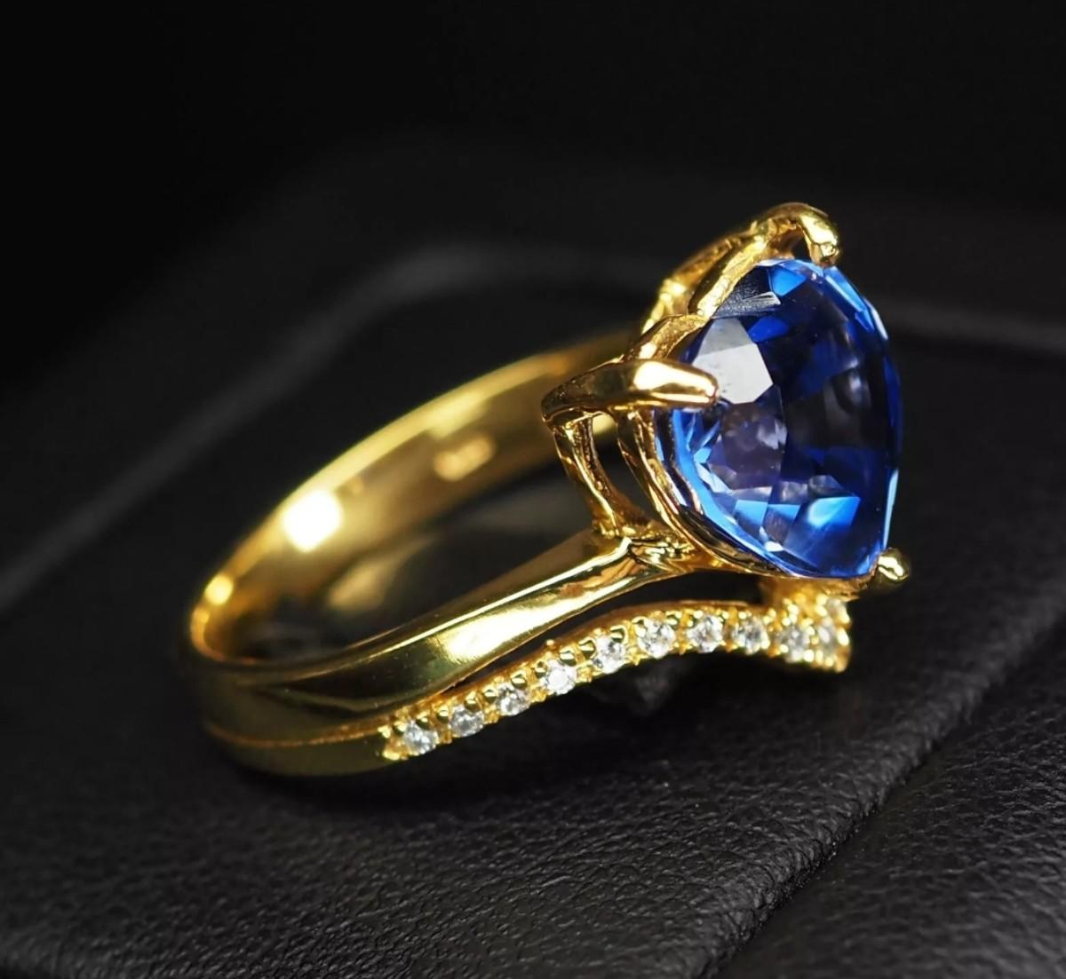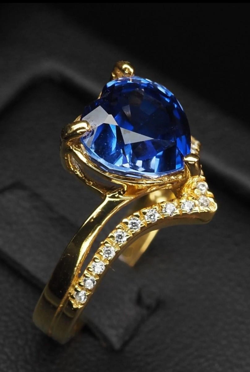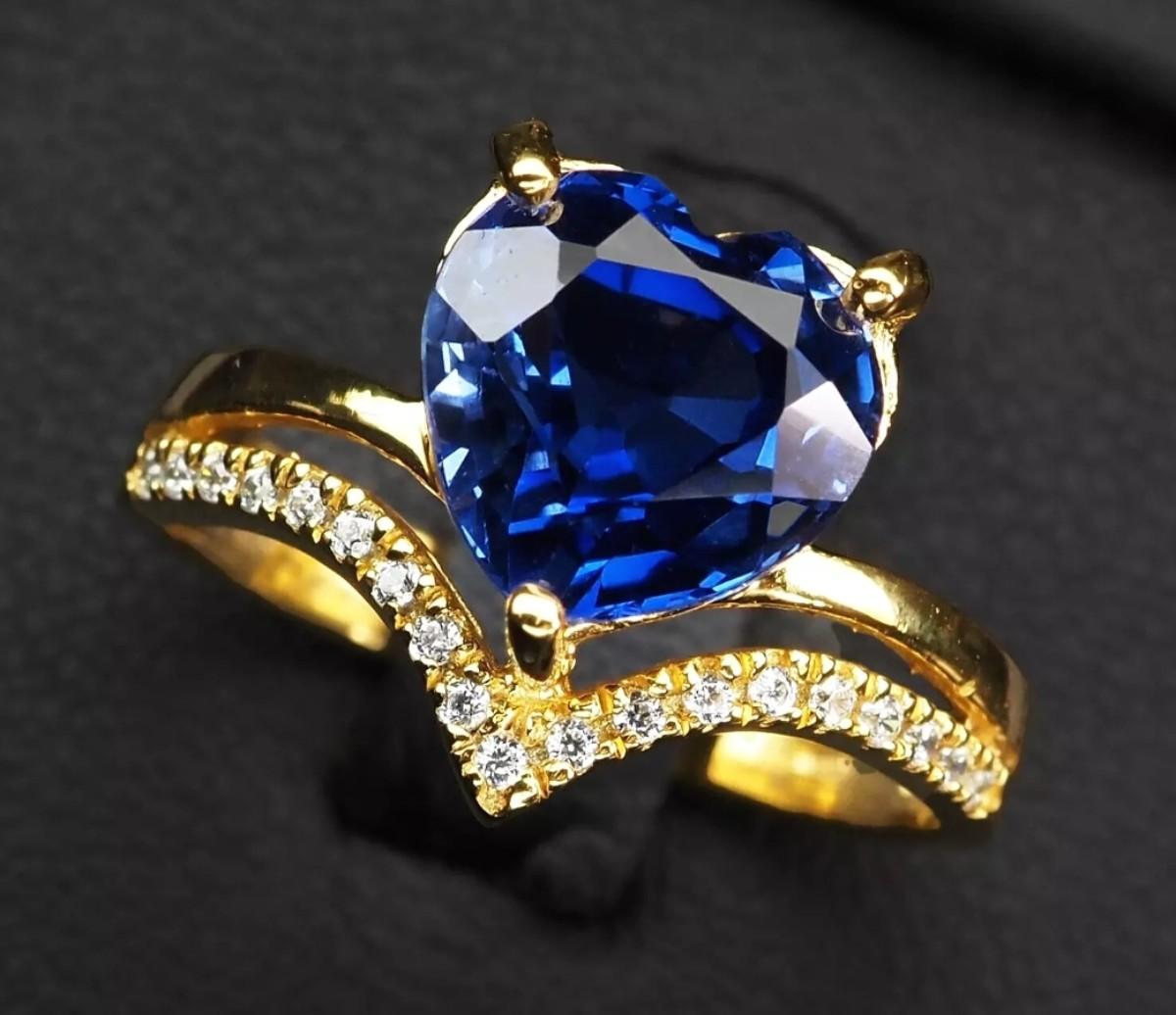 Vivid Blue Sapphire 3.70Ct Heart Rings in 925 Sterling Silver 24K Gold Overlay