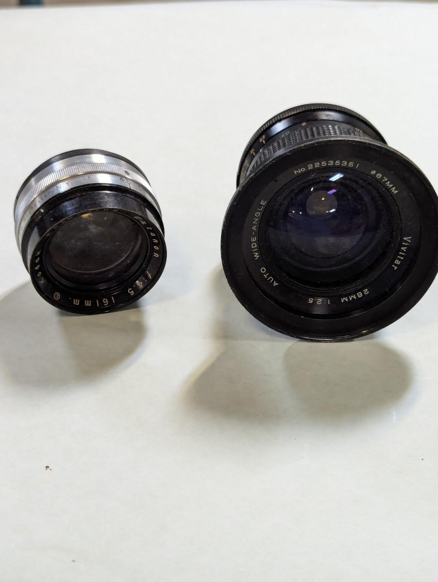 Vivitar 28m 1;2.5 Auto Wide Angle Lens & Kodak Enlarging Ektanopn f 4.5 161 mm Lens