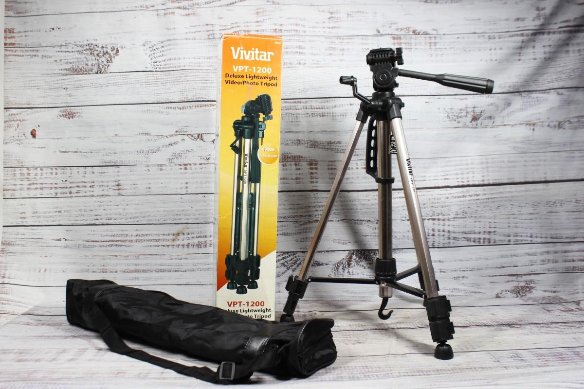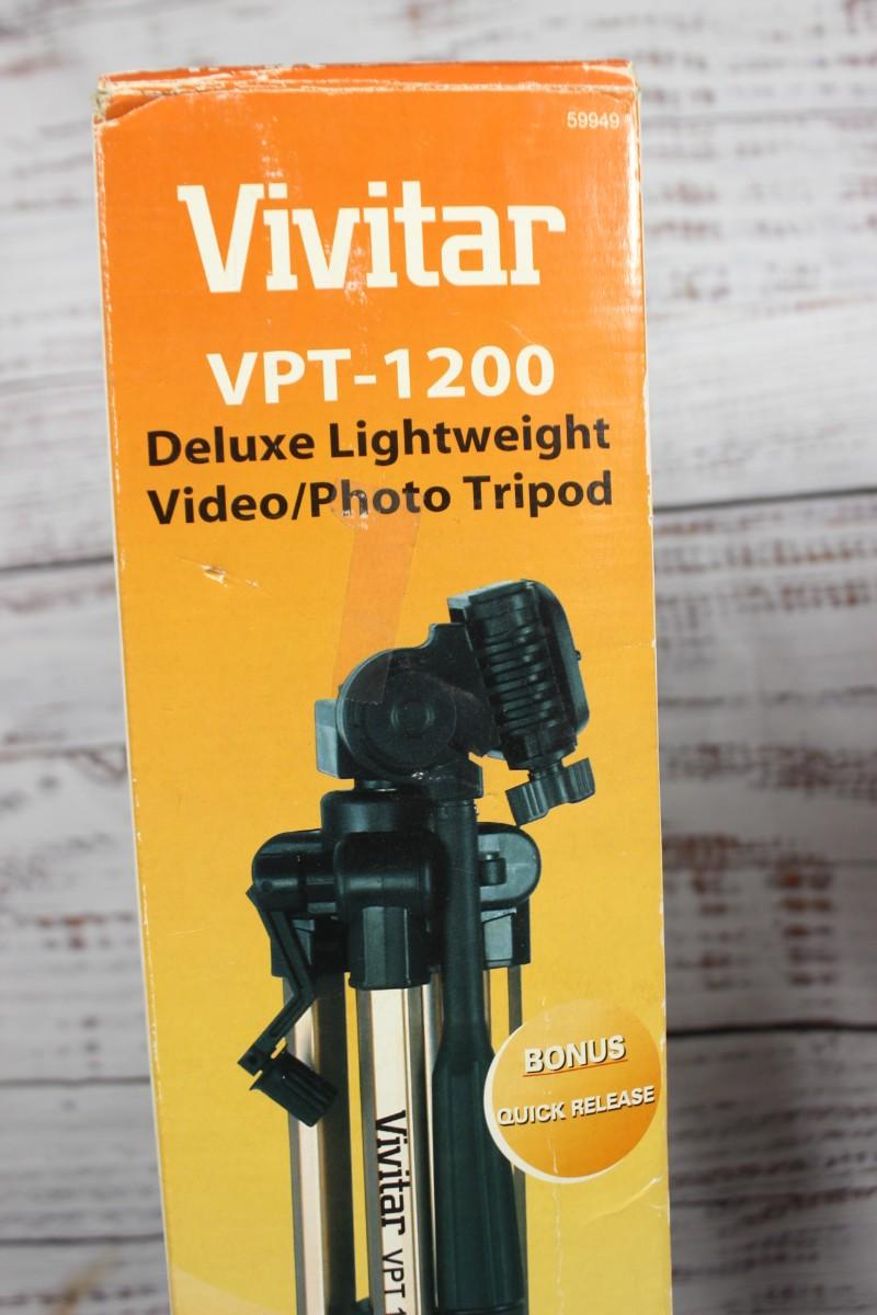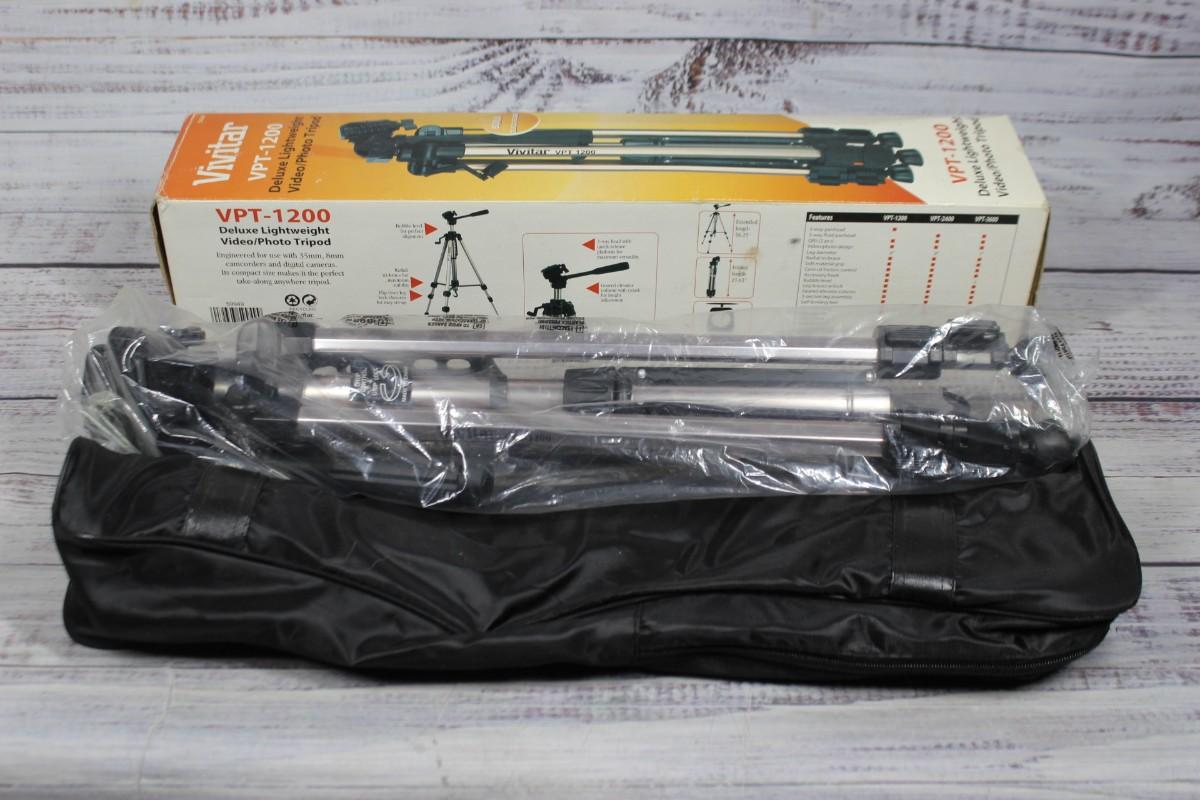Vivitar VPT-1200 Deluxe Lightweight Video Photo Tripod, there is no significant damage to the tripod and is in good useable condition. Comes with original box and travel bag. Check pictures for more details and for sizing.