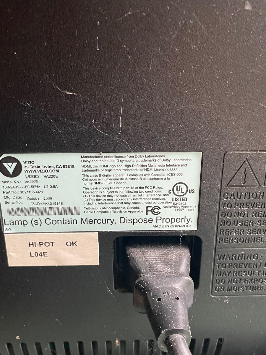 Both items powered on when plugged in. Flat screen TV is Model VA220E; it is missing it’s remote.