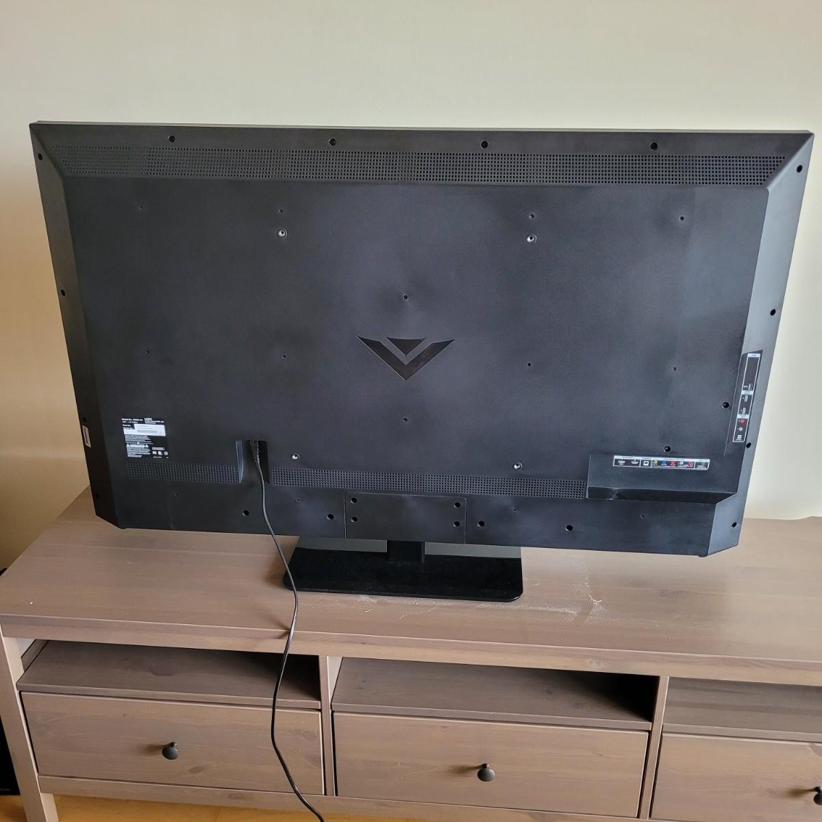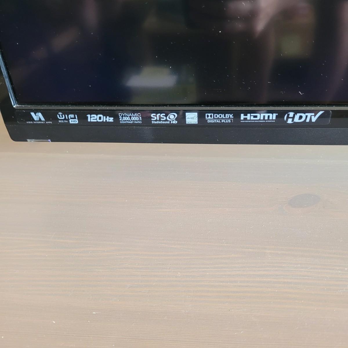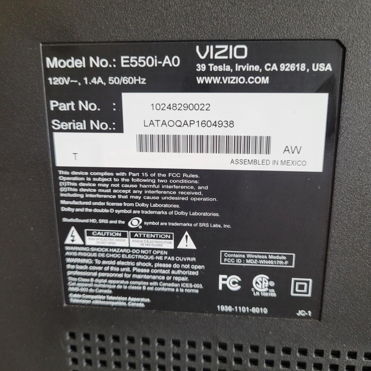 This lot includes a Vizio brand 55" LED TV. This TV has a resolution of 1920 x 1080 and operates at 120hz. The rear features ports for USB, HDMI, A/V, optical audio, ethernet, and RFU. TV powered on when plugged in. Includes power and HDMI cord.