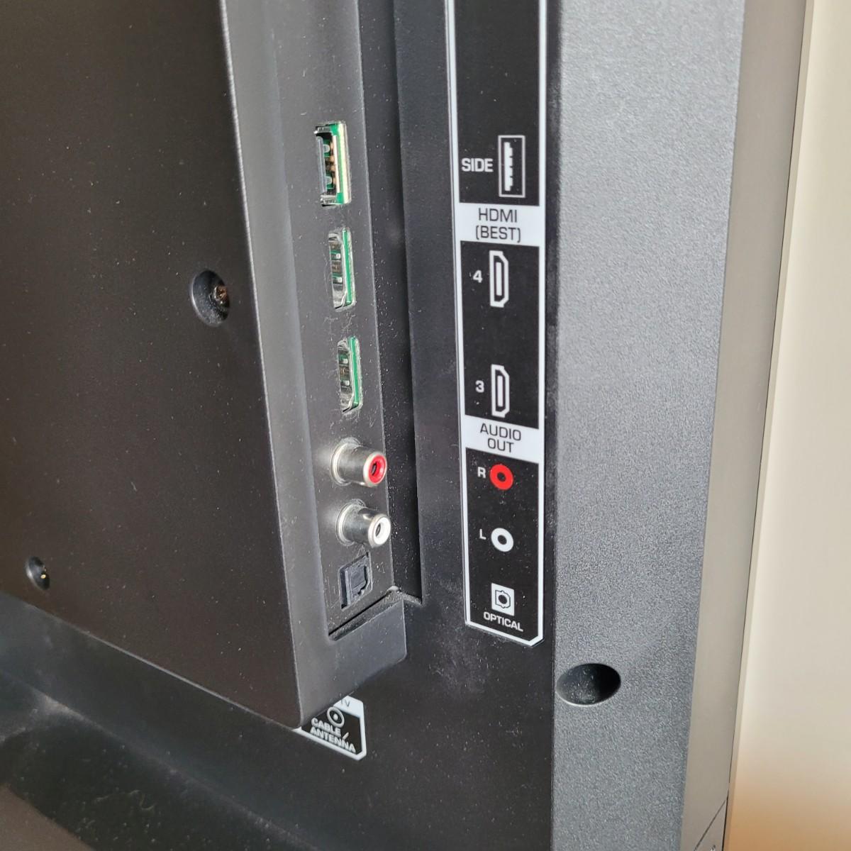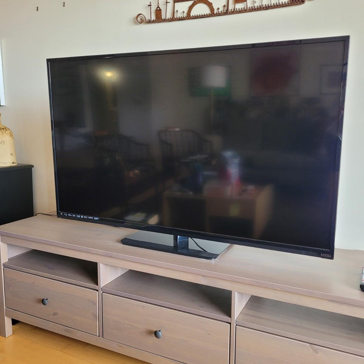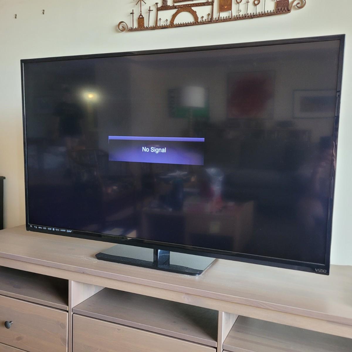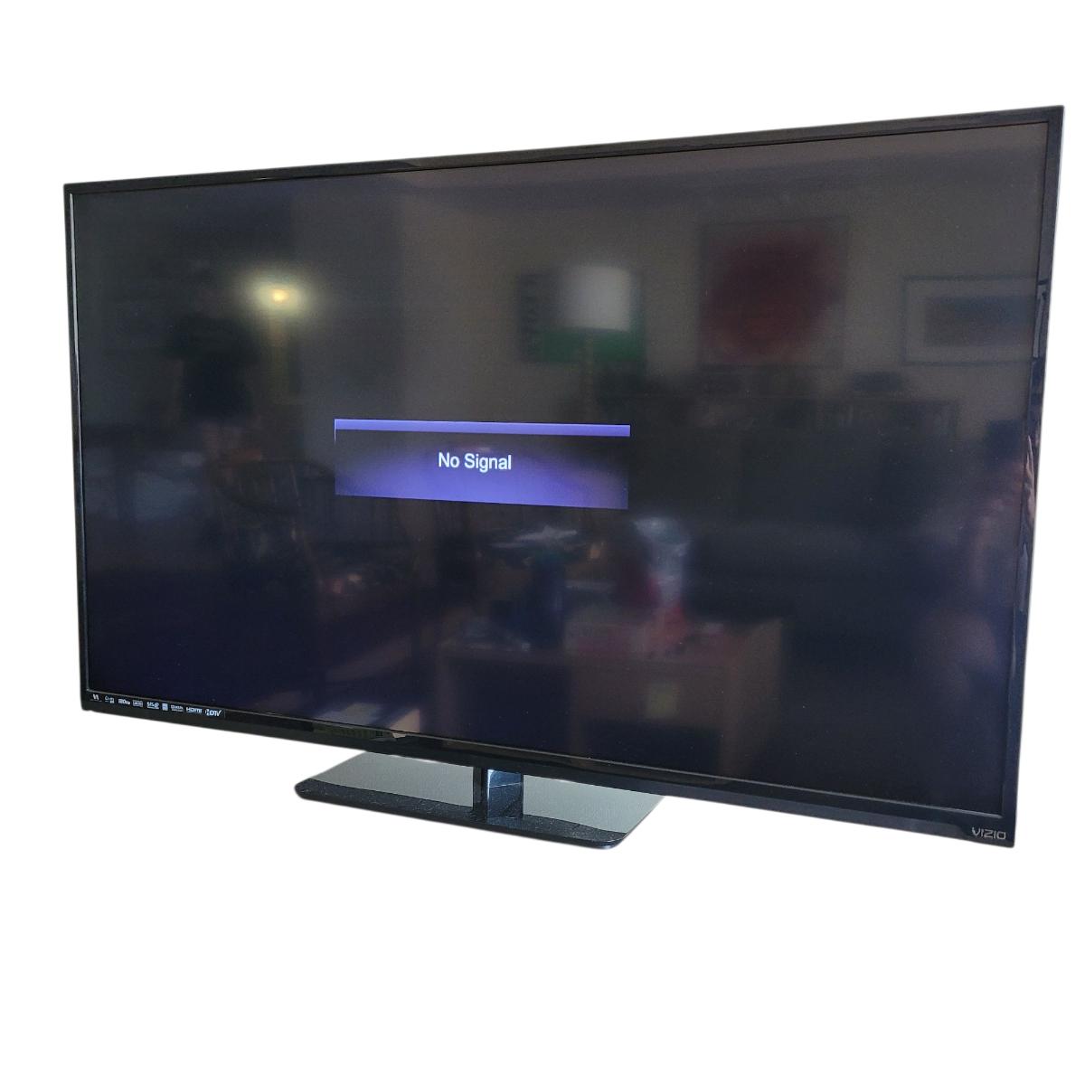 This lot includes a Vizio brand 55" LED TV. This TV has a resolution of 1920 x 1080 and operates at 120hz. The rear features ports for USB, HDMI, A/V, optical audio, ethernet, and RFU. TV powered on when plugged in. Includes power and HDMI cord.
