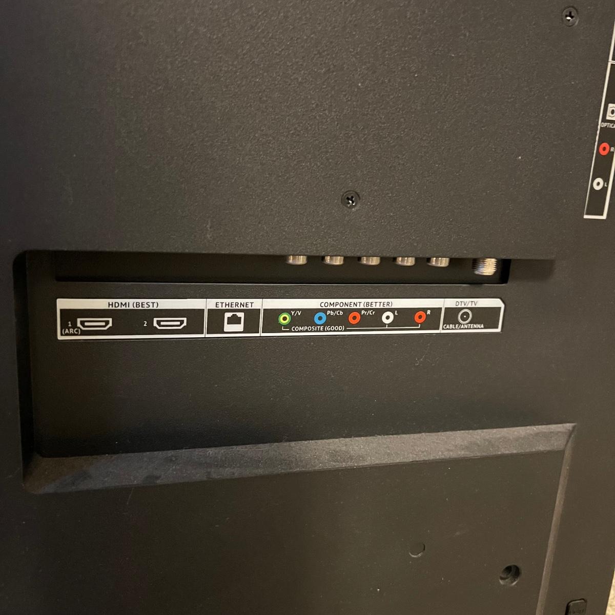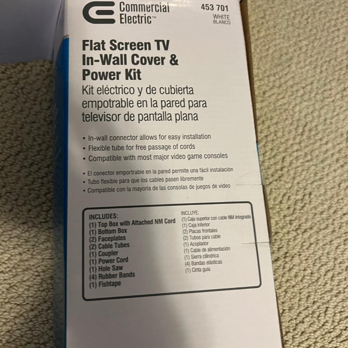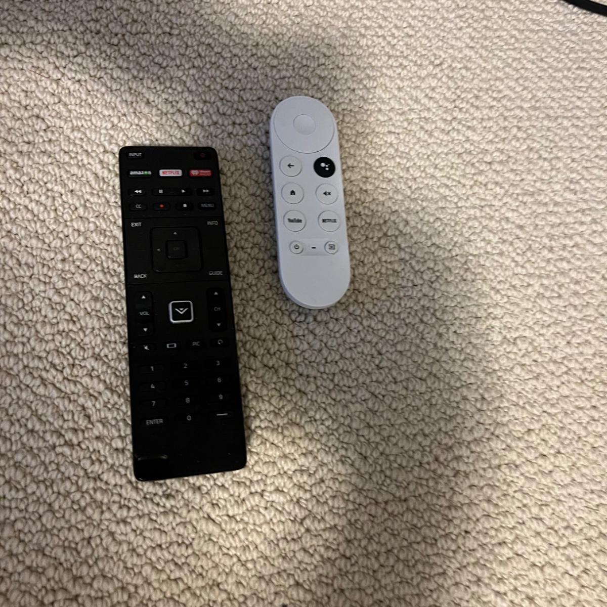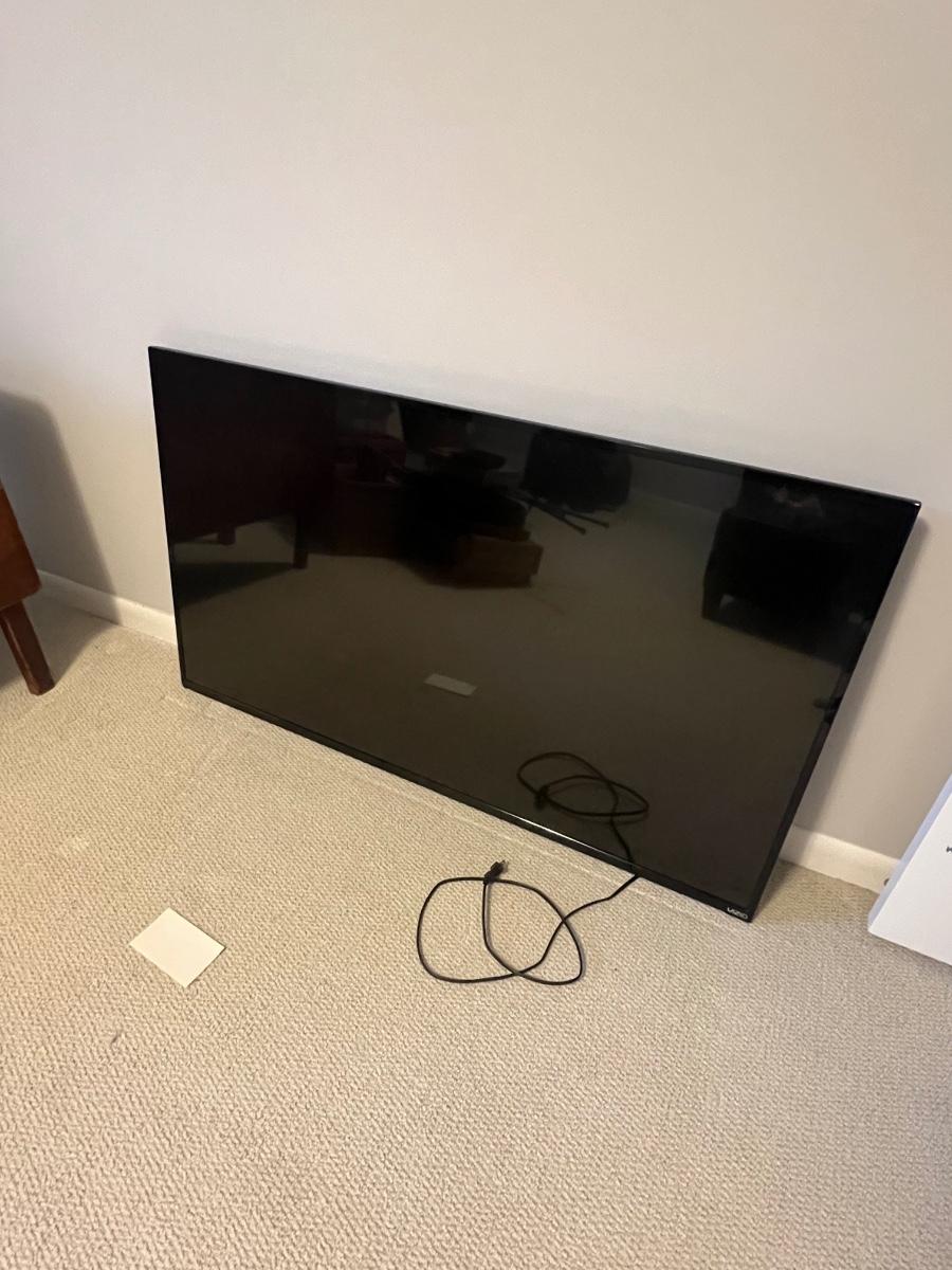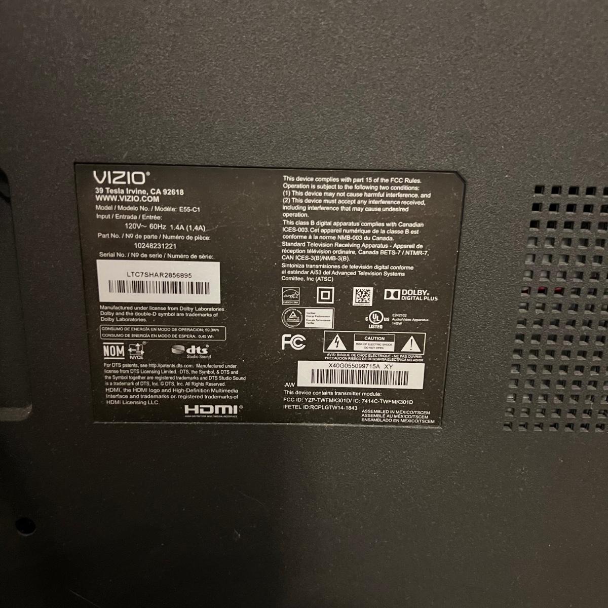 This Vizio E55-C1 smart TV powers on when plugged in. Television also includes in wall TV mounting kit and wall mount bracket as well as remote controls.