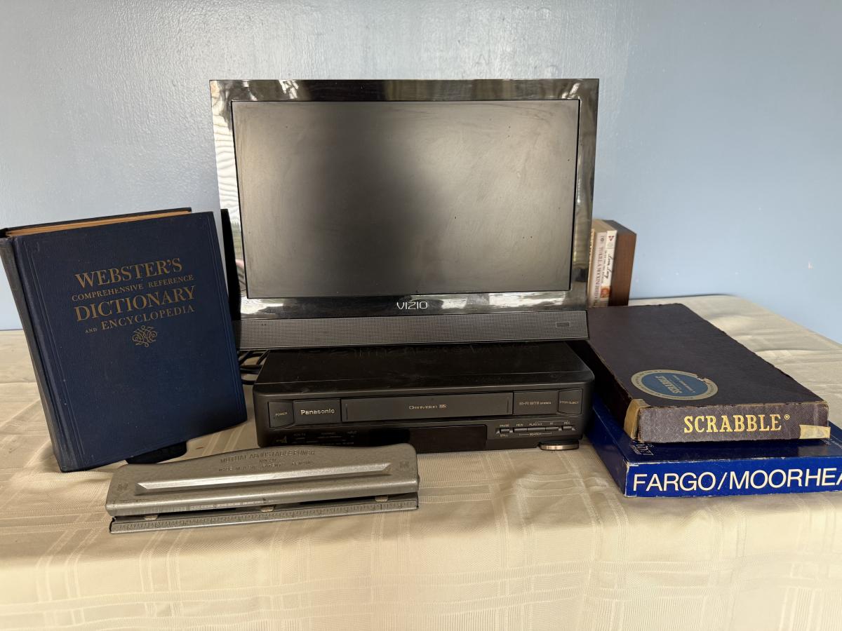 Vizio and Panasonic Electronics w/board games, dictionary, 3 hole punch