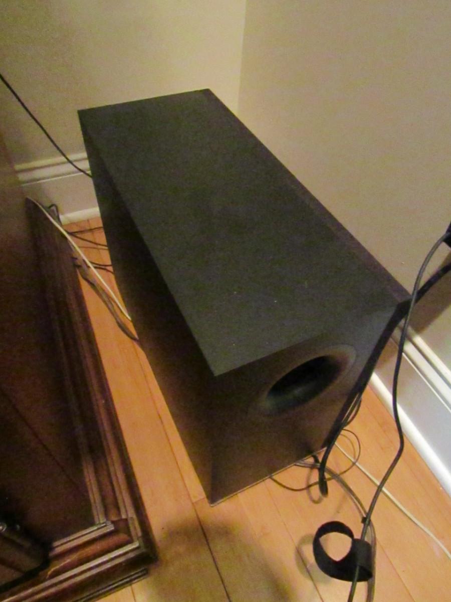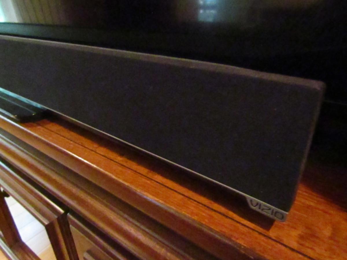 Vizio Surround Sound System. Four piece set: two small speakers, sound bar, and subwoofer.