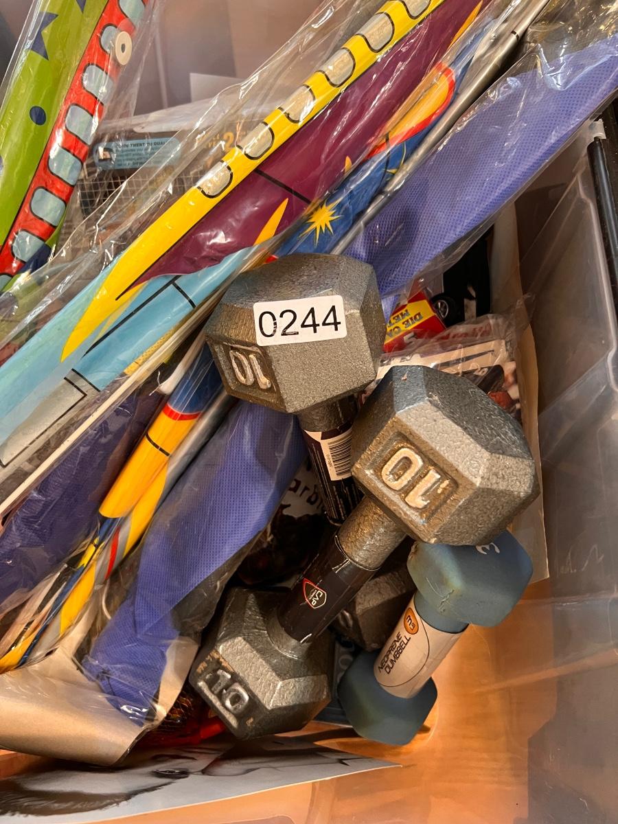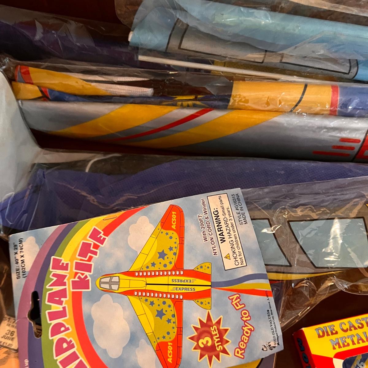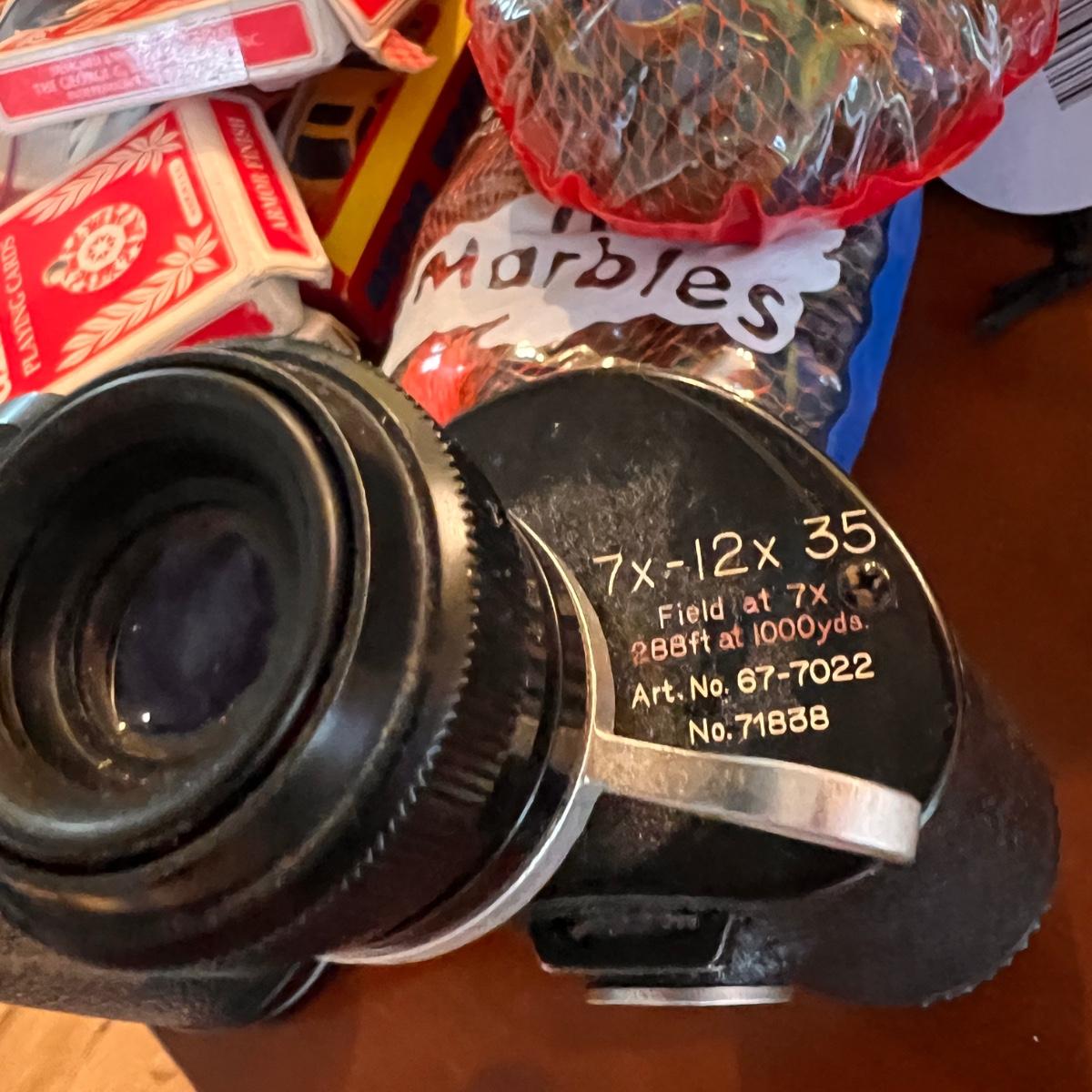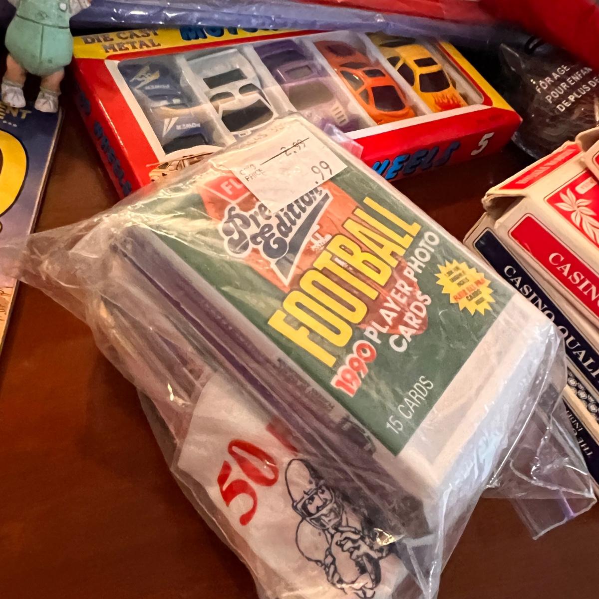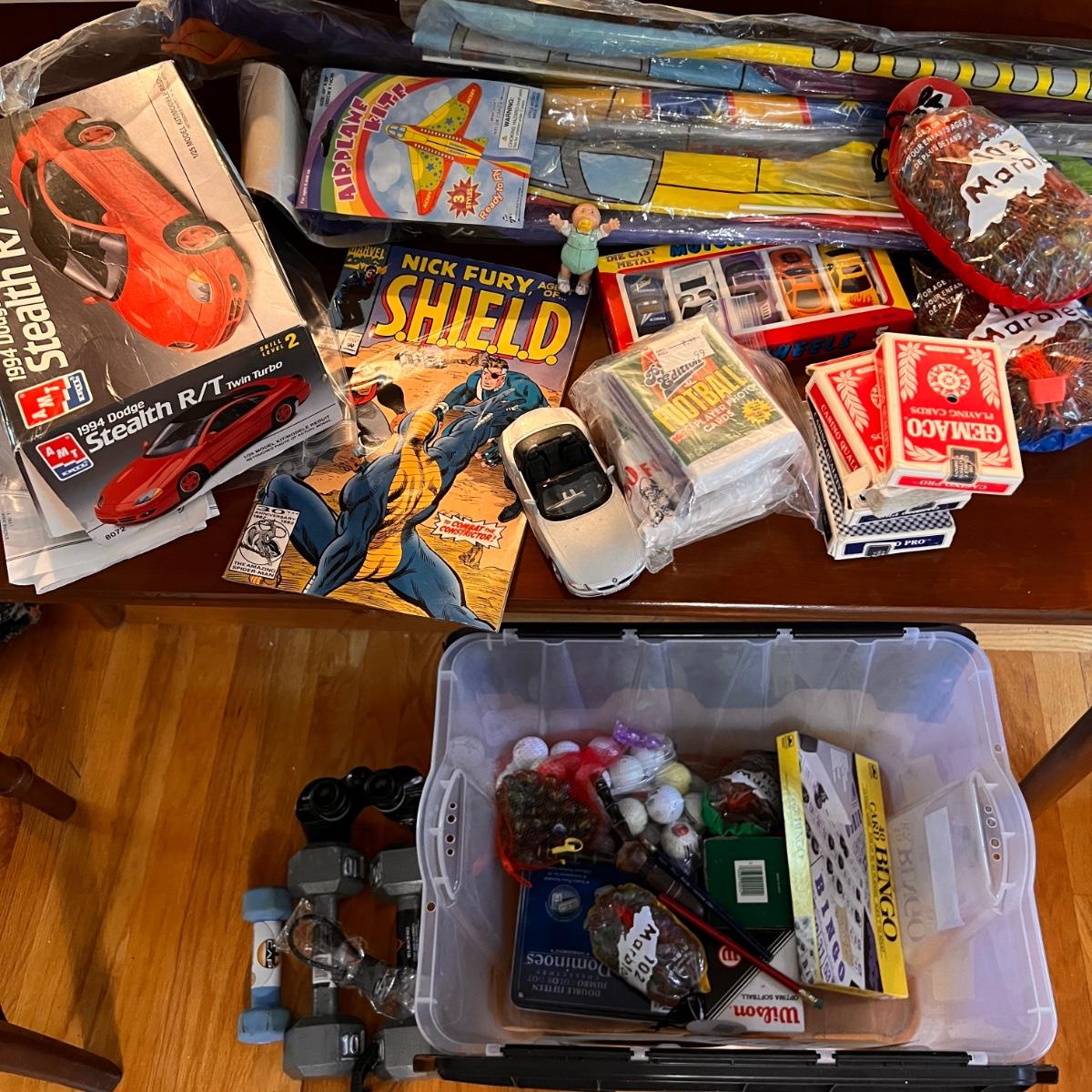 Mixed lot including football cards, kites, marbles, playing cards, weights, binoculars, comic book and more.