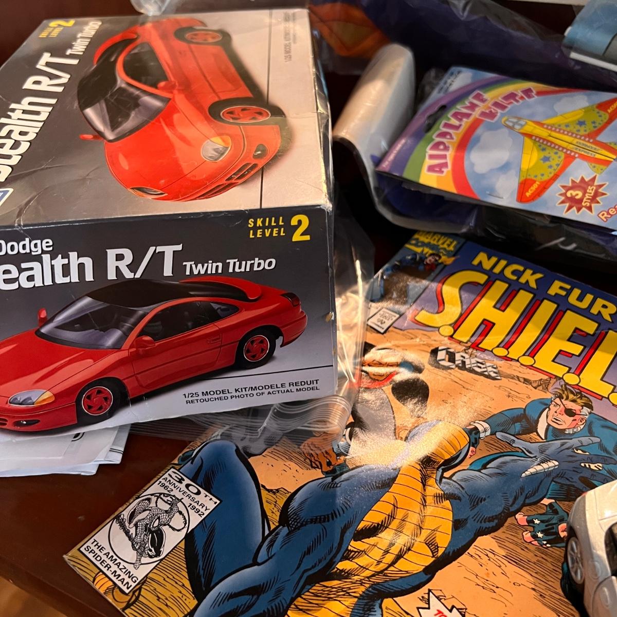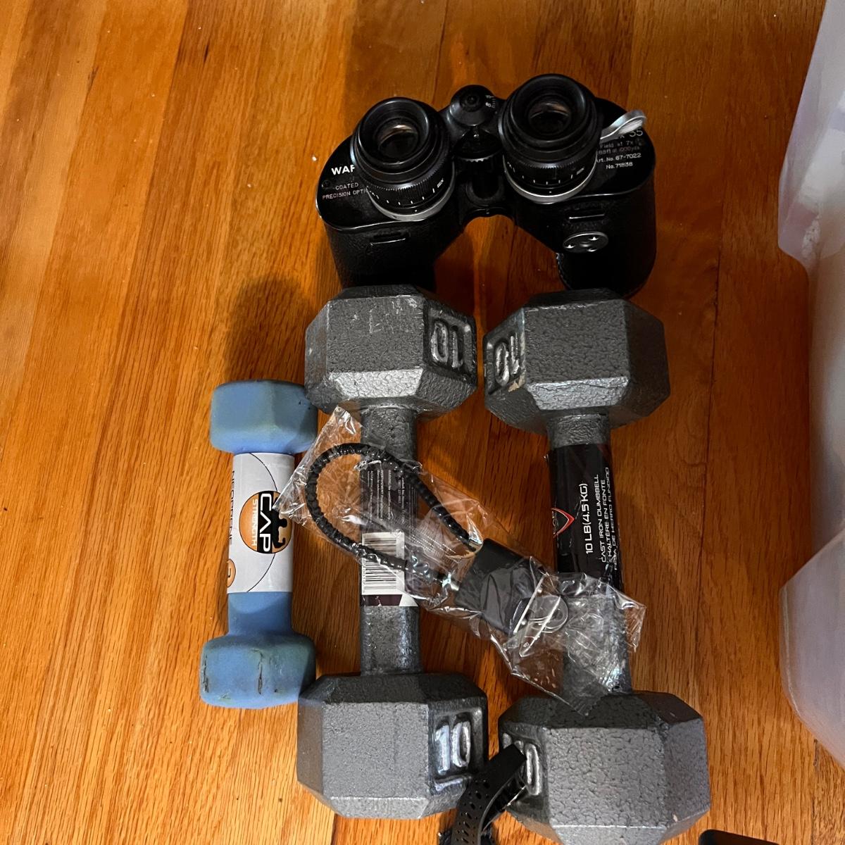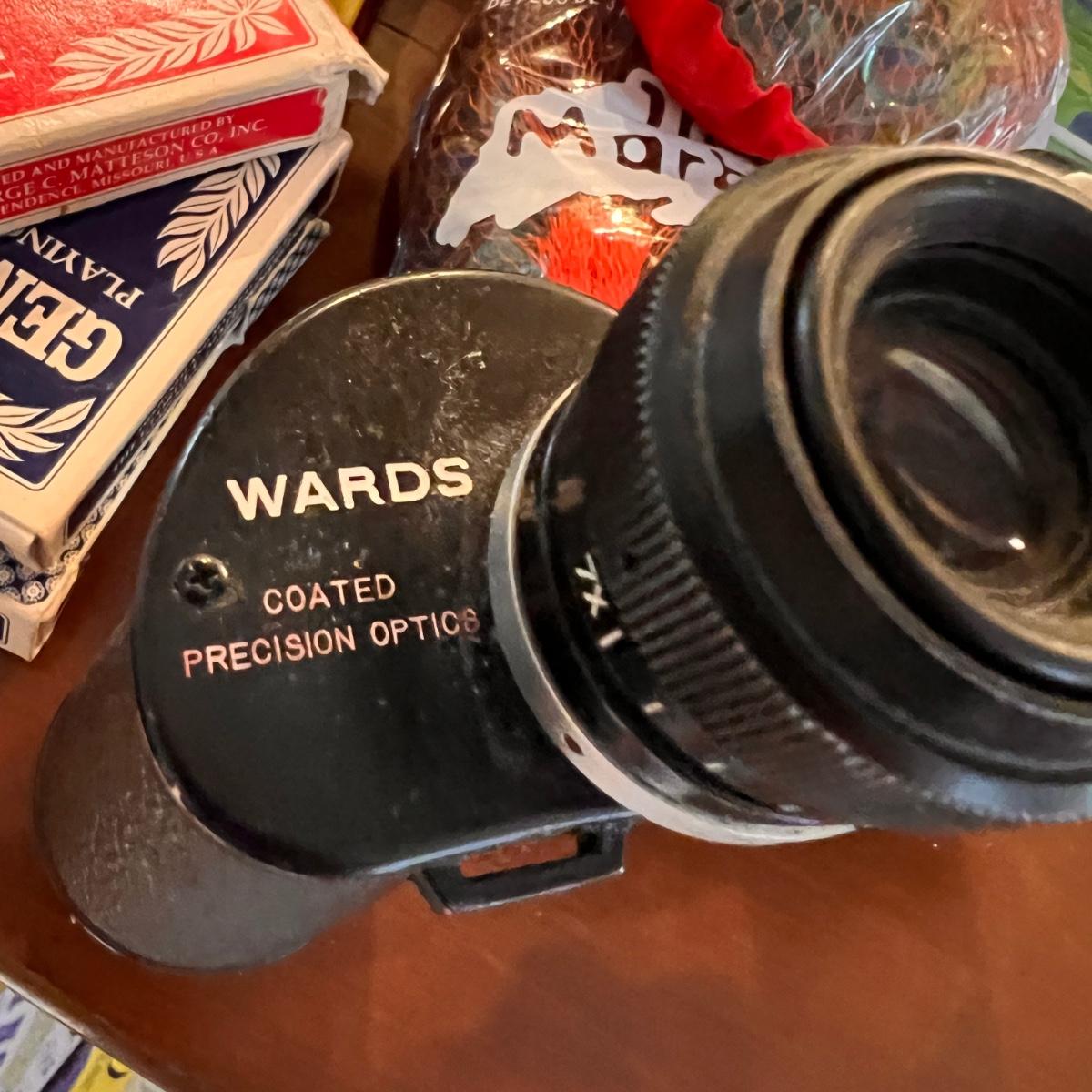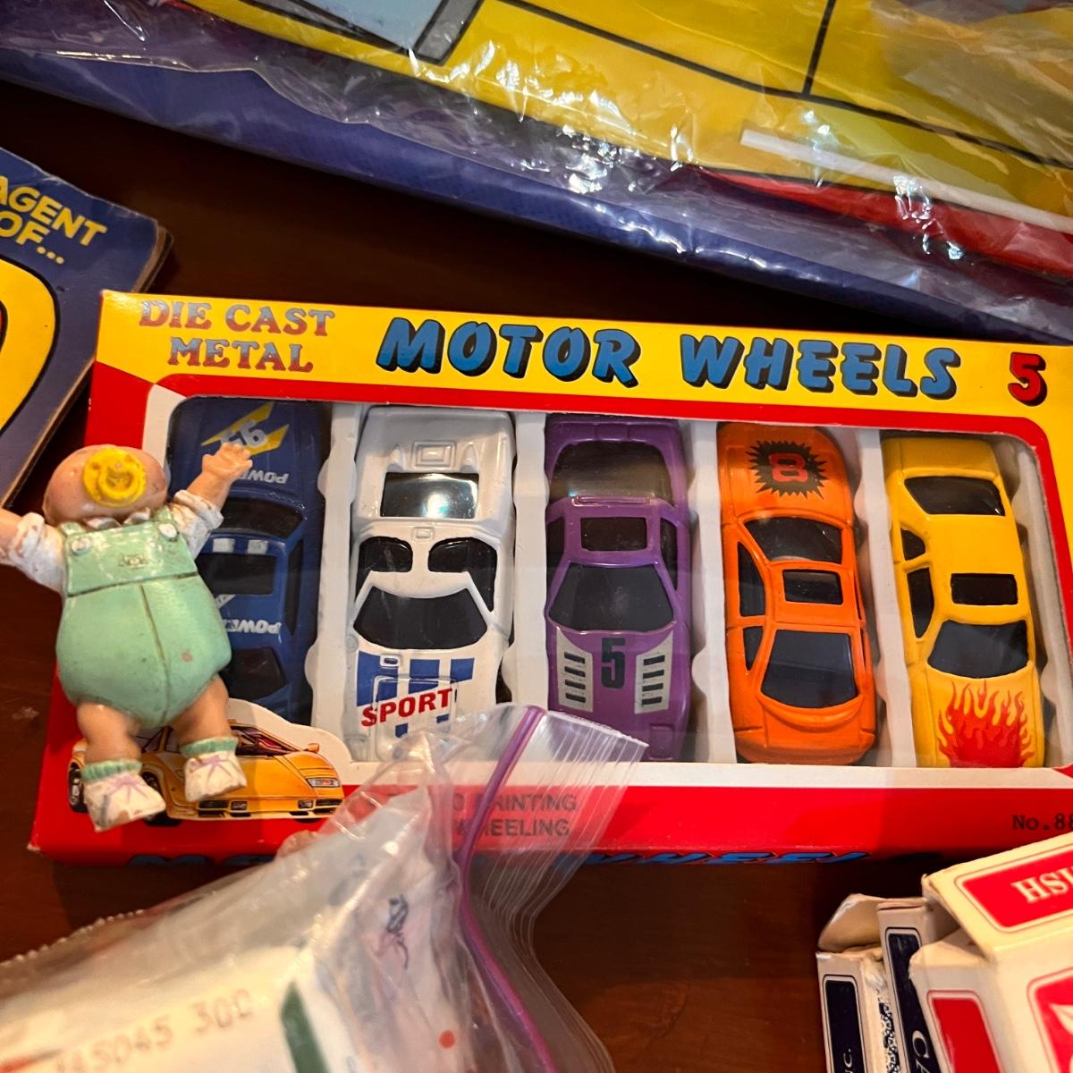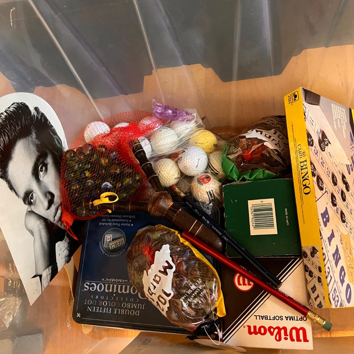 Mixed lot including football cards, kites, marbles, playing cards, weights, binoculars, comic book and more.