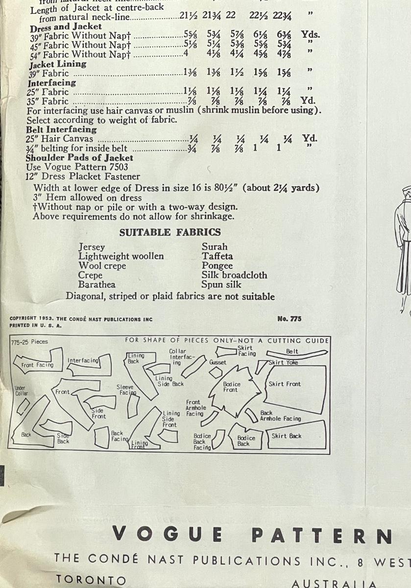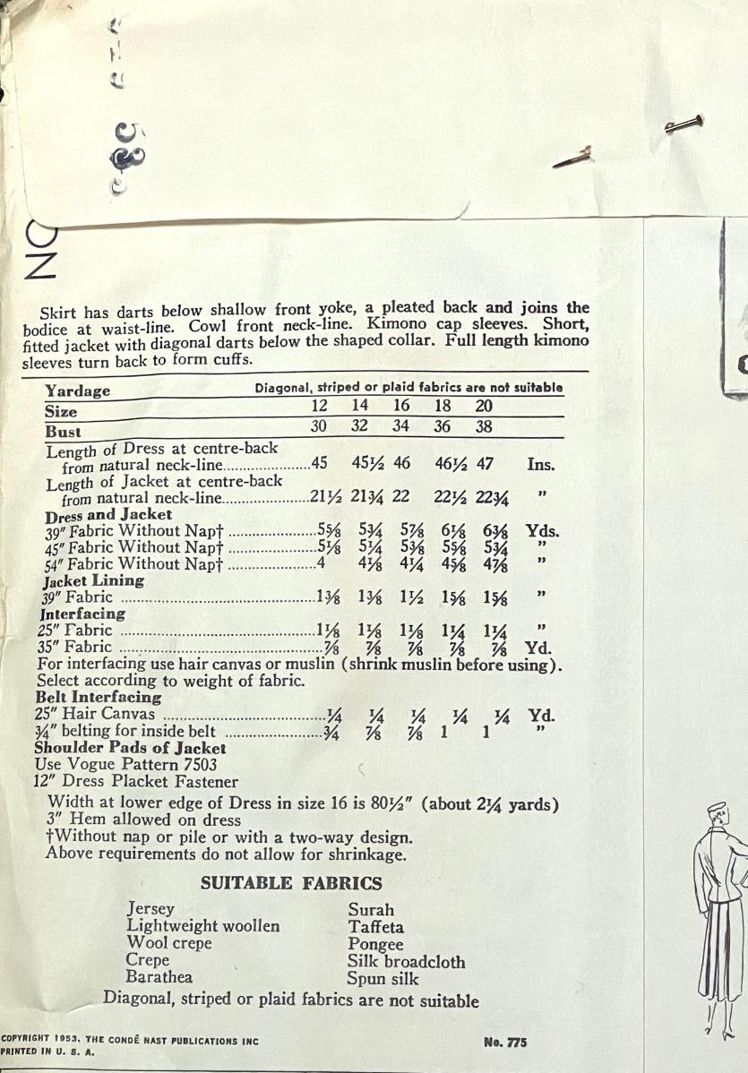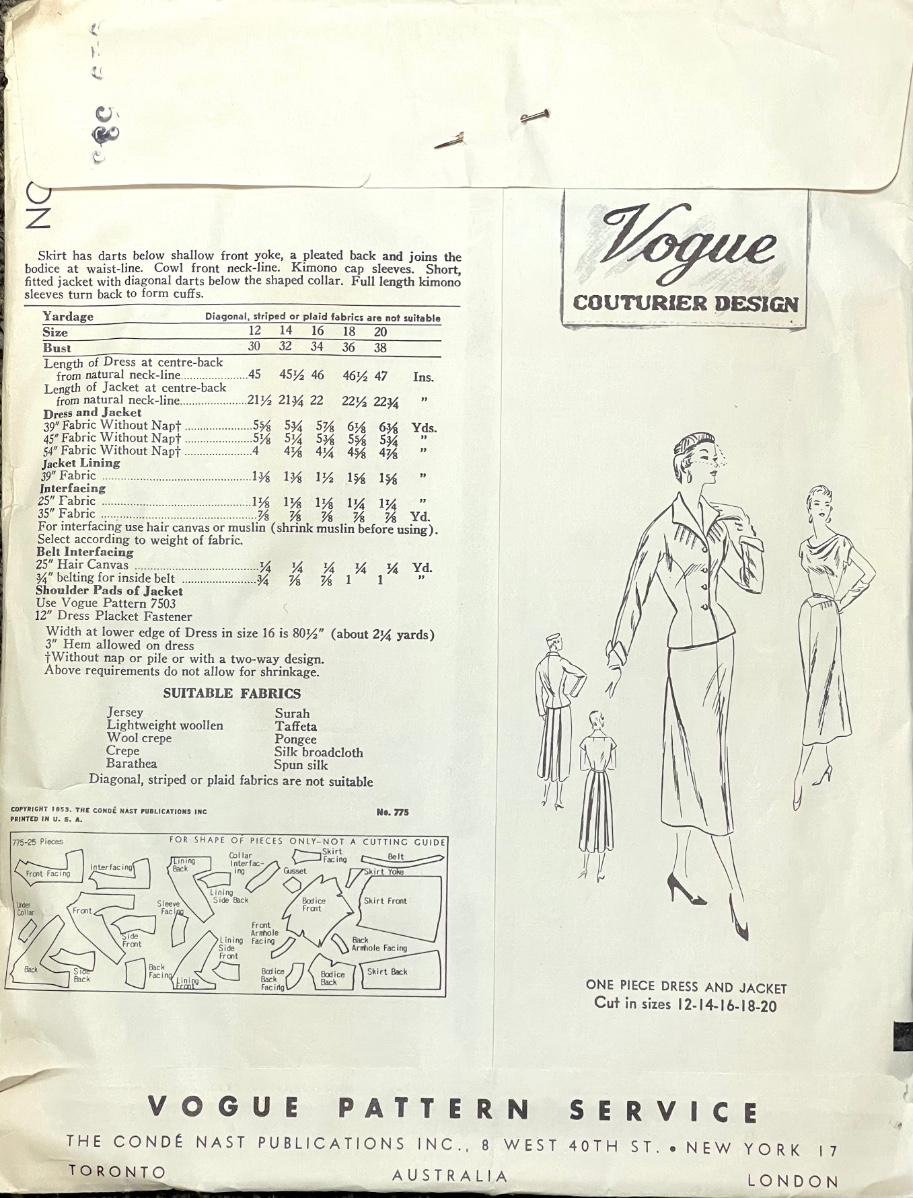 Vogue Couturier Design No. 775 One piece dress and jacket 1953. All pieces verified.