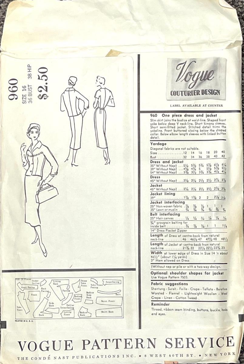 Vogue Couturier Design Printed and Perforated Pattern No. 960 size 16 bust 36 hip 38. All pieces verified.
