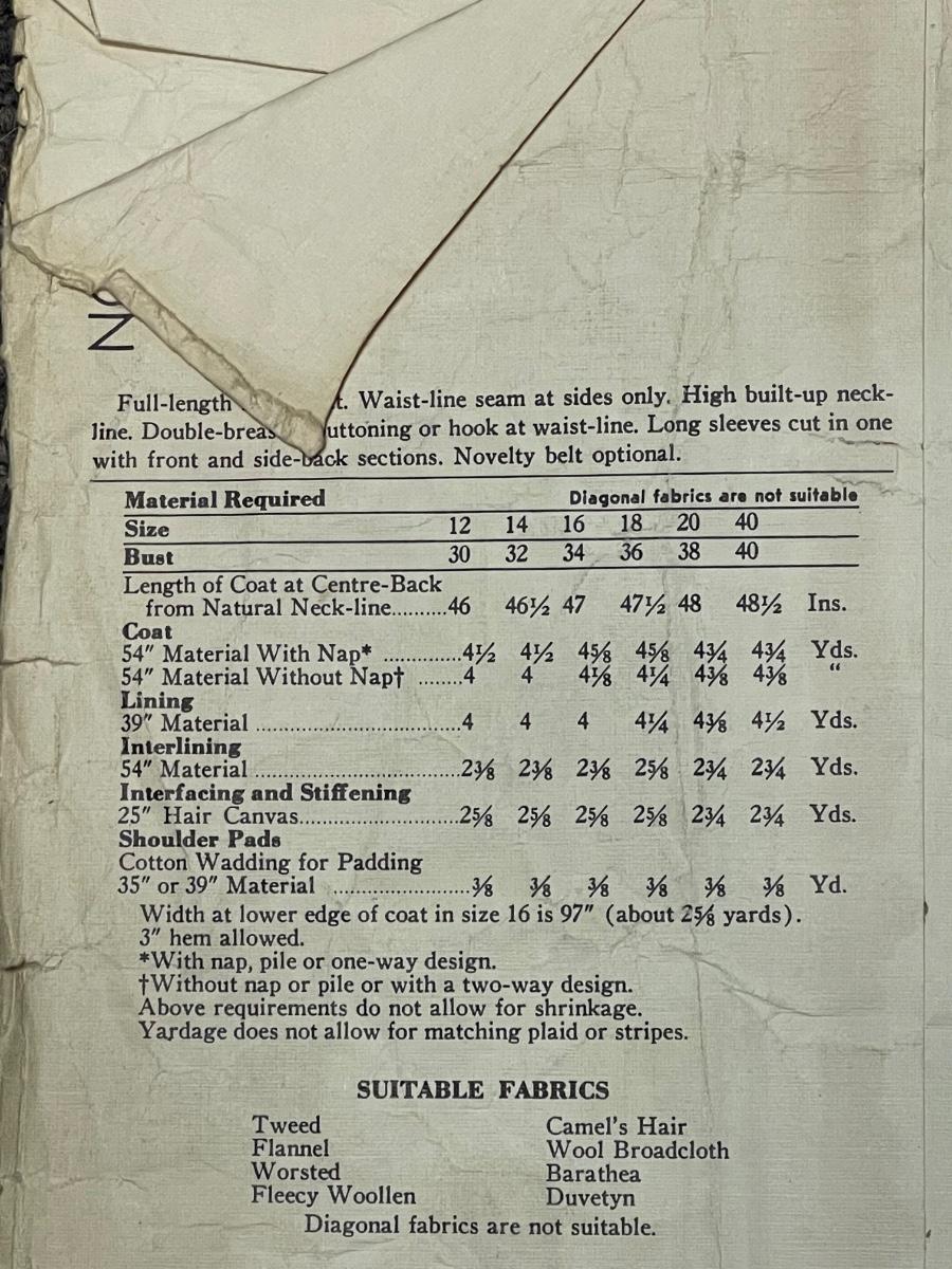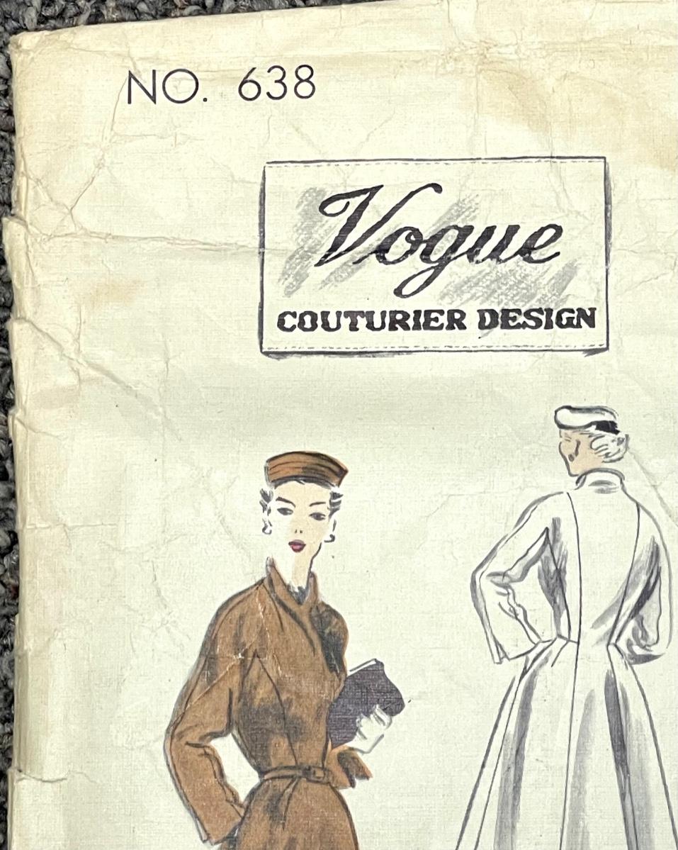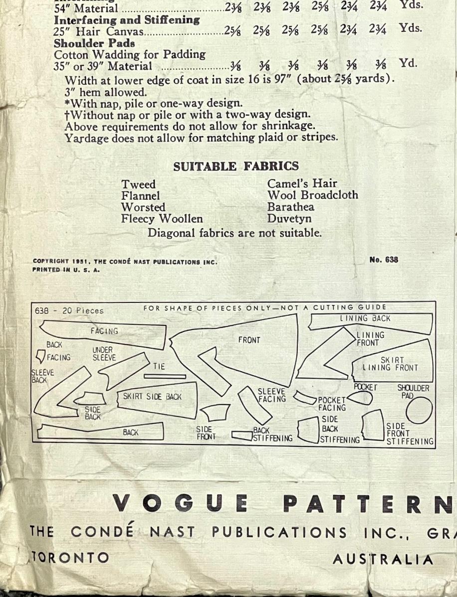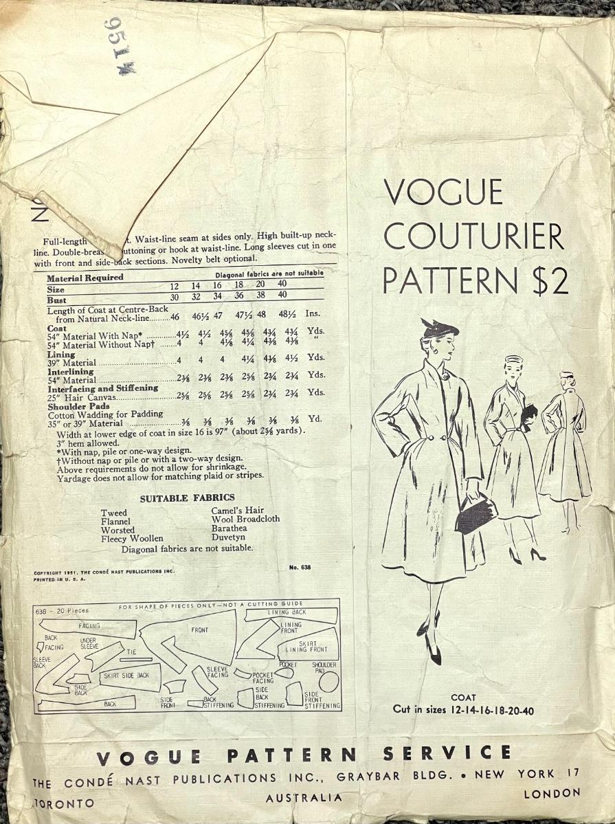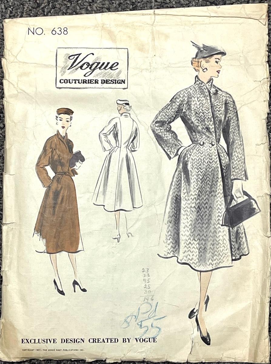 Vogue Couturier Exclusive Design No. 638 1951 coat size 14 bust 32 hip 35. All pieces verified.