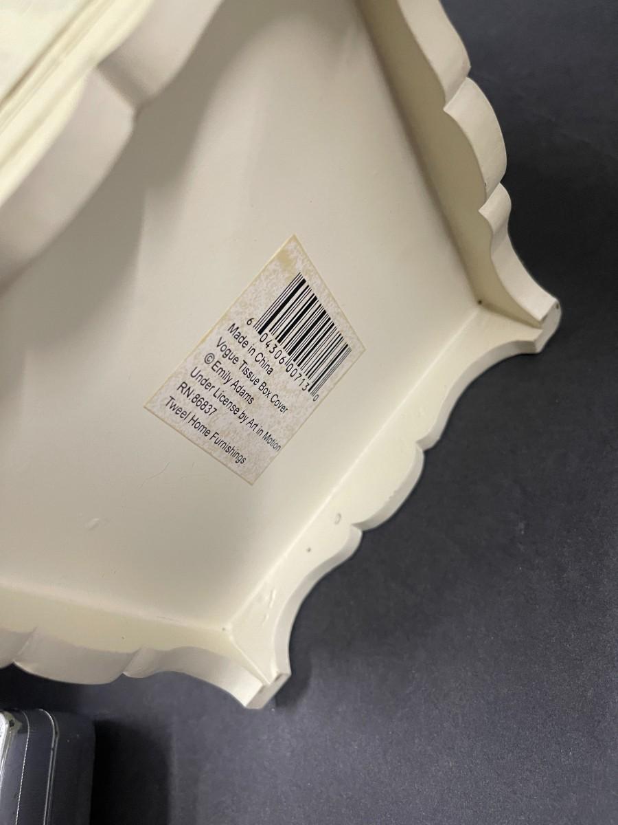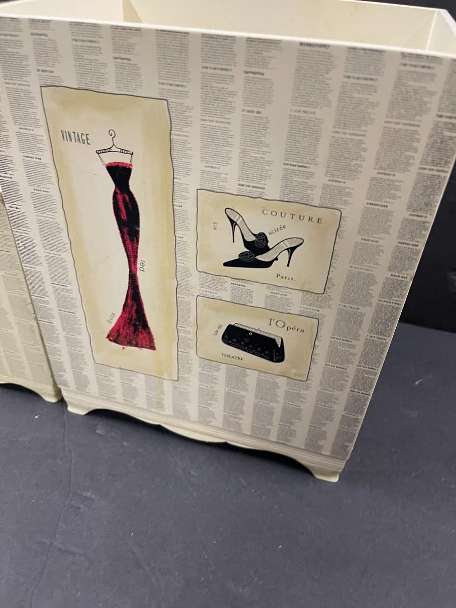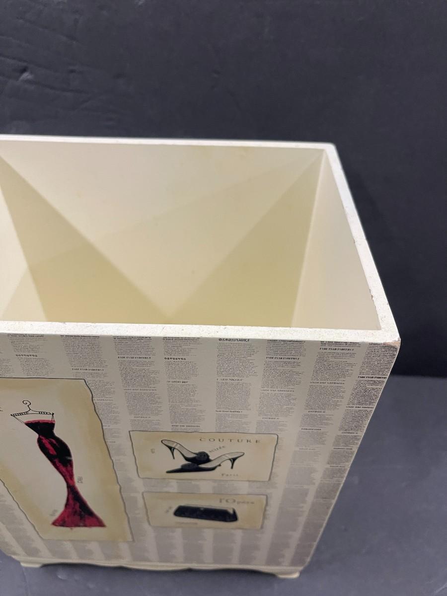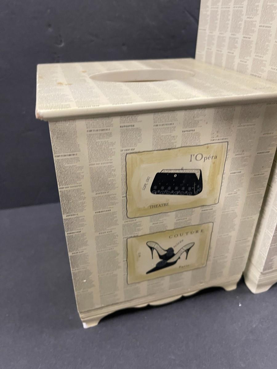 Vogue Inspired Trash Can and Tissue Box. There is a chip to one of the feet of the tissue box. Trashcan: 6" x 10" . Tissue box: 6" x 7"
