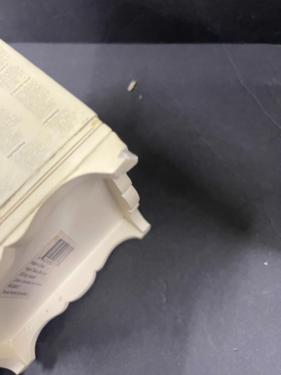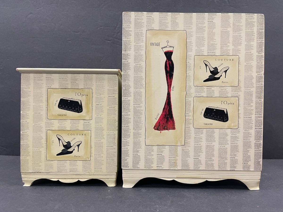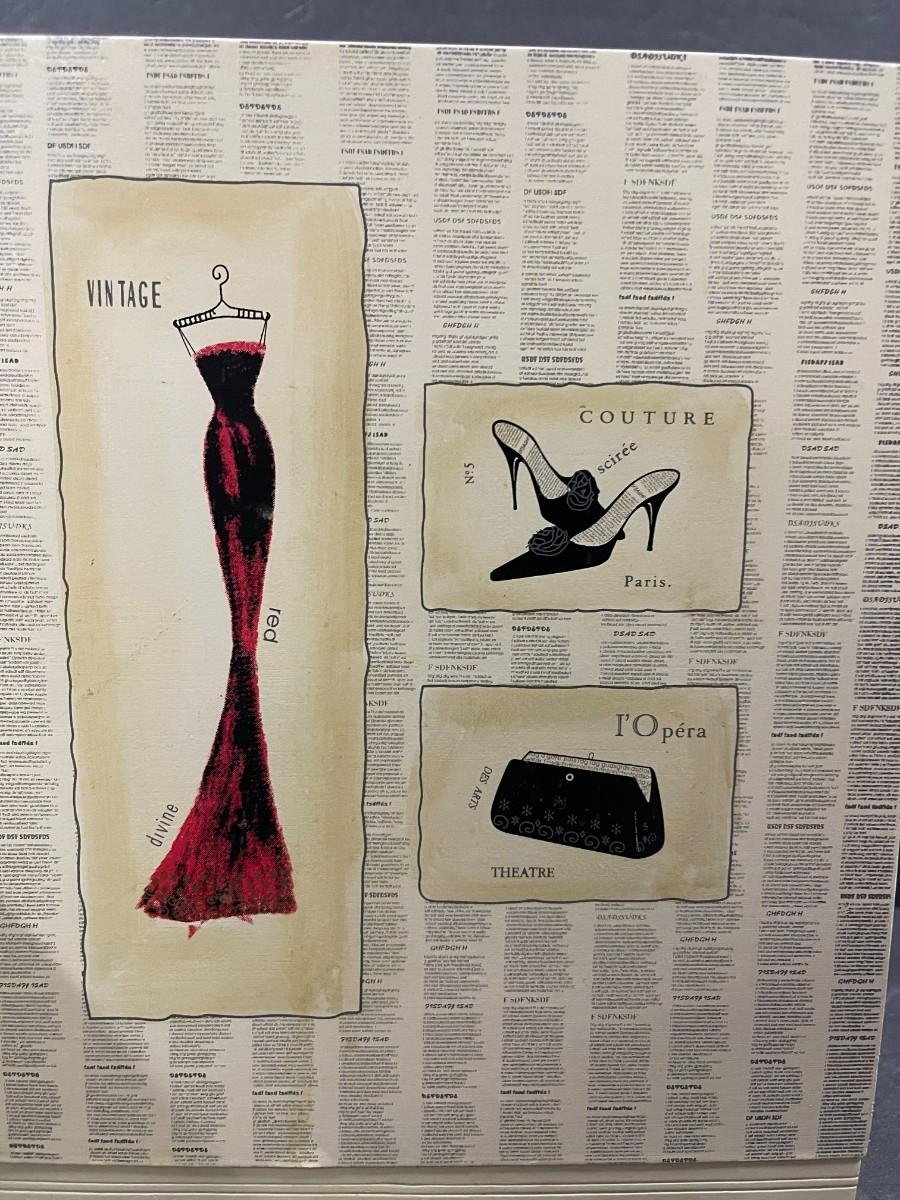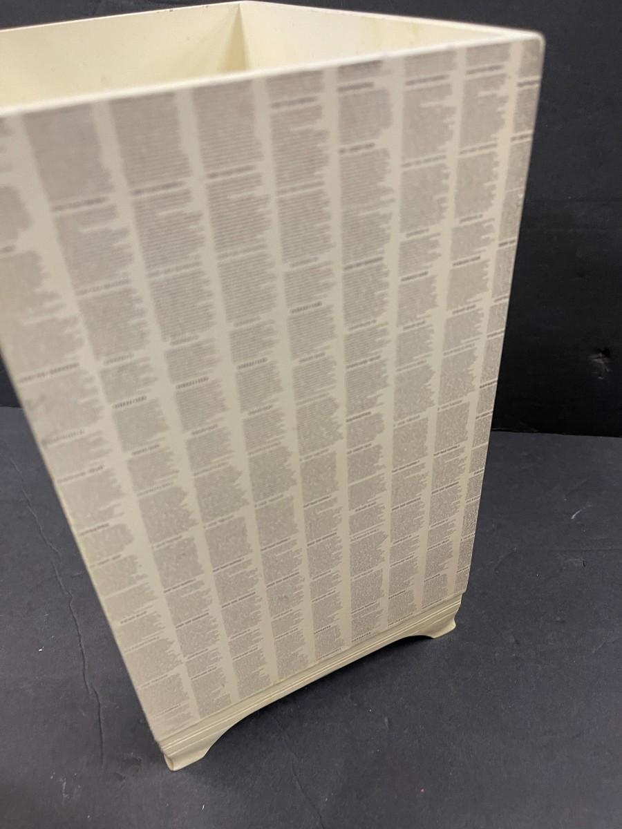 Vogue Inspired Trash Can and Tissue Box. There is a chip to one of the feet of the tissue box. Trashcan: 6" x 10" . Tissue box: 6" x 7"