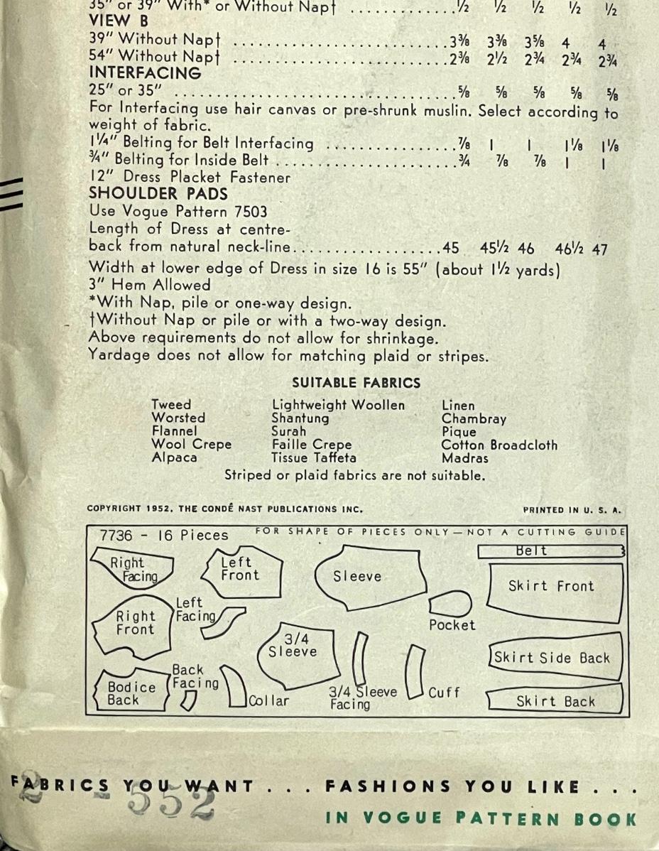 Vogue Pattern No. 7736 size 12 bust 30 hip 33 1952. All pieces verified.