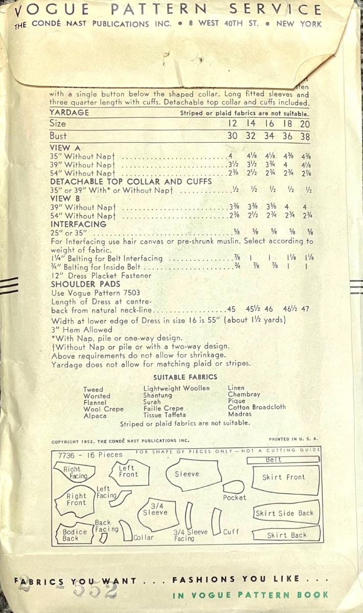 Vogue Pattern No. 7736 size 12 bust 30 hip 33 1952. All pieces verified.