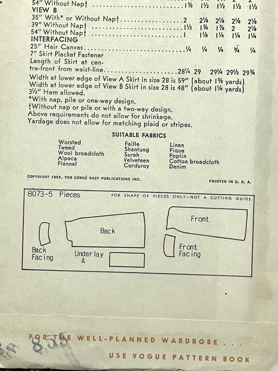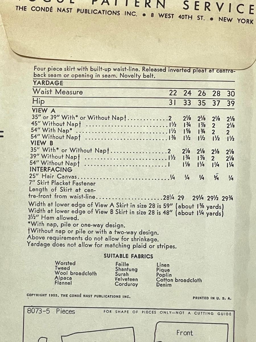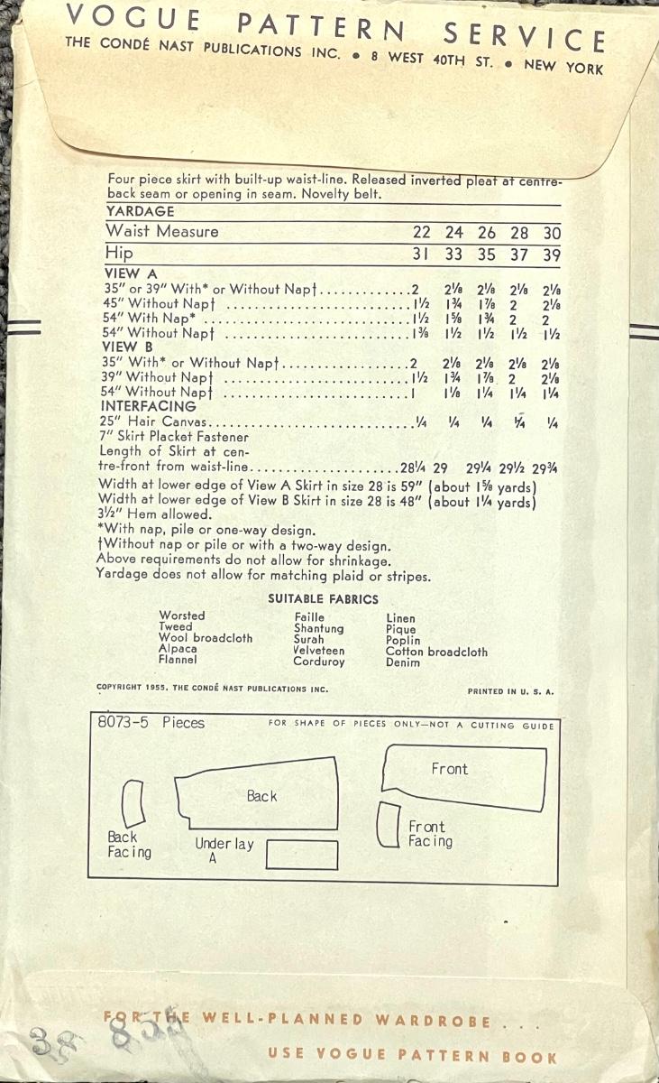 Vogue Pattern No. 8073 waist 24 hip 33 1955. All pieces verified.