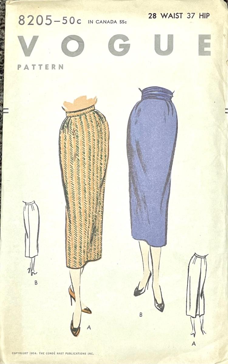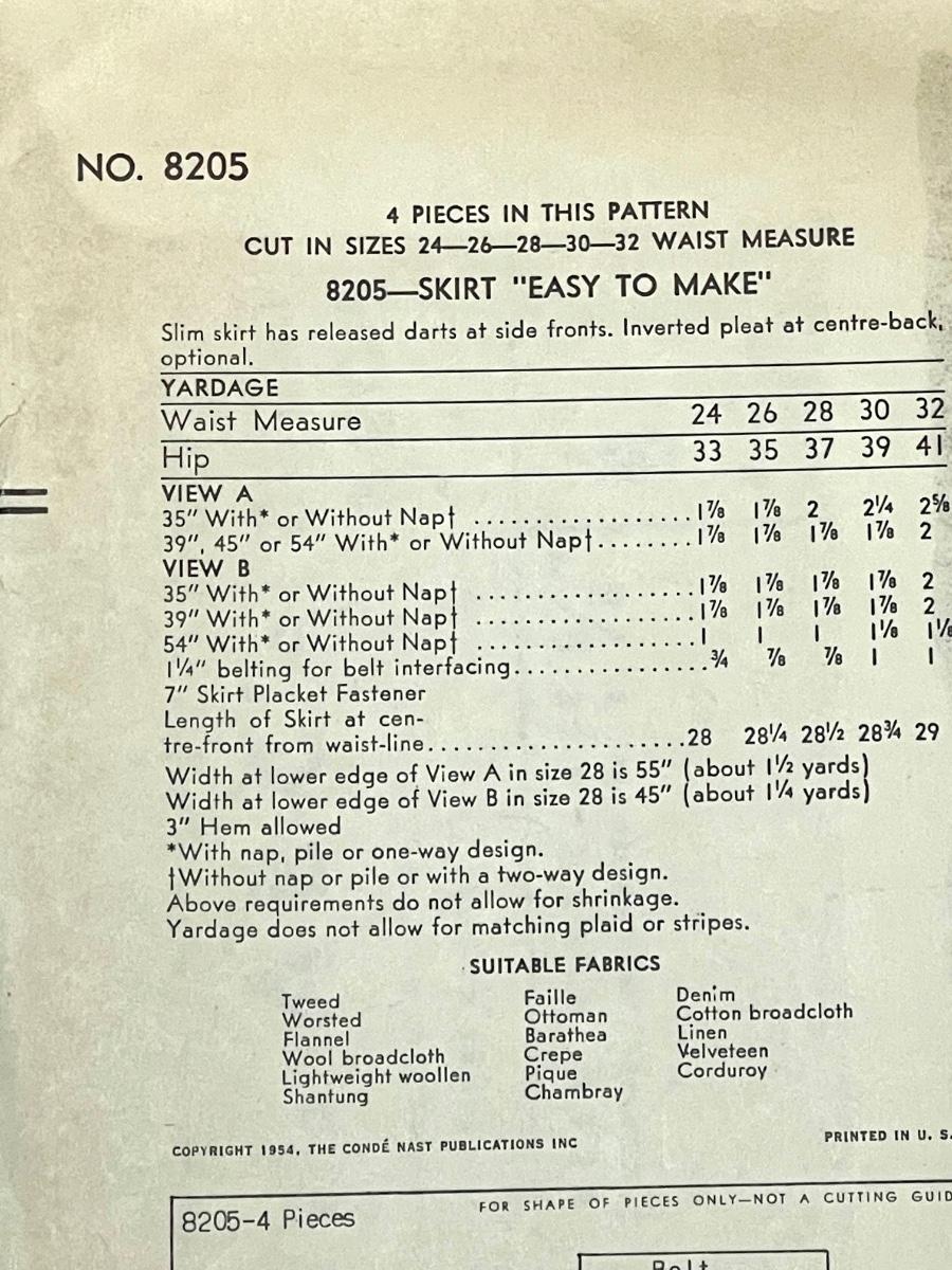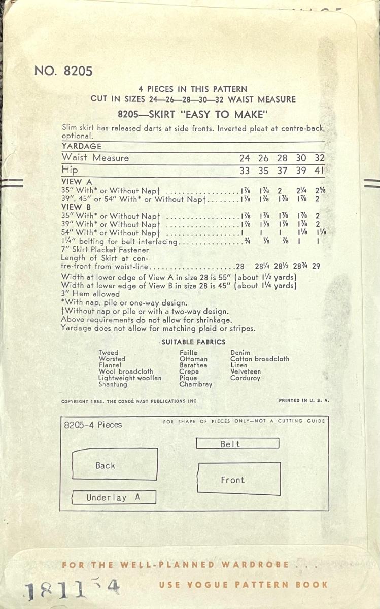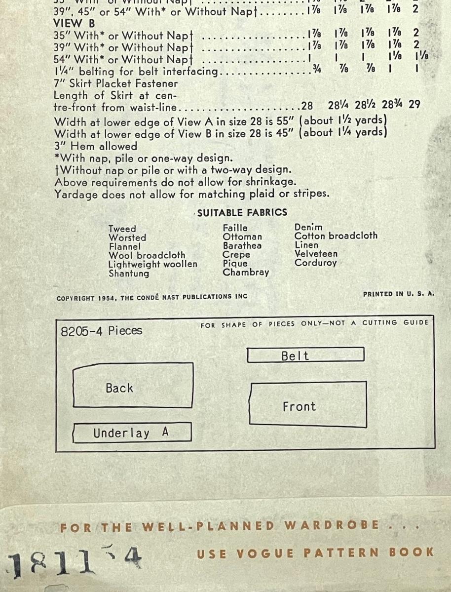 Vogue Pattern No. 8205 waist 28 hip 37 1954. All pieces verified.