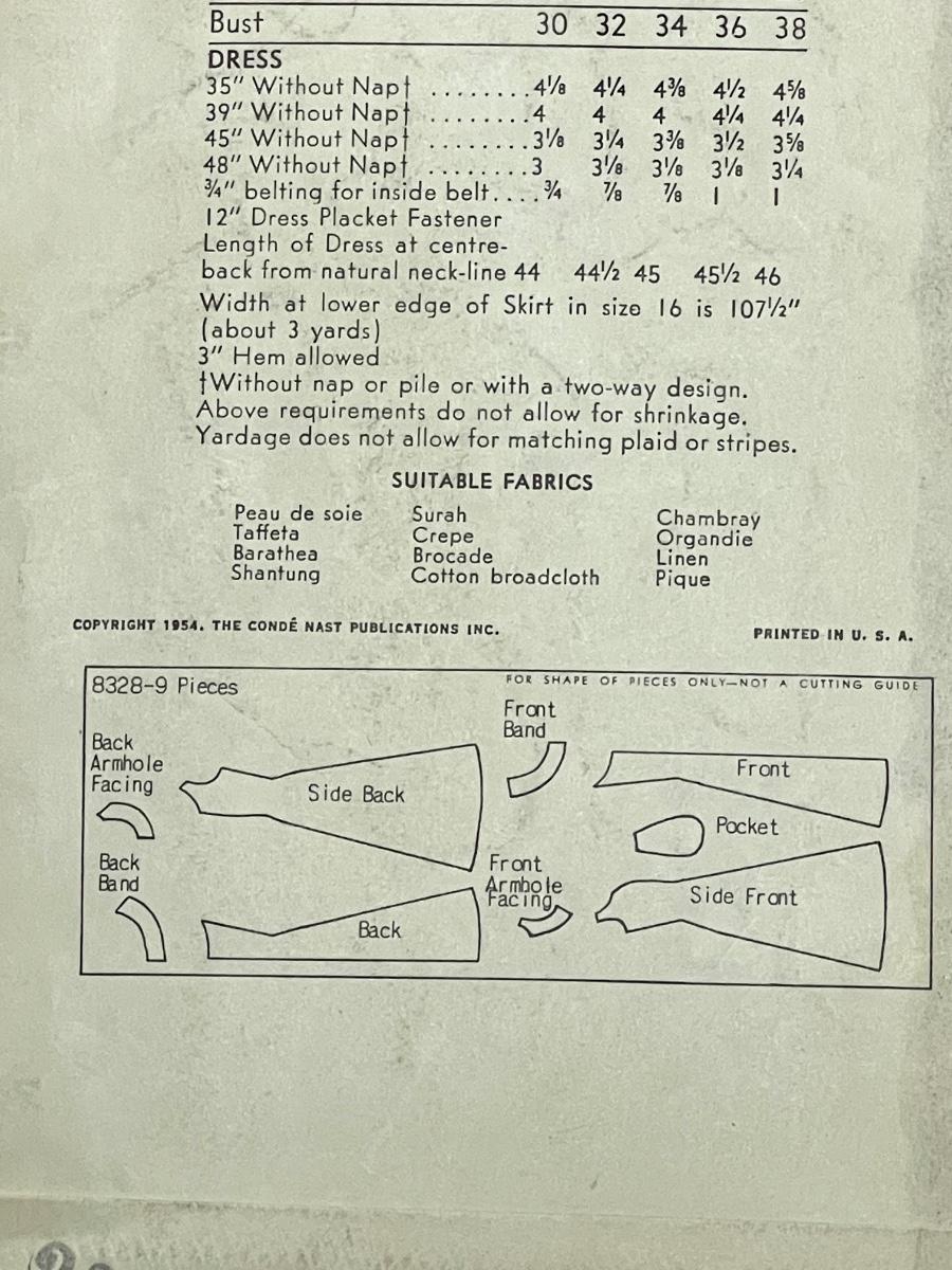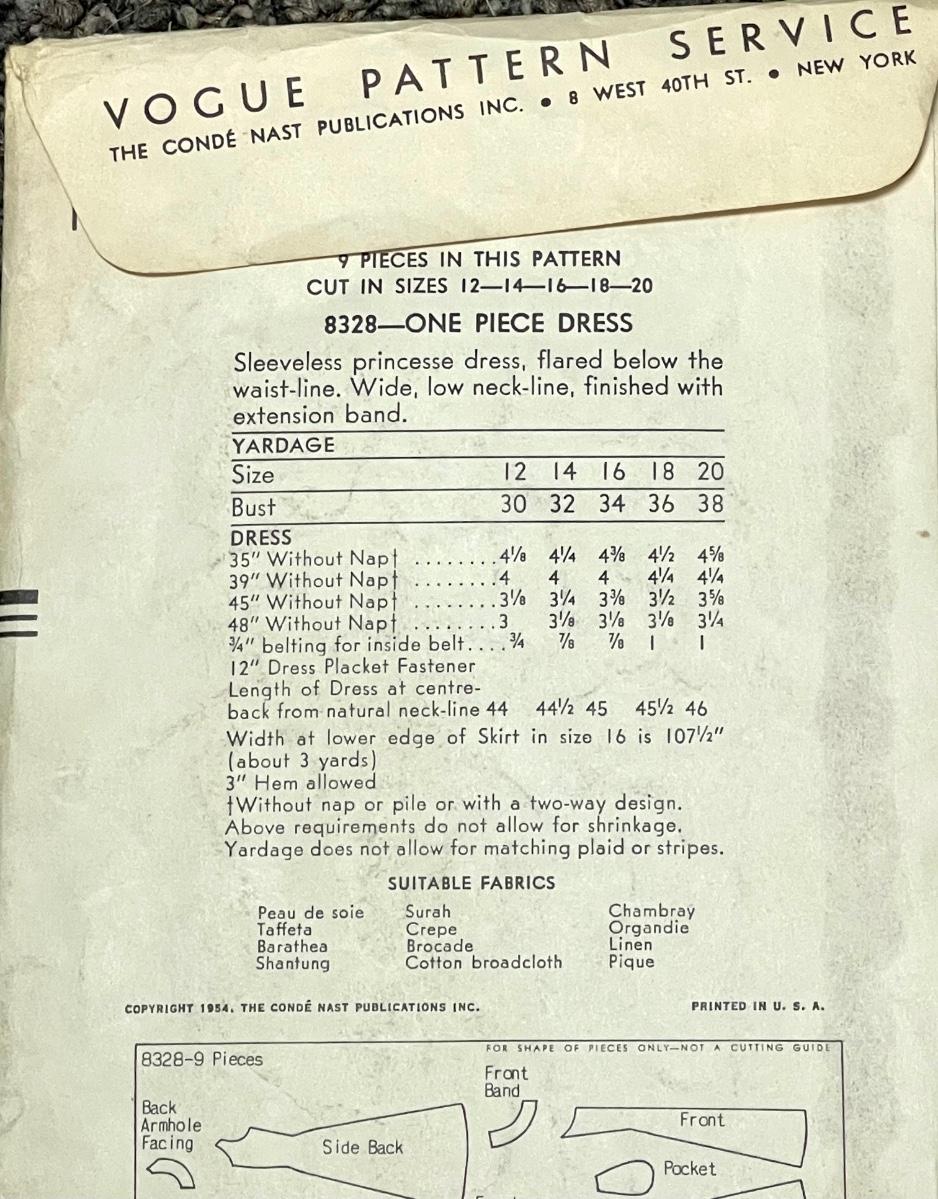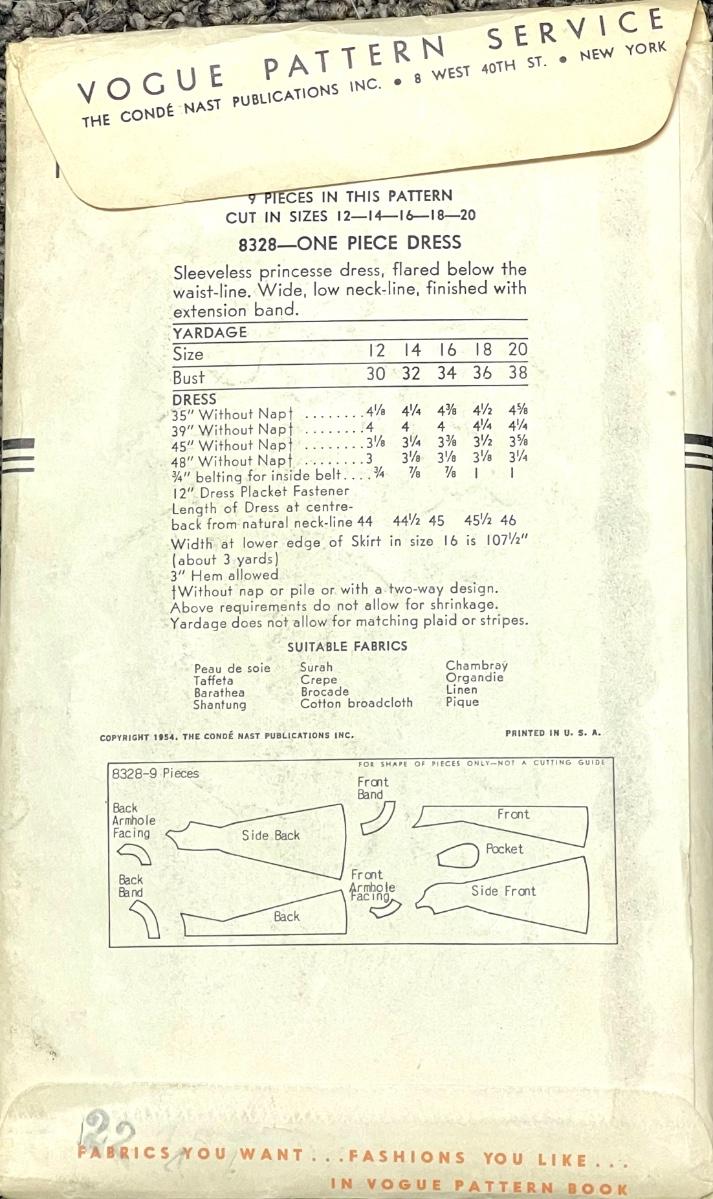Vogue Pattern No. 8328 size 12 bust 30 hip 33 1954. All pieces verified.