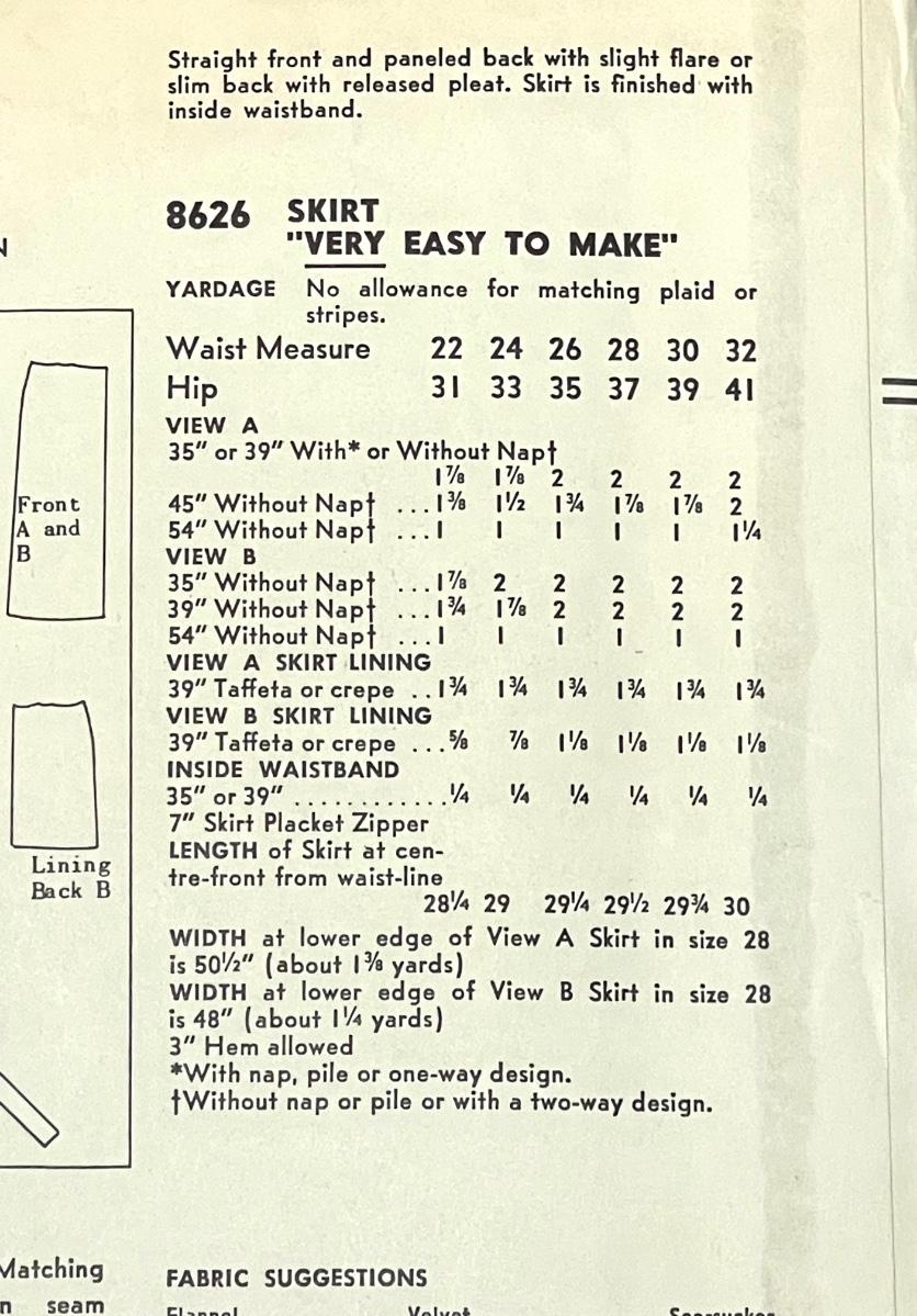 Vogue Pattern No. 8626 waist 24 hip 33 1955. All pieces verified.