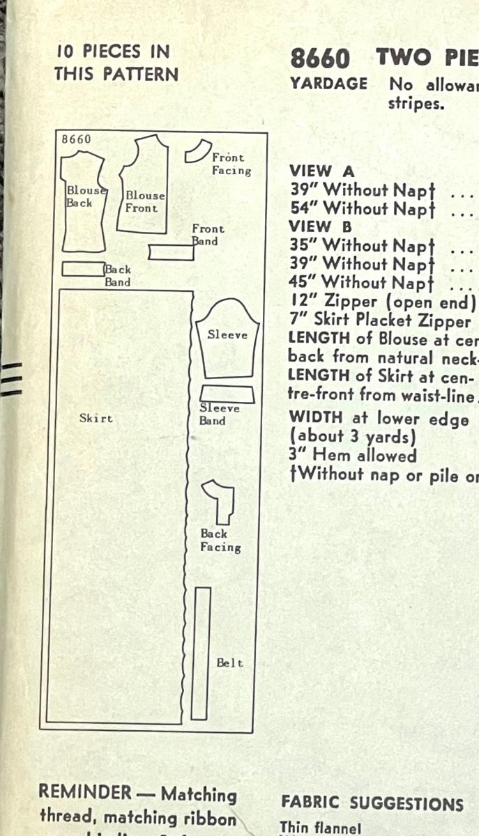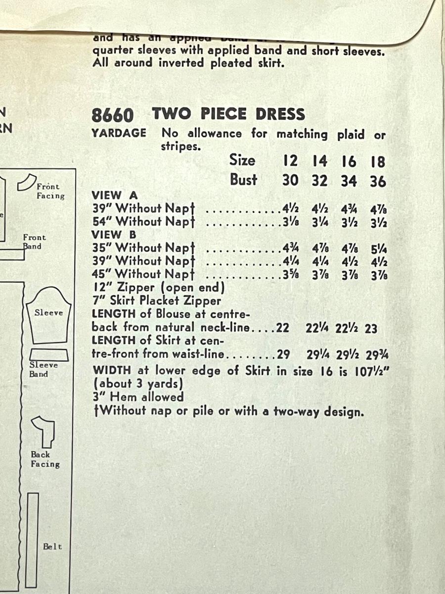 Vogue Pattern No. 8660 size 12 bust 30 hip 33 1955. All pieces verified.