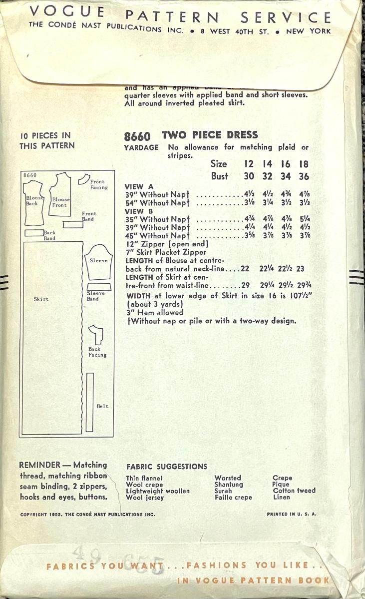 Vogue Pattern No. 8660 size 12 bust 30 hip 33 1955