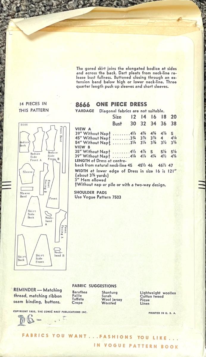 Vogue Pattern No. 8666 size 12 bust 30 hip 33 1955. All pieces verified.