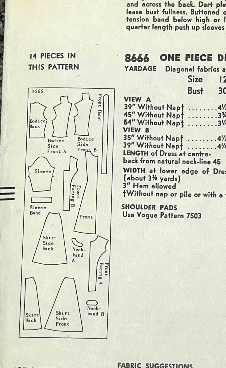 Vogue Pattern No. 8666 size 12 bust 30 hip 33 1955. All pieces verified.