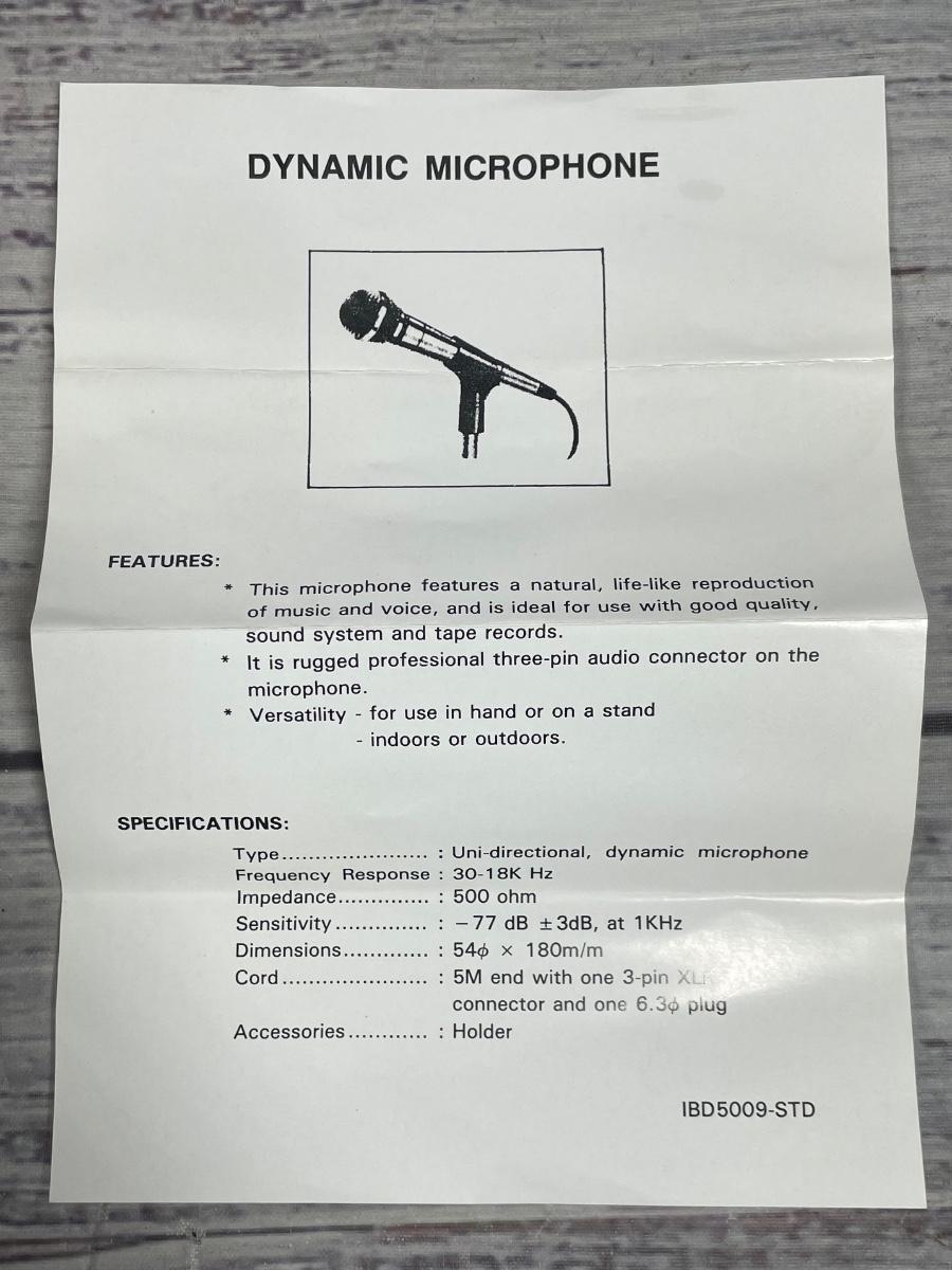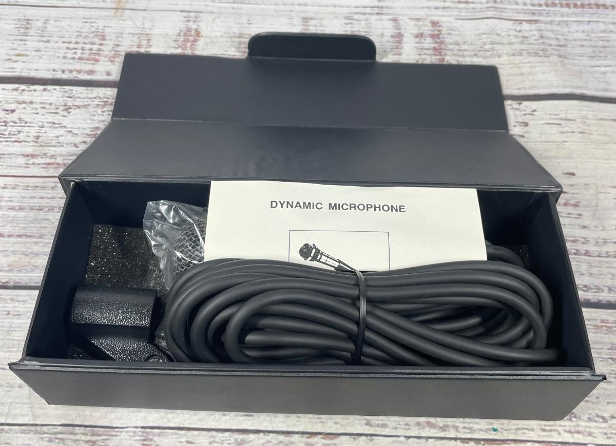 This box comes with a uni-directional microphone, a cord, a holder, and an information sheet. All items are in good condition and the microphone comes wrapped. This item is not tested to see if it works. The front of the box is has some sticky residue on it.