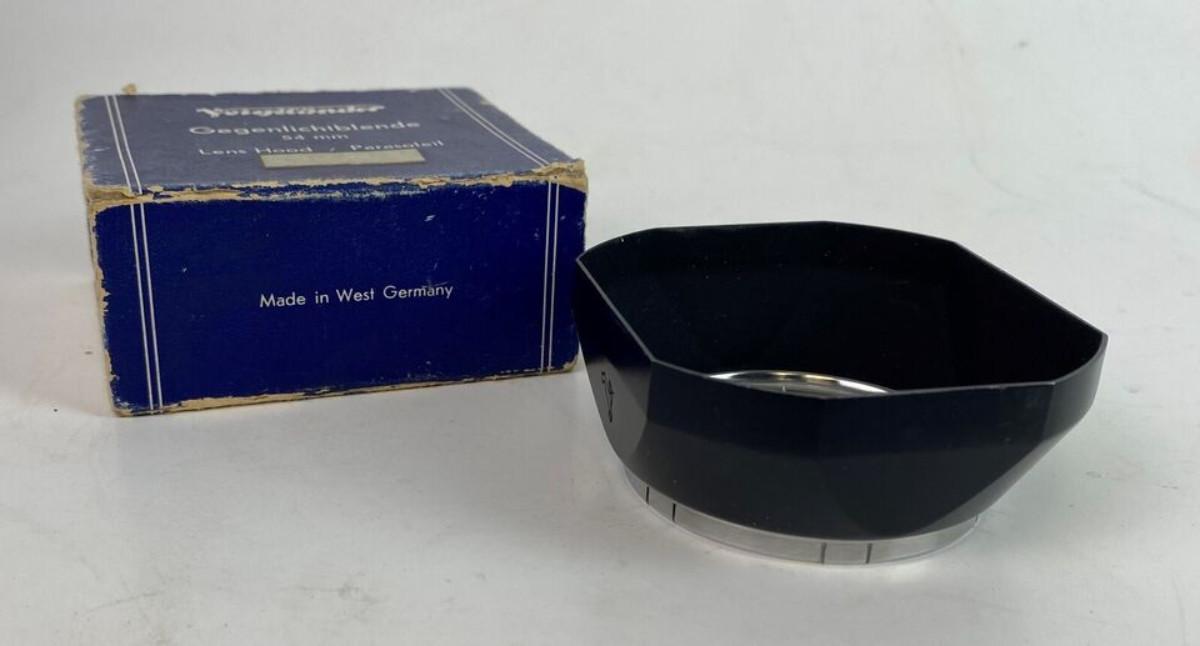 With very slight use here is a Voigtländer push-on metal lens hood..310/54 54mm found in the original box...the type of hood found with a Voigtländer Ultramatic circa 1962 or the like...original piece from Voigtländer & Sohn of Braunschweig in then West Germany.