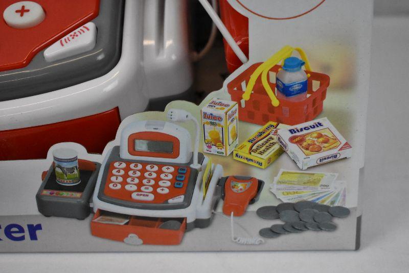 Vokodo Toy Cash Register With Microphone Calculator Grocery Items Shopping Basket Scanner And Pretend Play Money Kids Supermarket Cashier Bank - New
