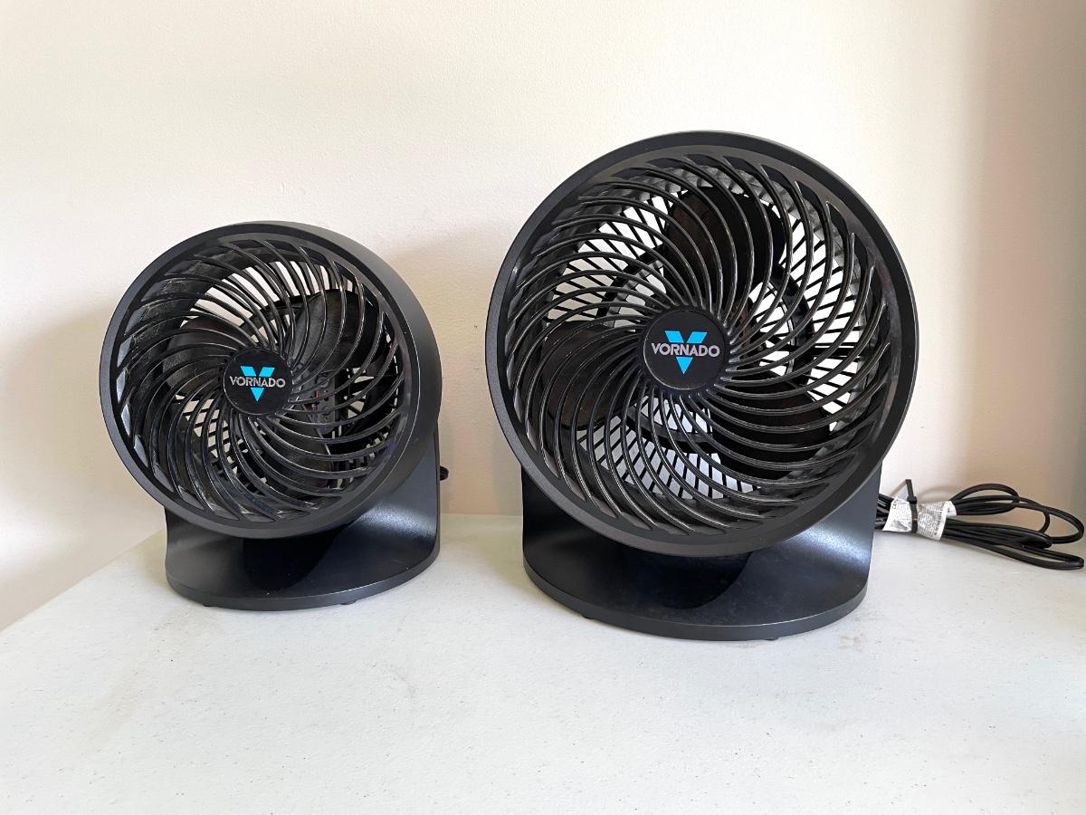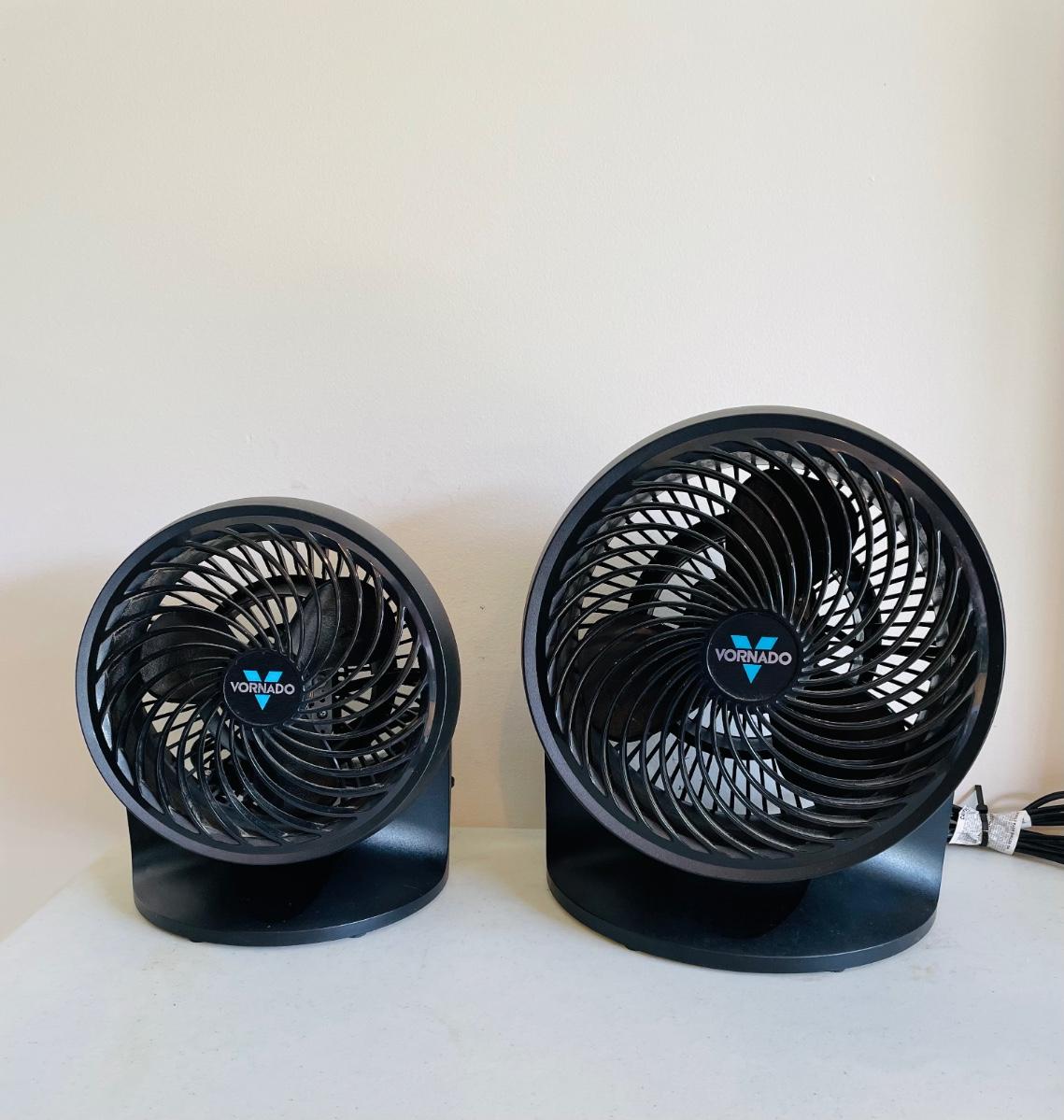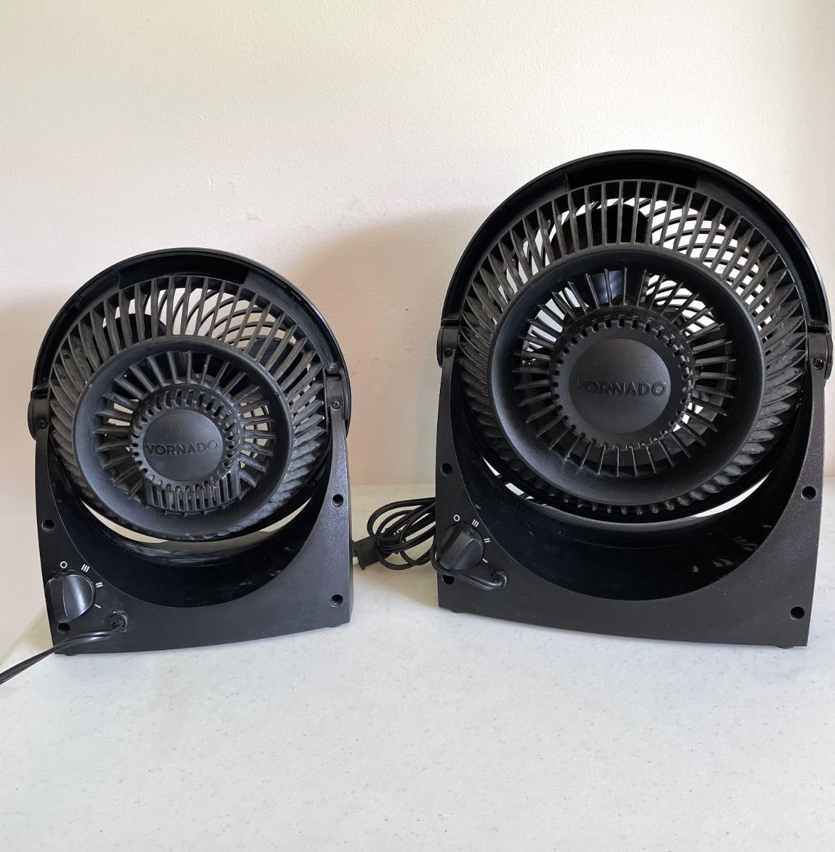 Pair of VORNODO Fans compact air circulator Largest fan measures 14 inches tall and 11 inches wide. Smaller 11 inches tall and 9 inches wide.